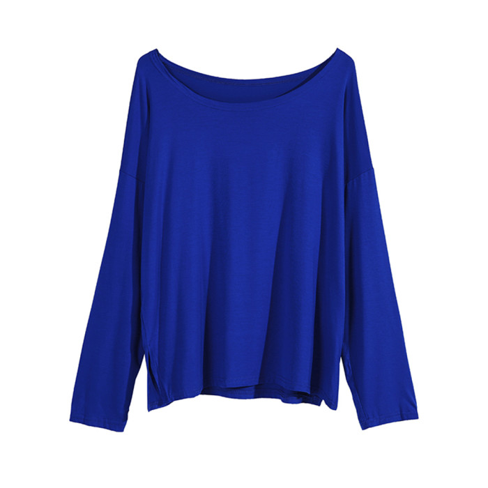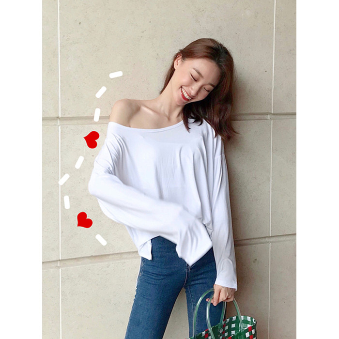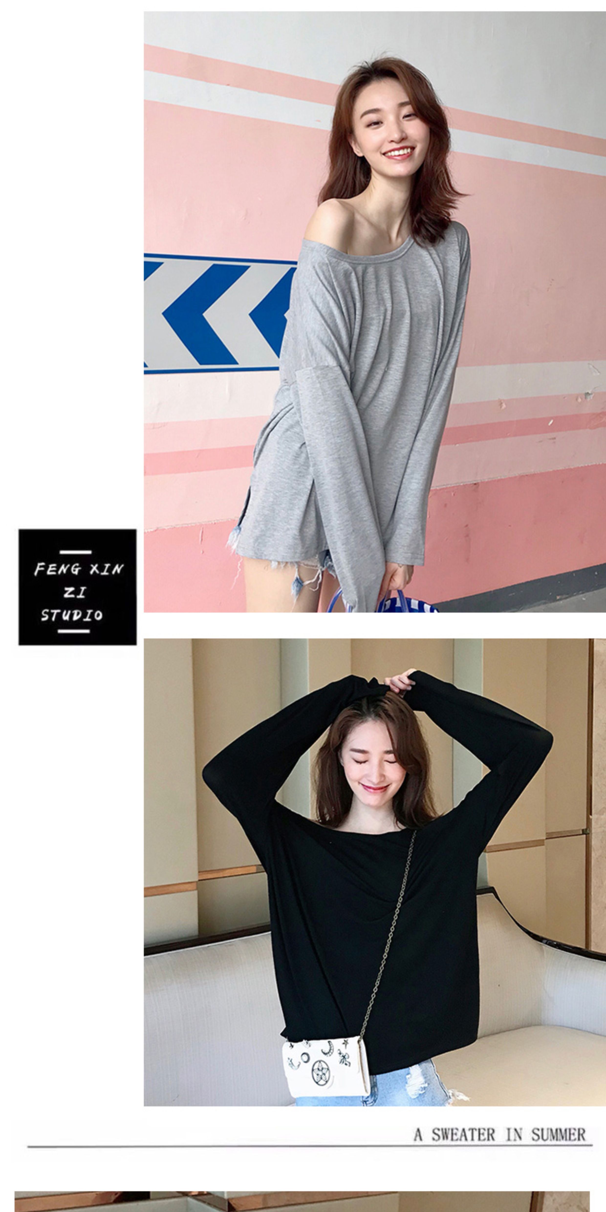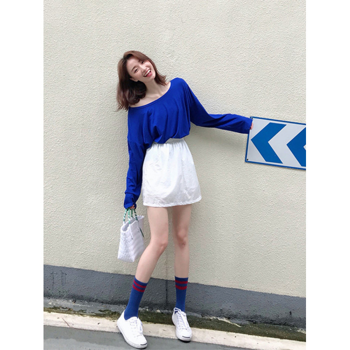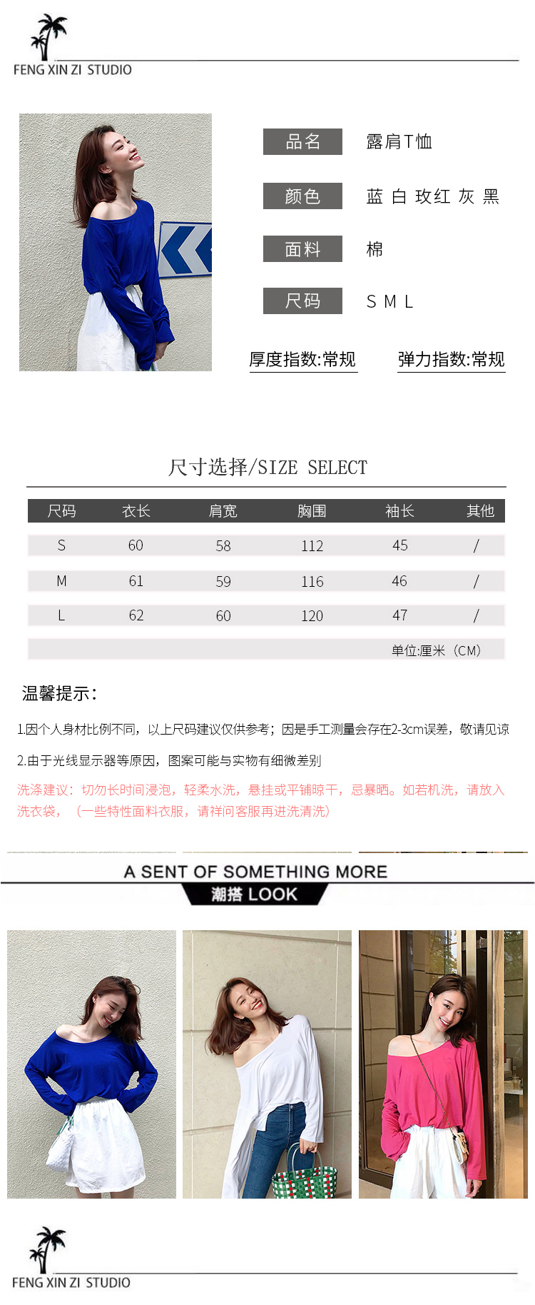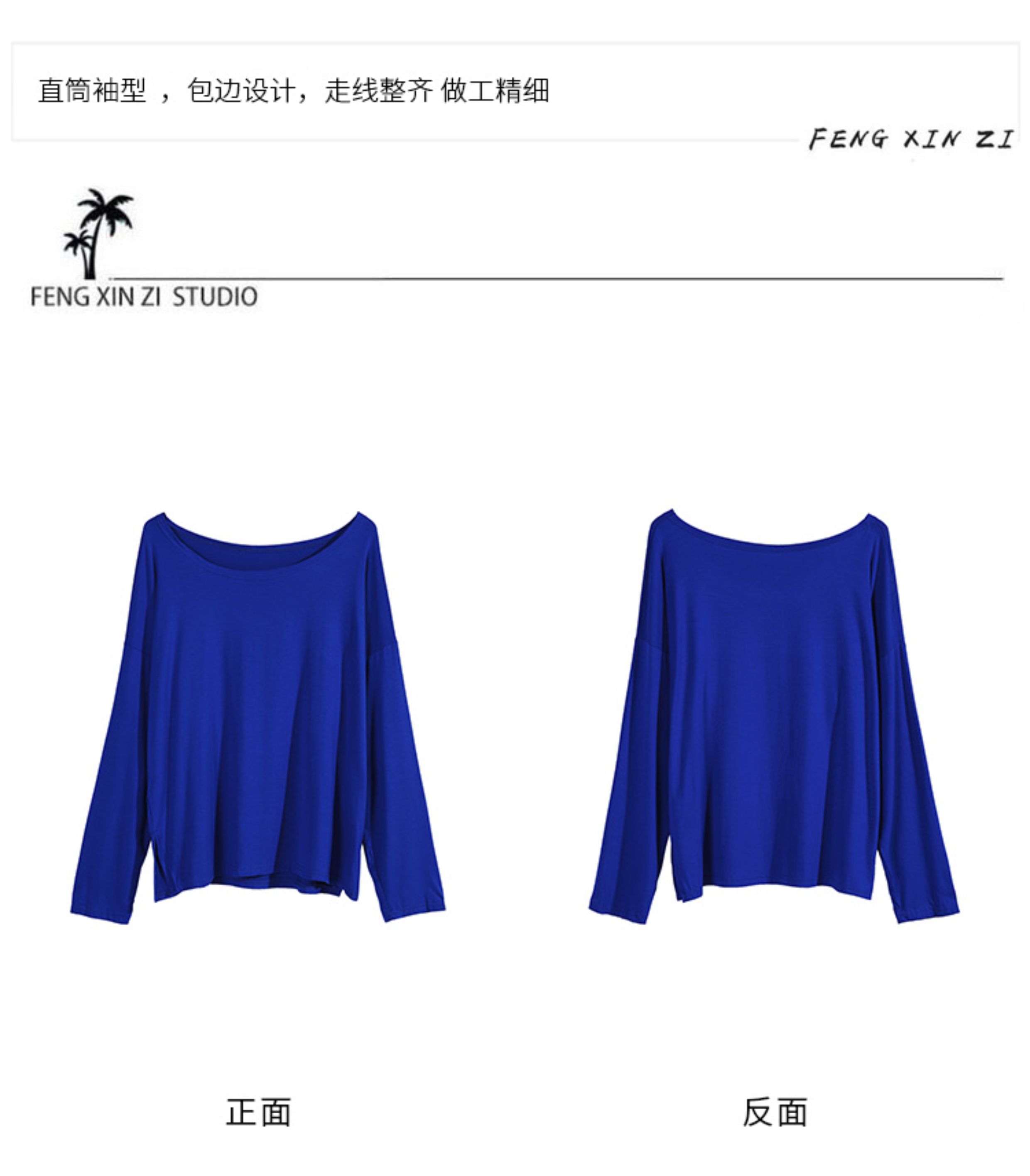設計感克萊因藍t恤女露肩長袖莫代爾一字大領口寶藍斜肩上衣寬松