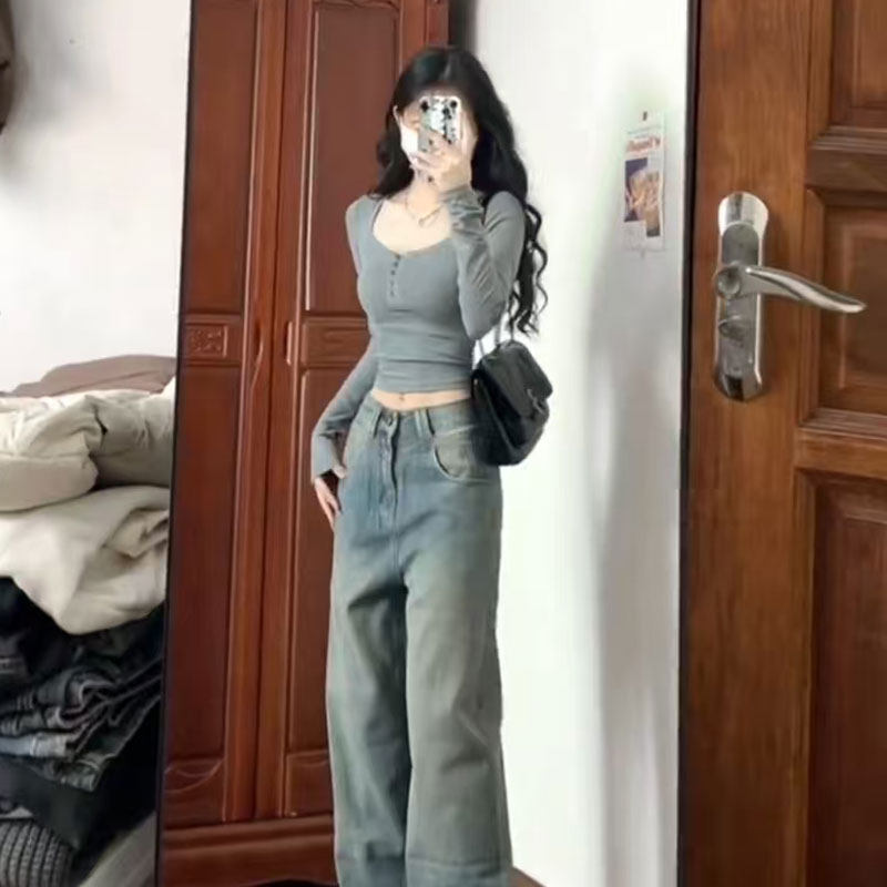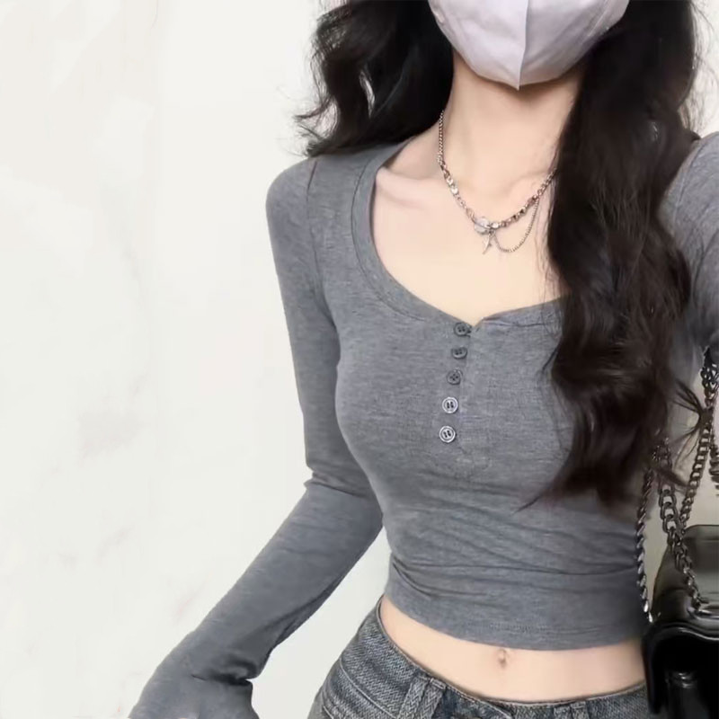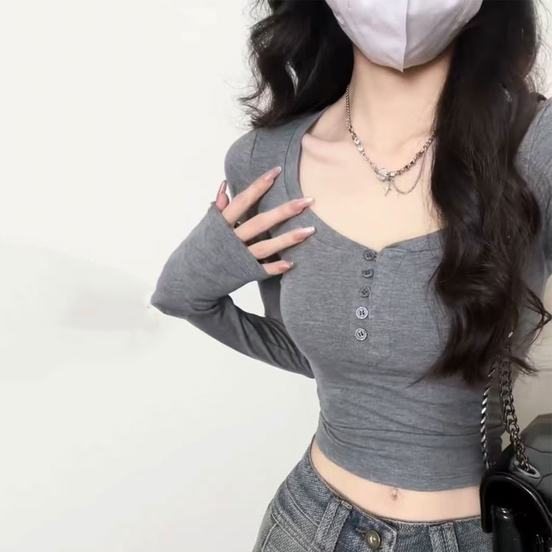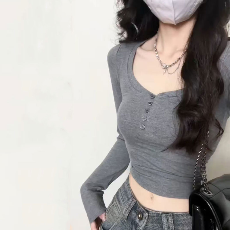 設計感小衆純棉v領長袖t恤女春秋內搭短款打底衫辣妹修身顯瘦上衣