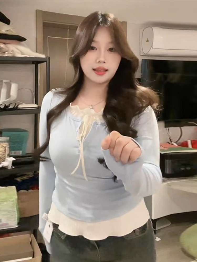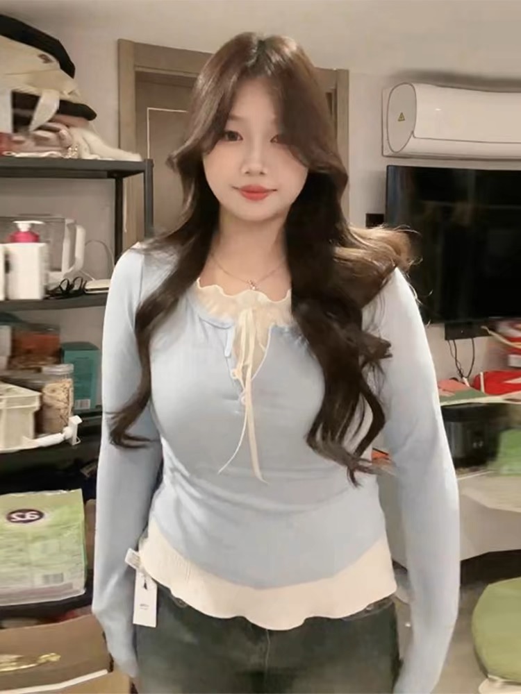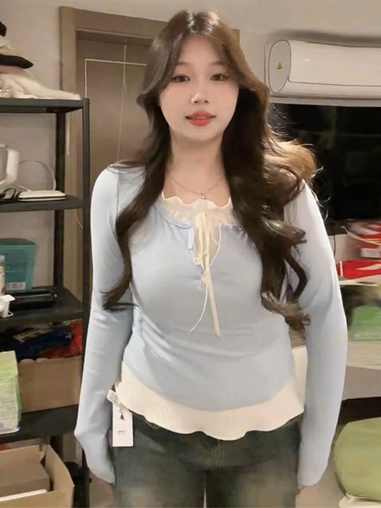 大碼mm甜美風減齡假兩件上衣女春季顯瘦百搭休閒通勤打底衫T恤潮
