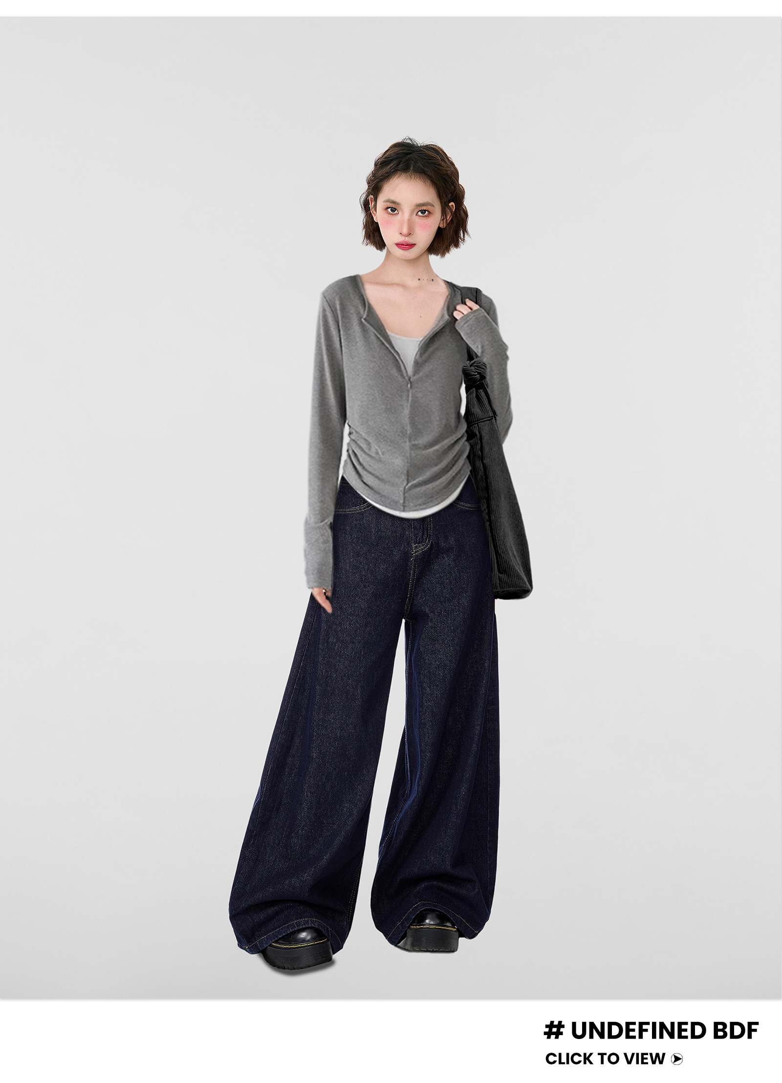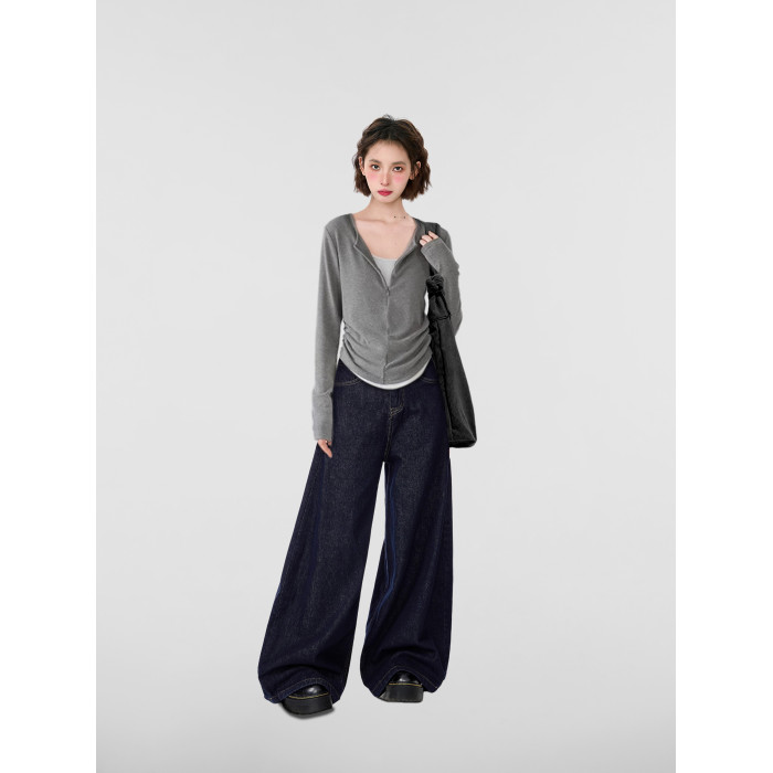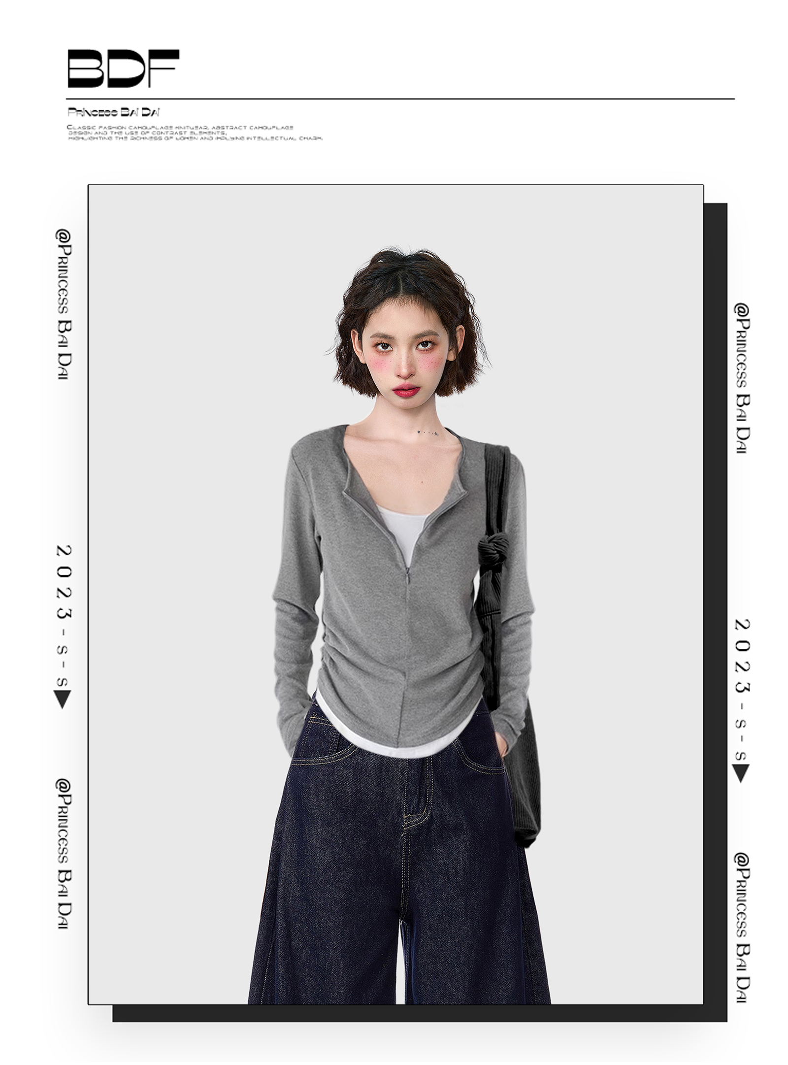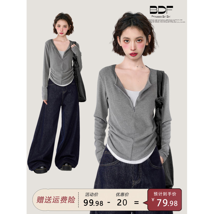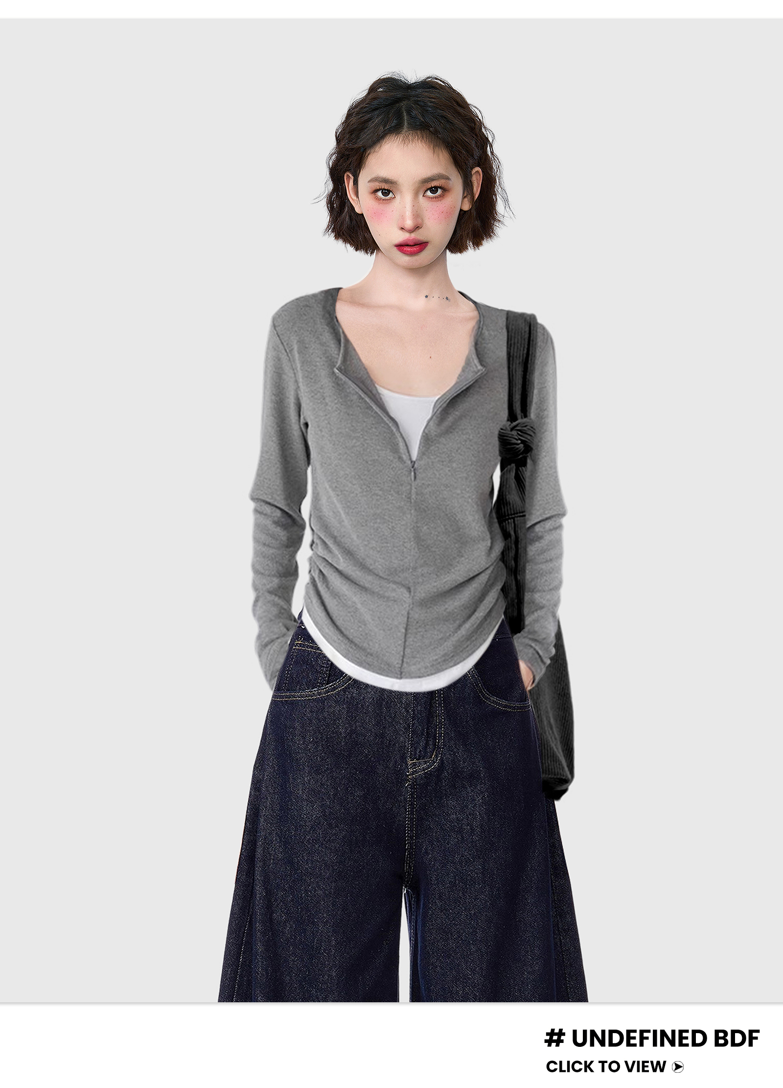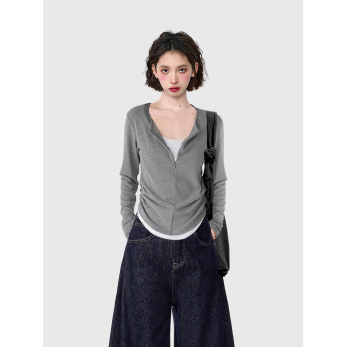 灰色假兩件v領長袖t恤女春秋早秋季修身內搭不規則打底衫短款上衣