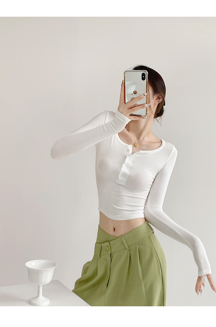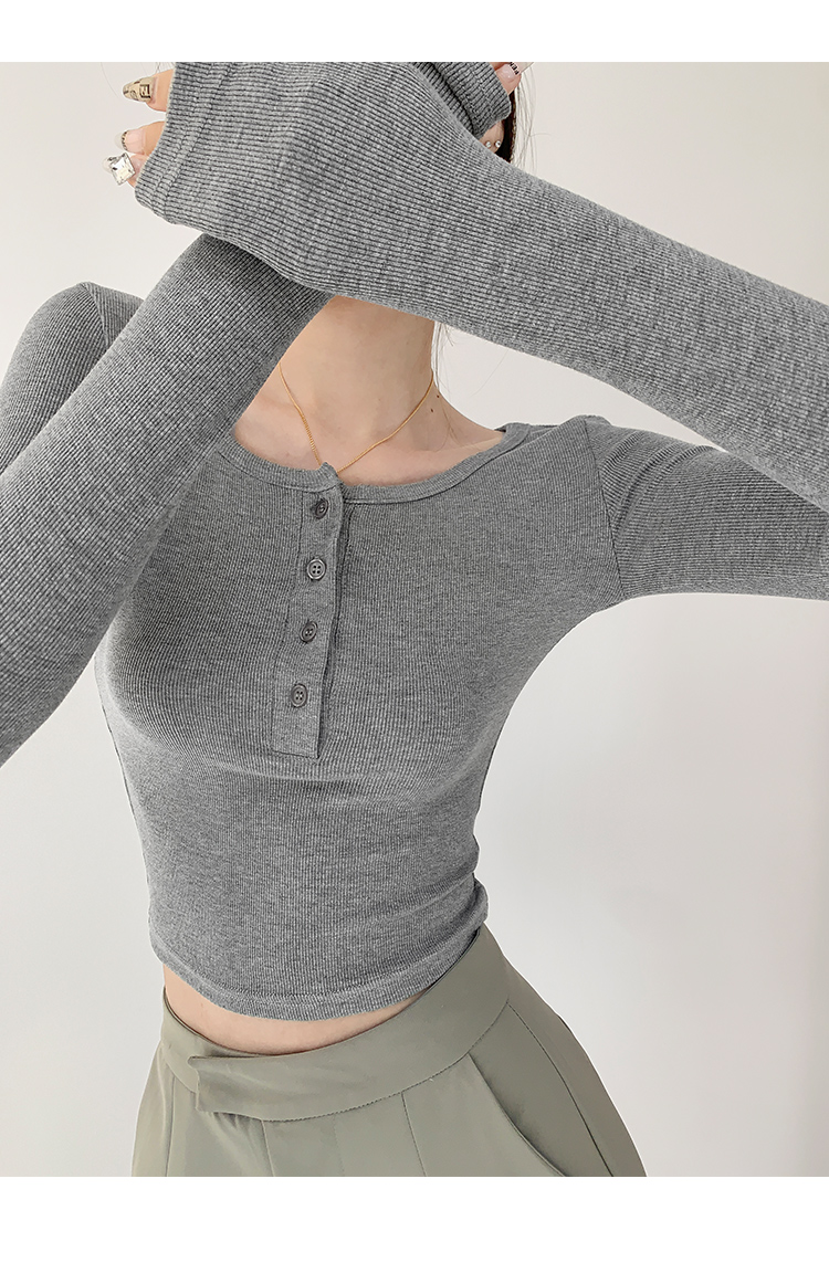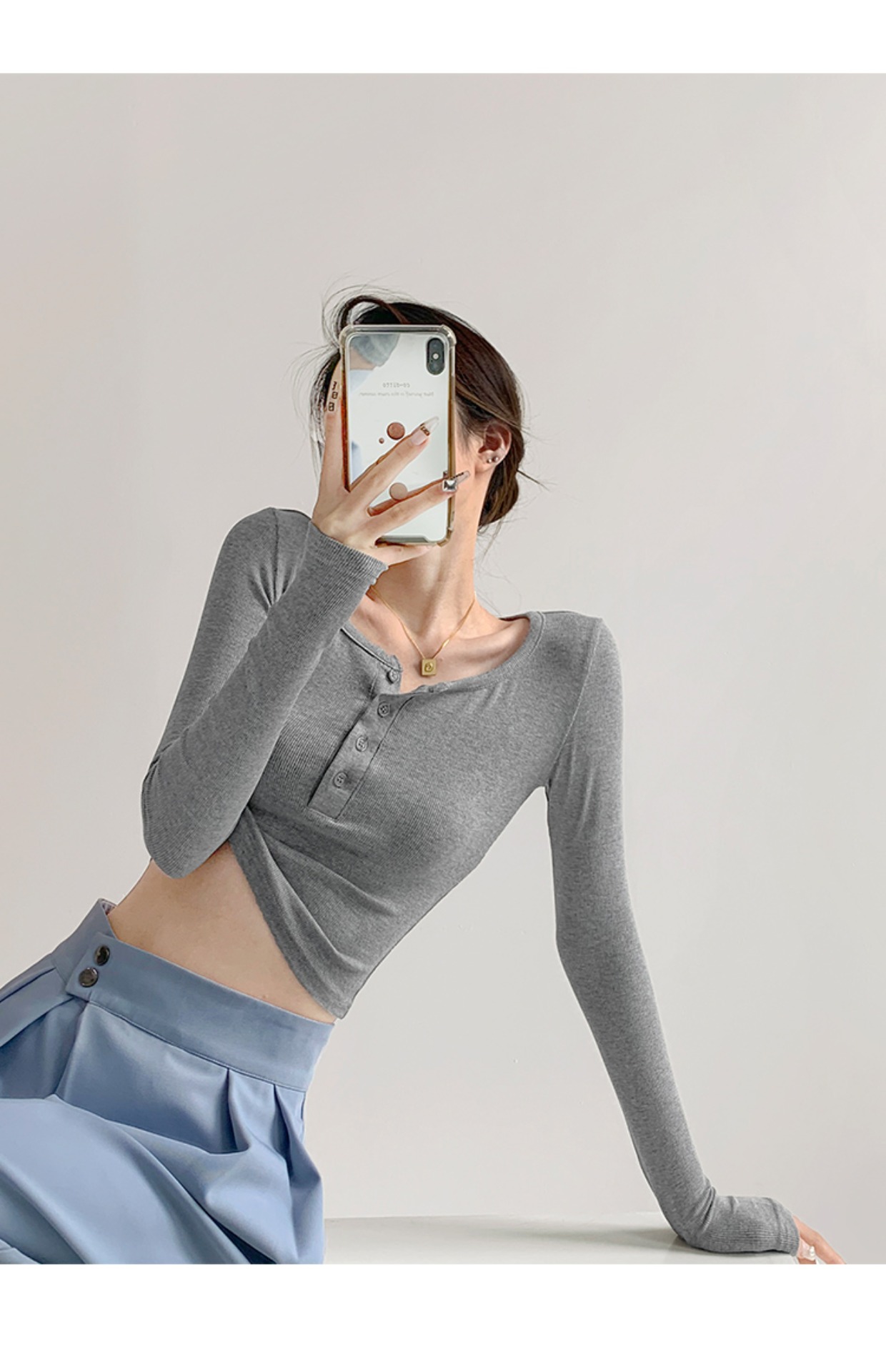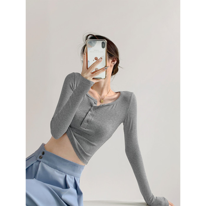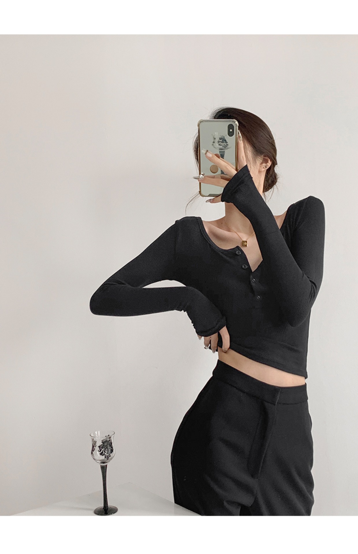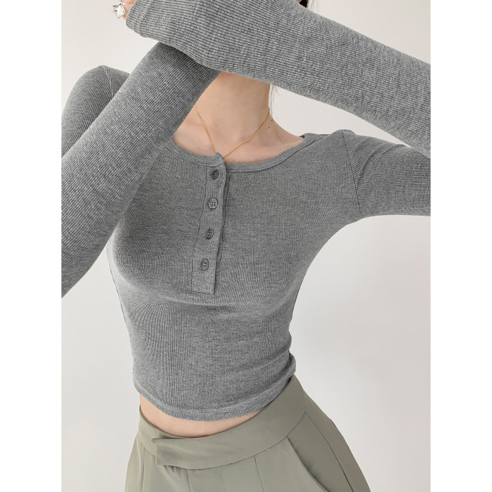 純欲風圓領單排釦長袖T恤女辣妹緊身短款上衣純色打底衫春秋冬