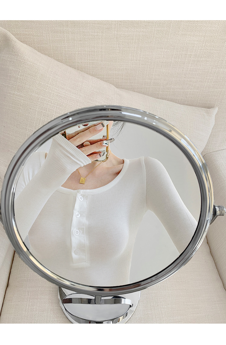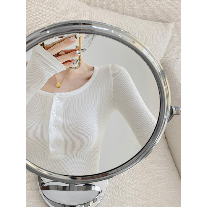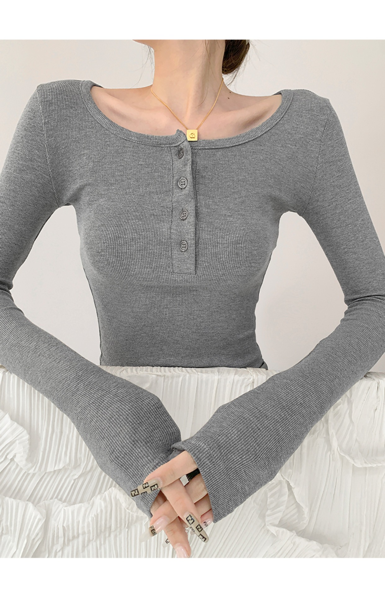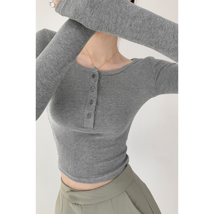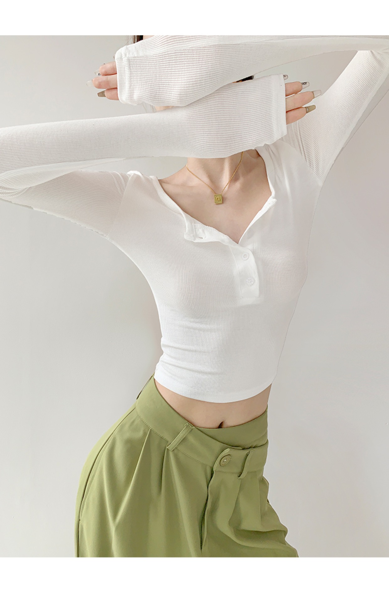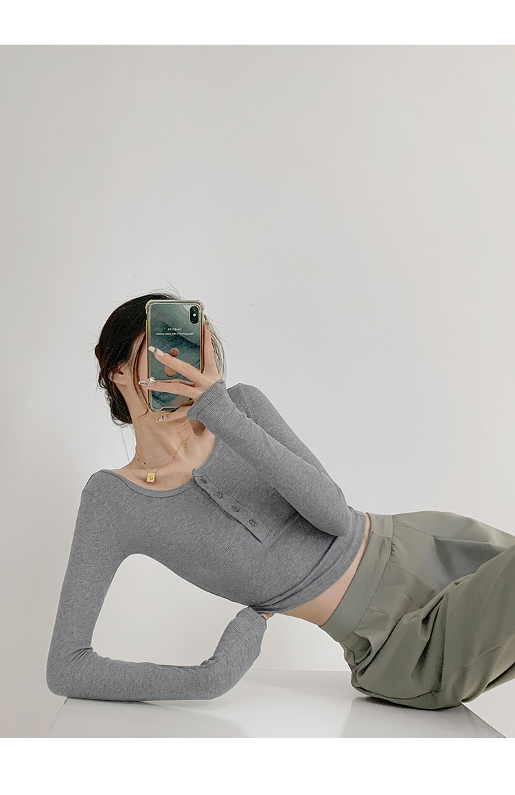 純欲風圓領單排釦長袖T恤女辣妹緊身短款上衣純色打底衫春秋冬