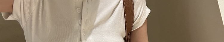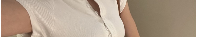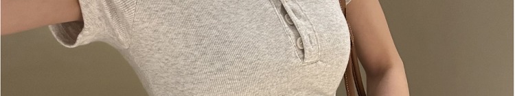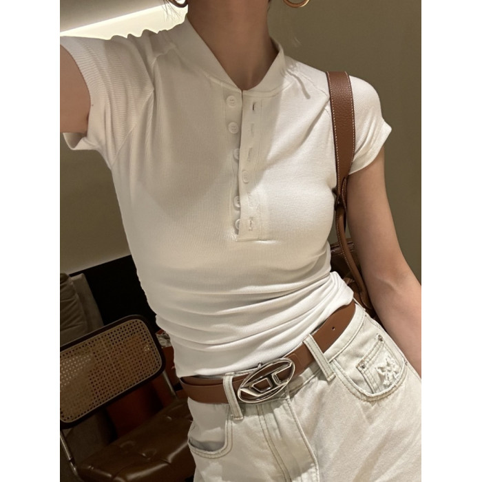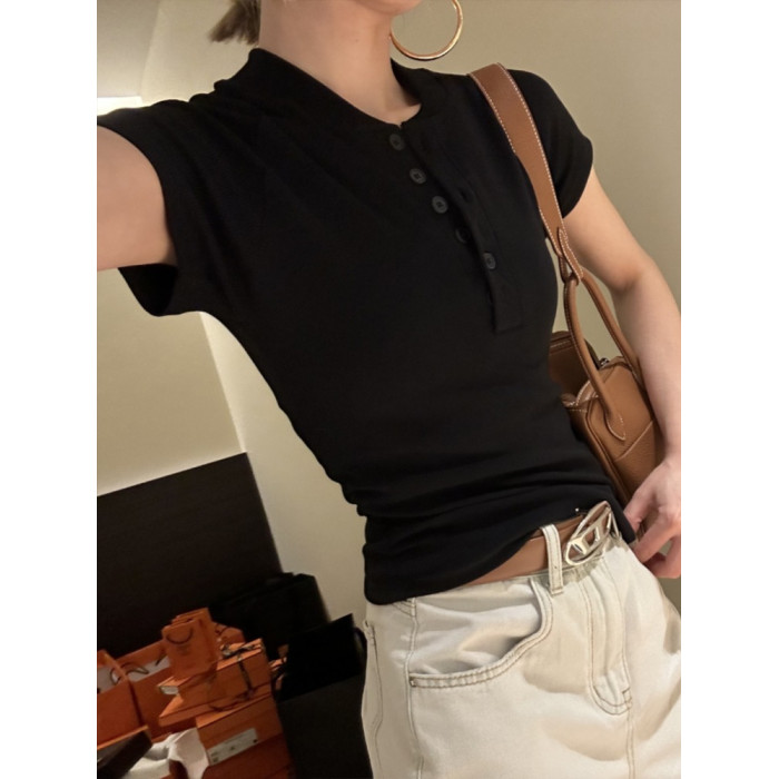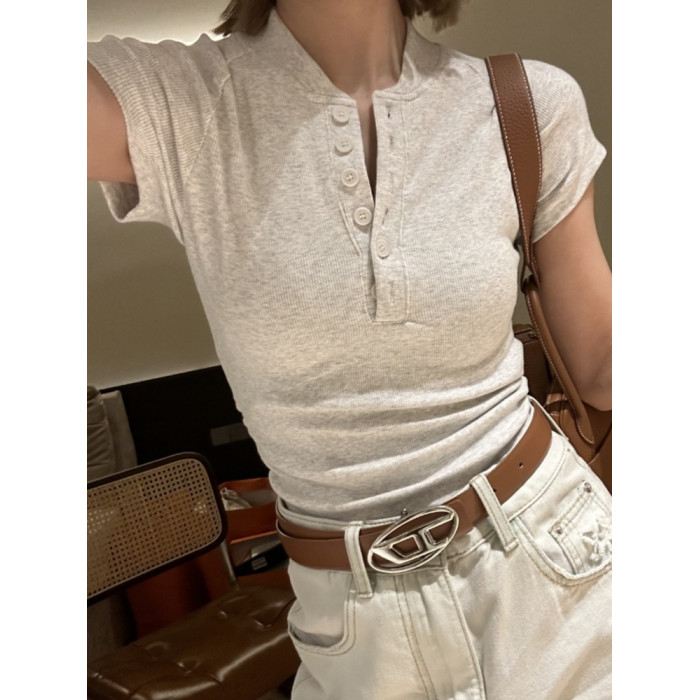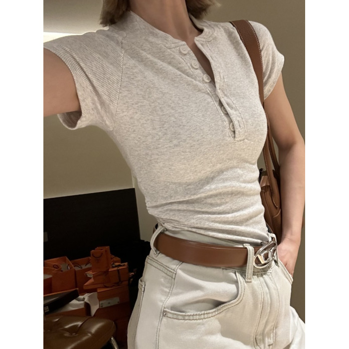 美式辣妹v領單排釦短袖T恤女夏修身顯瘦灰色螺紋休閒百搭正肩上衣