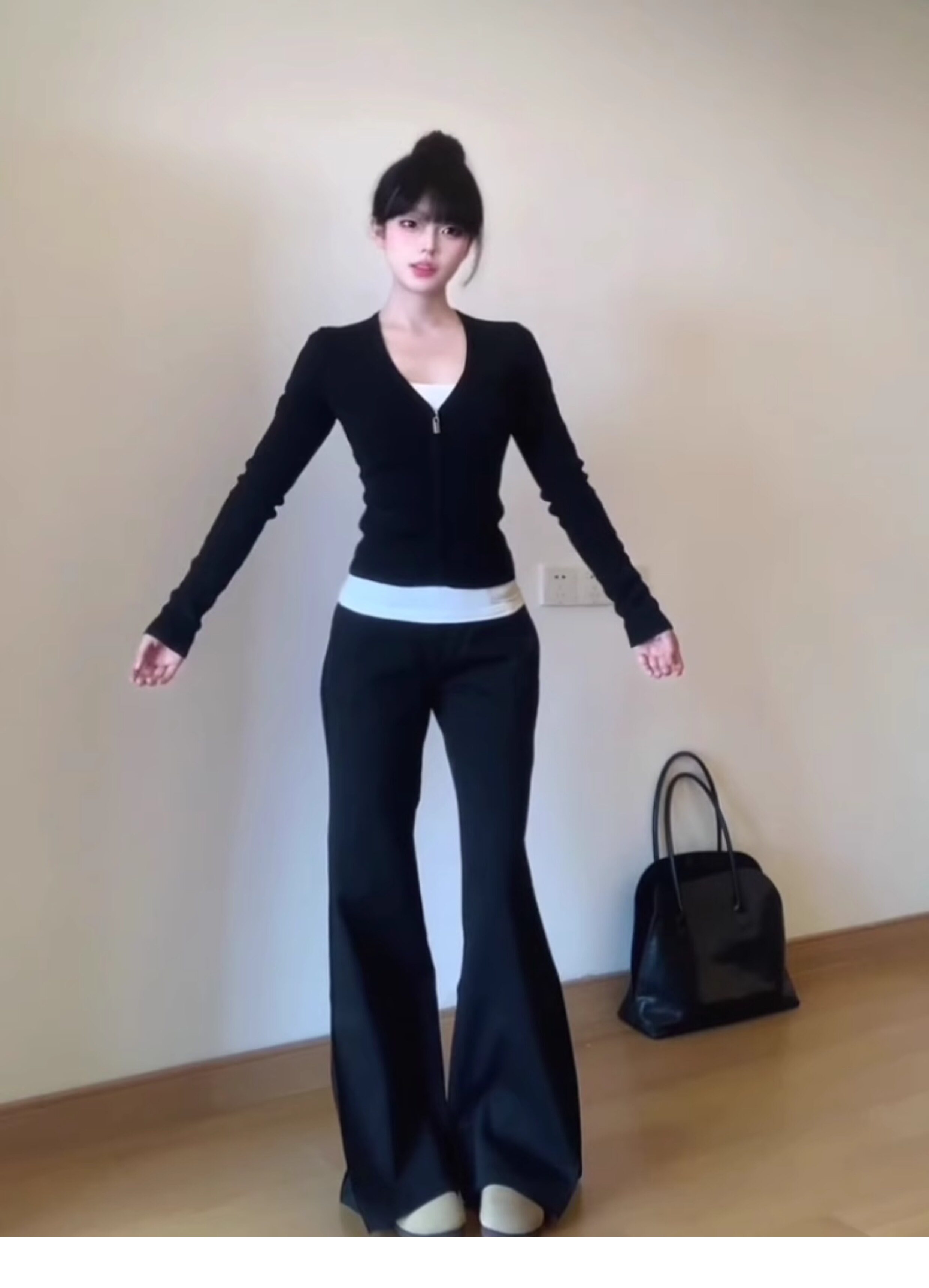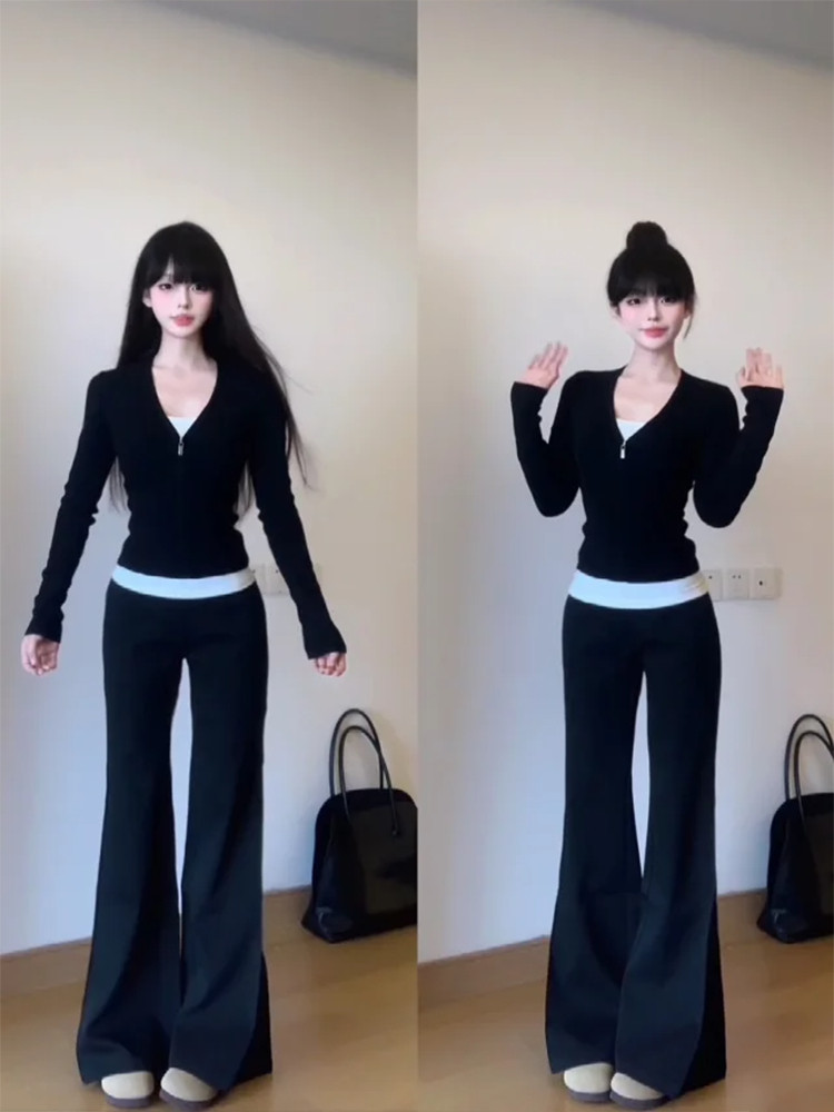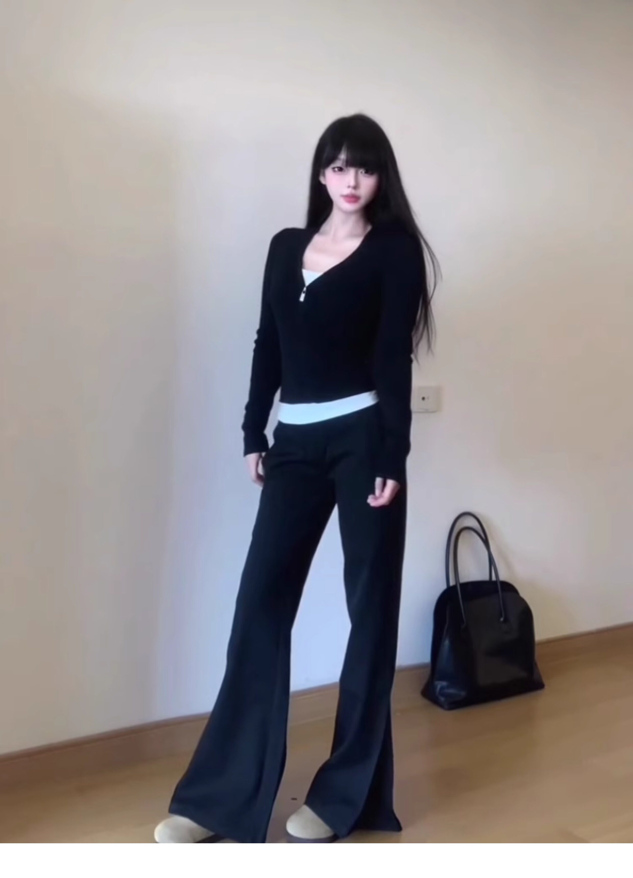韓系穿搭獨特黑色假兩件長袖T恤女裝秋季內搭V領修身打底衫小上衣