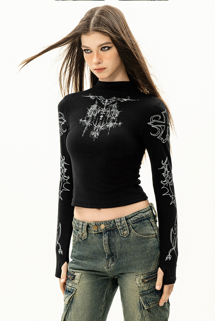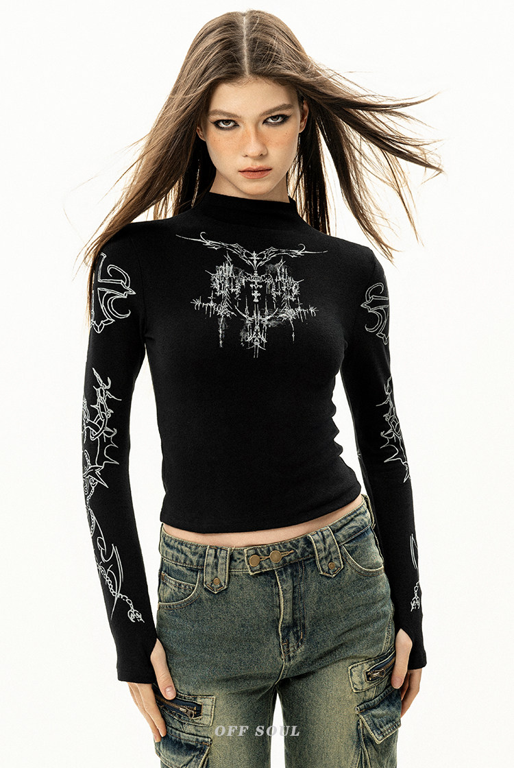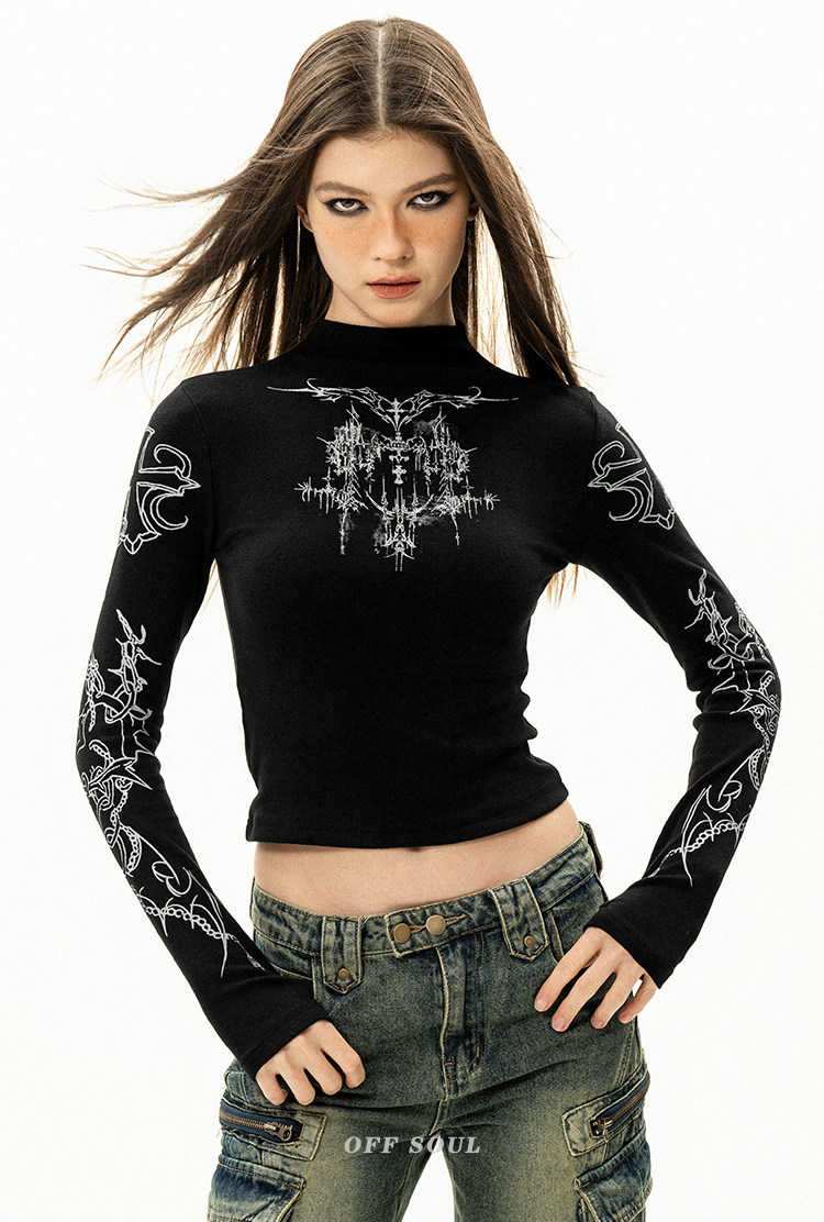 OFFSOUL原創歐美哥特風辣妹長袖T恤女秋冬美式復古磨毛絨打底上衣