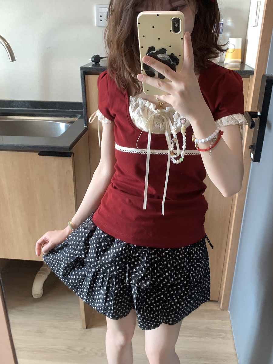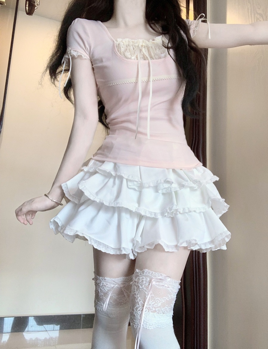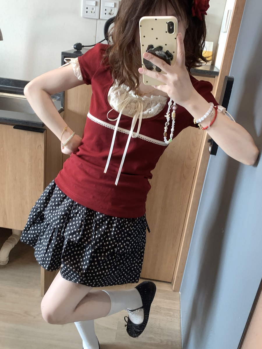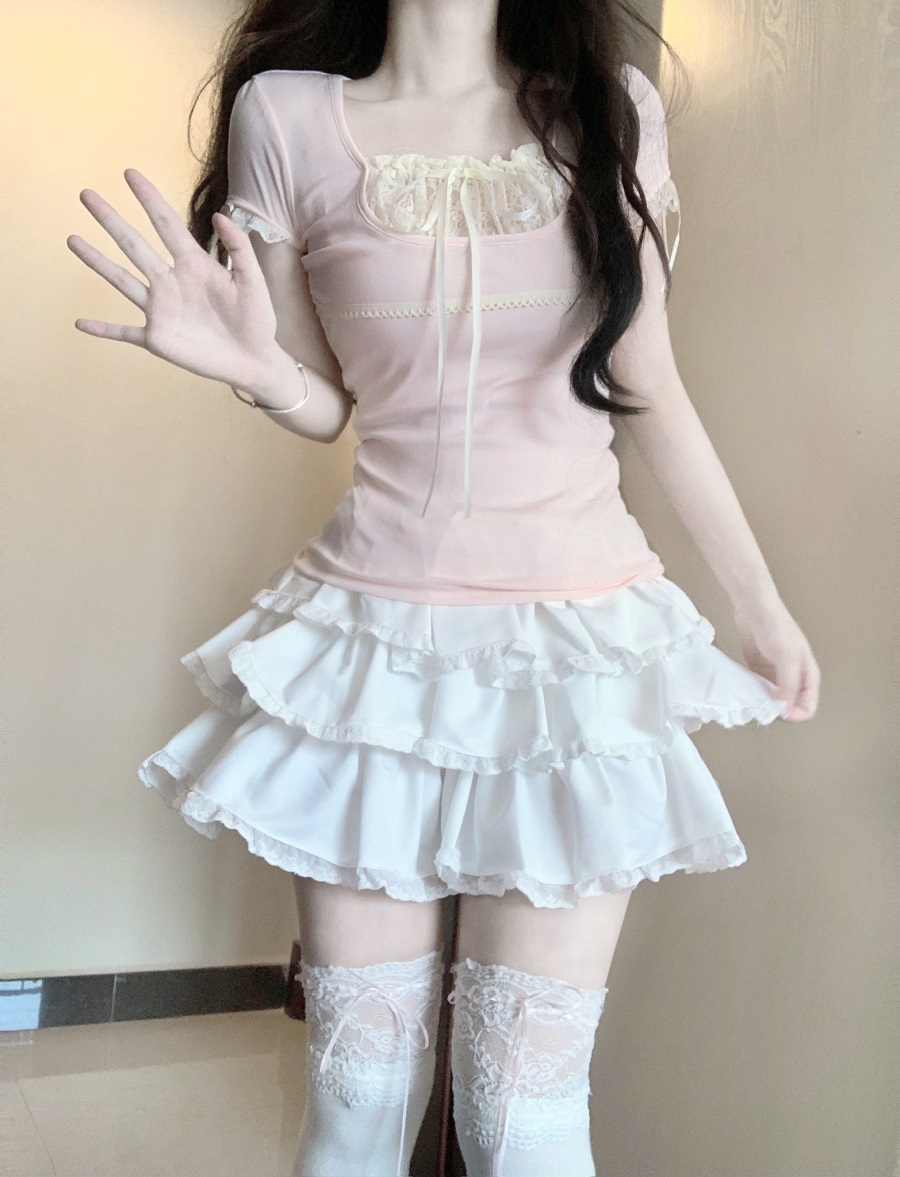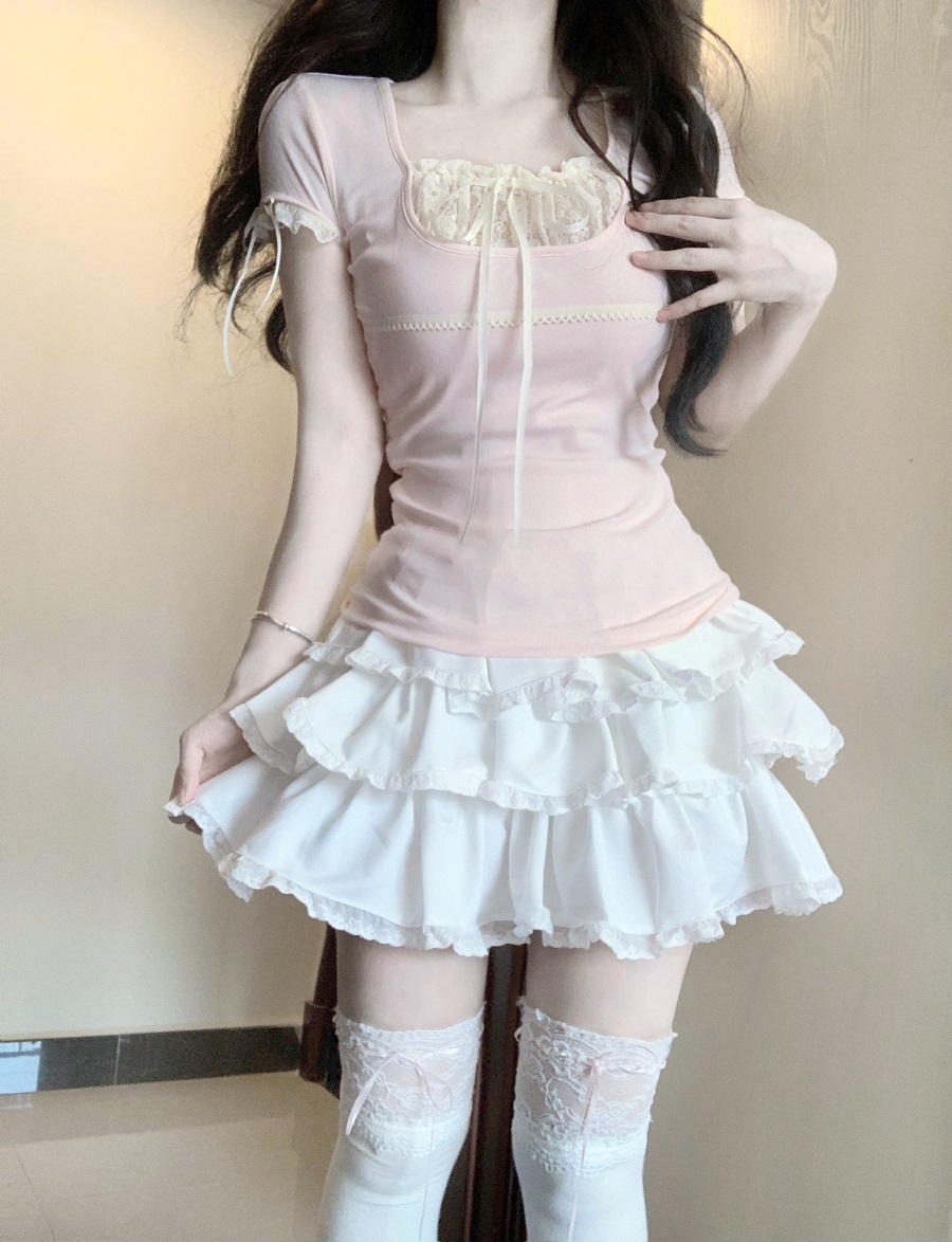 夏季新款顯瘦U領花邊芭蕾風T恤女設計感小衆甜妹短袖純棉上衣女