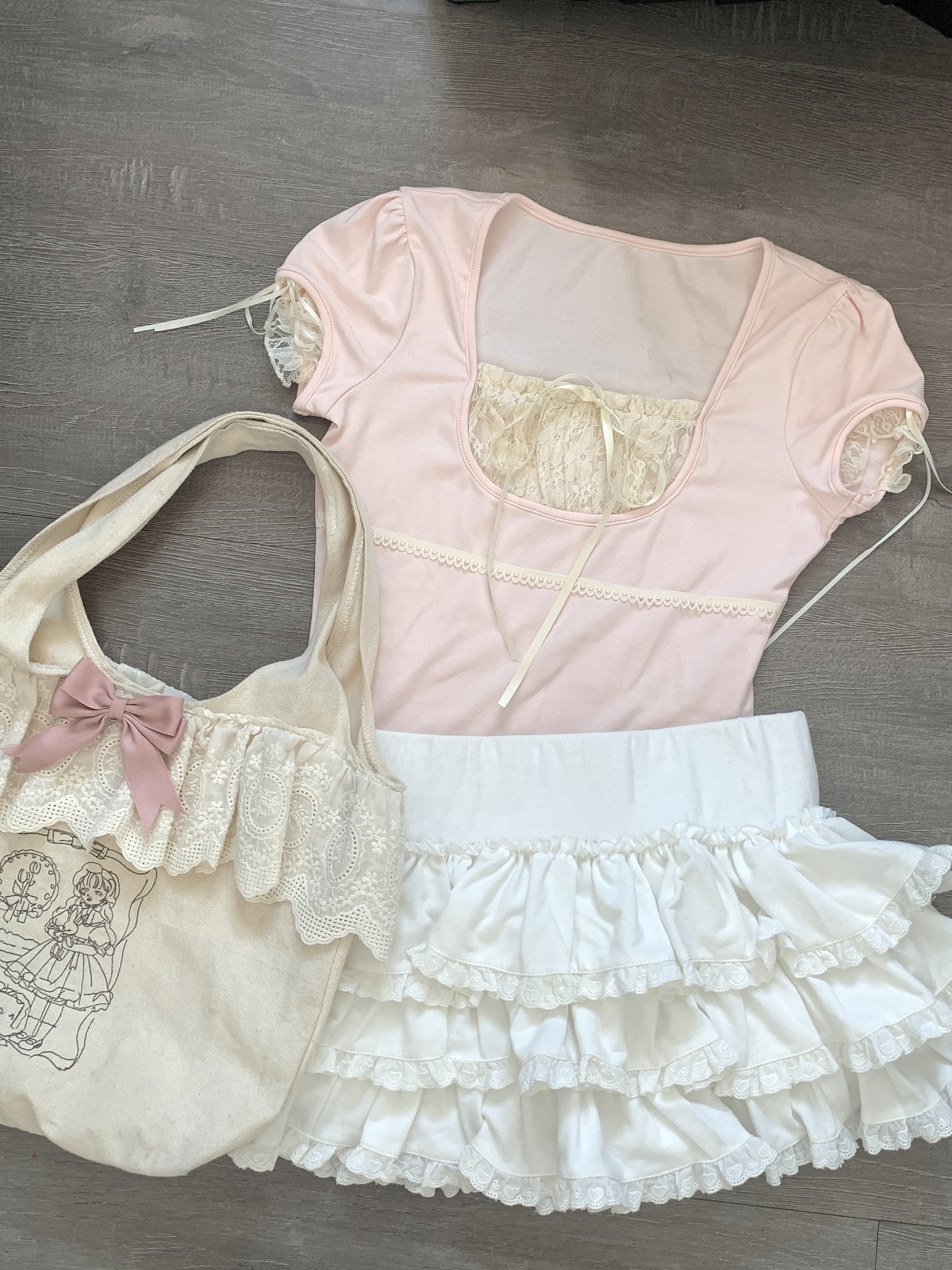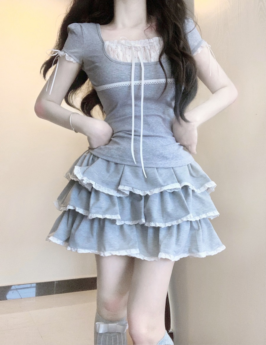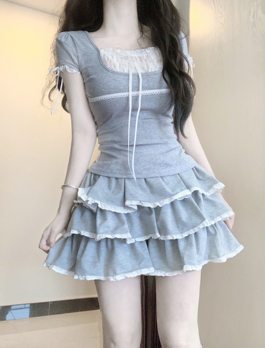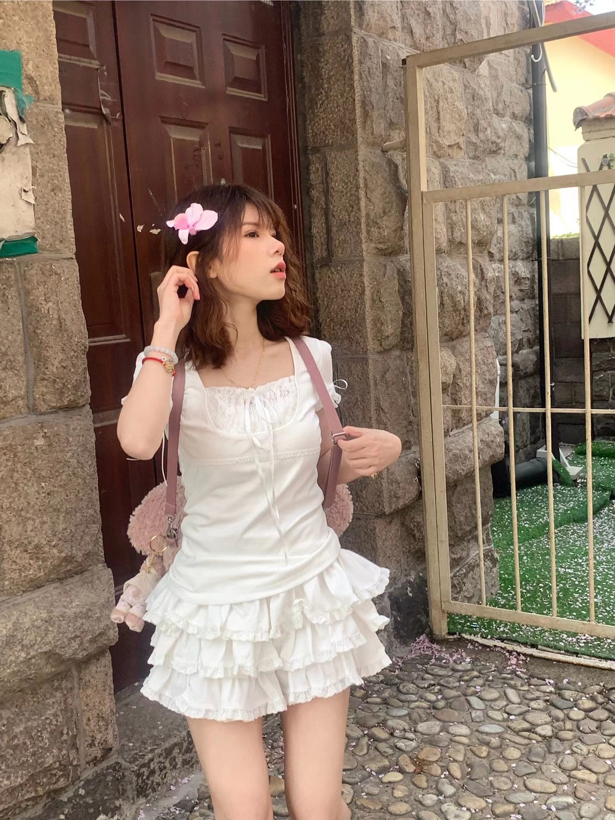 夏季新款顯瘦U領花邊芭蕾風T恤女設計感小衆甜妹短袖純棉上衣女