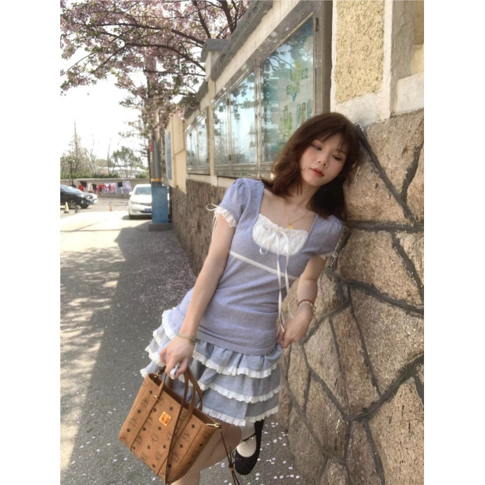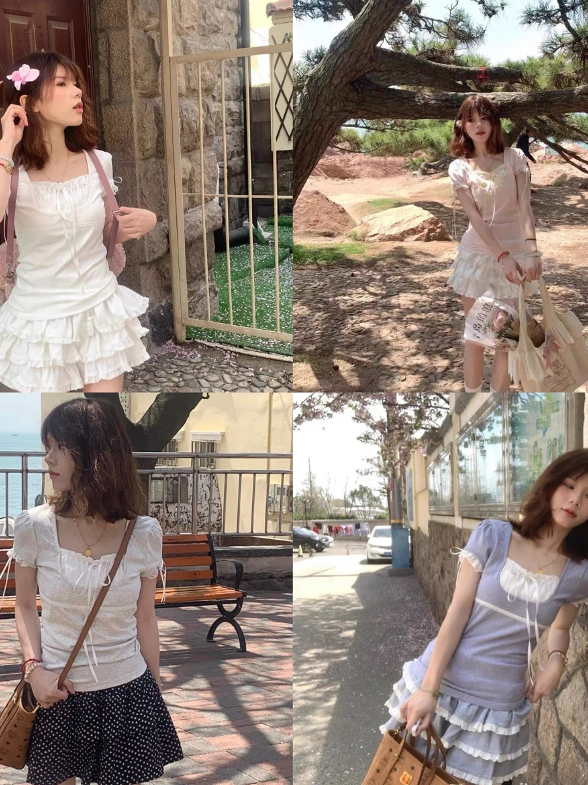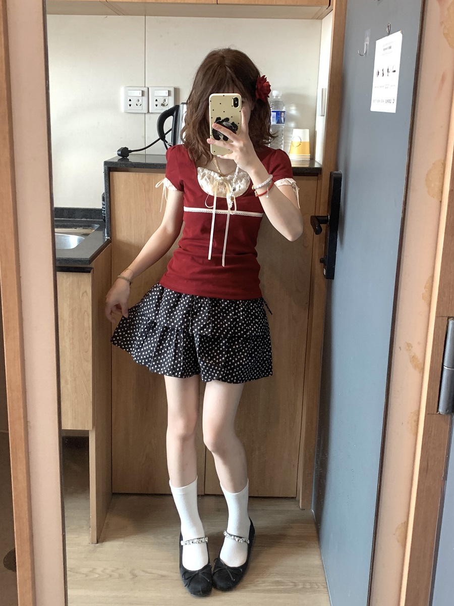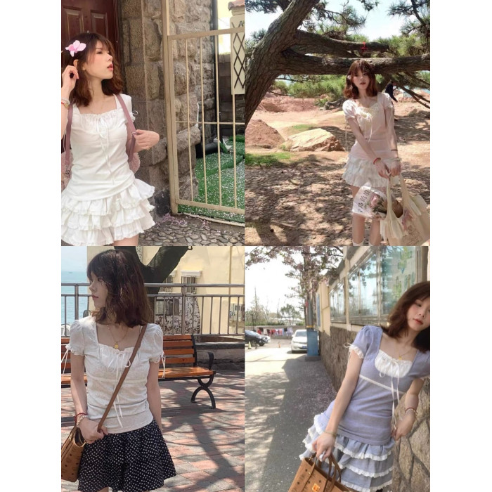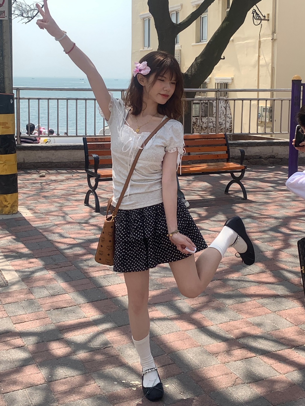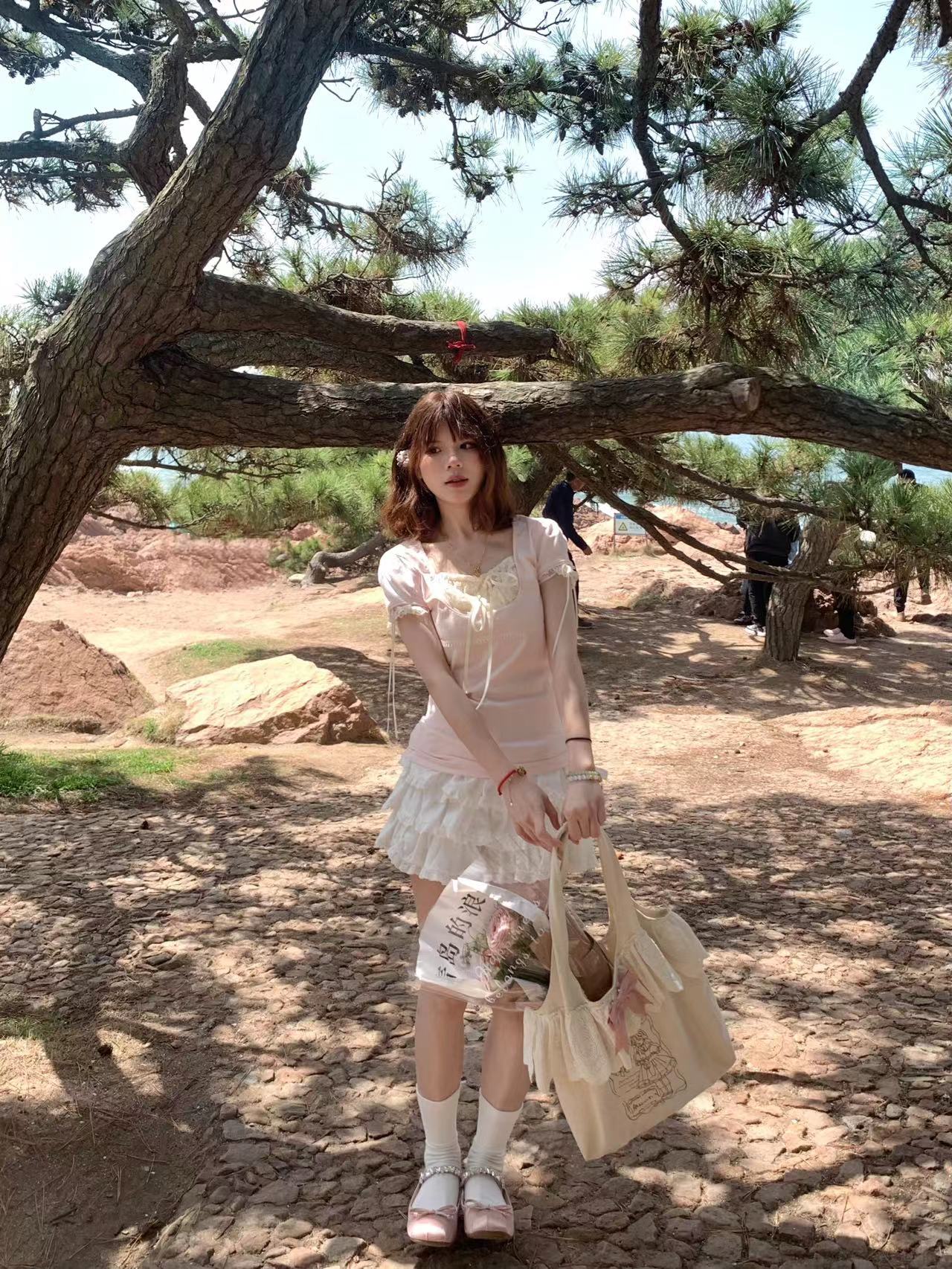 夏季新款顯瘦U領花邊芭蕾風T恤女設計感小衆甜妹短袖純棉上衣女