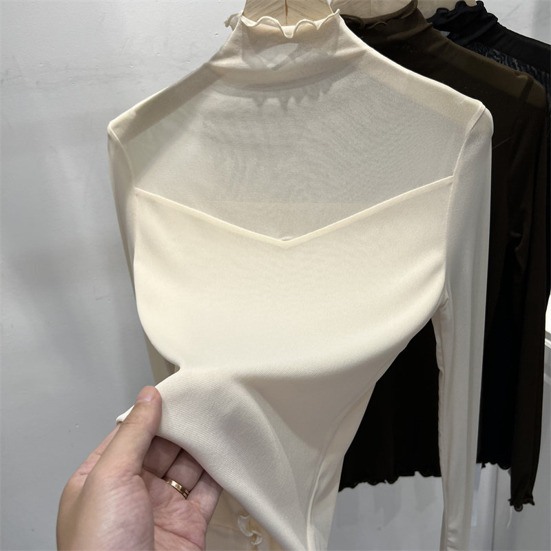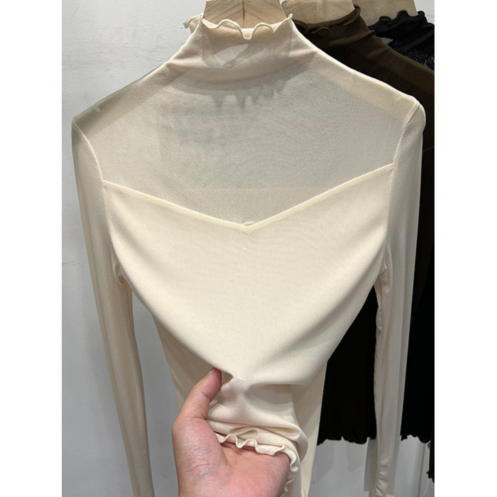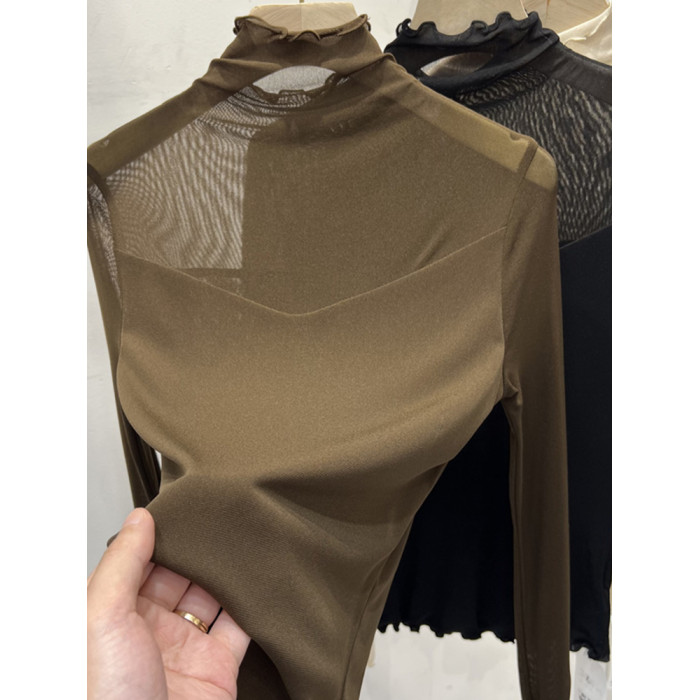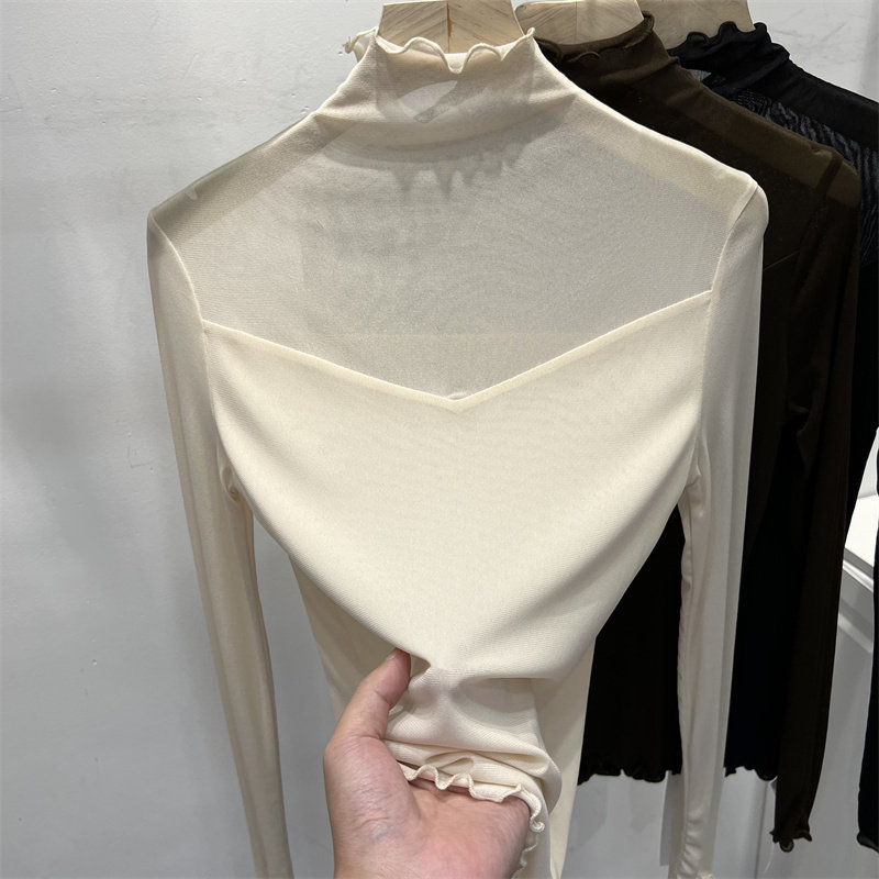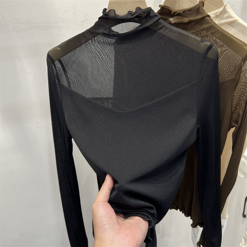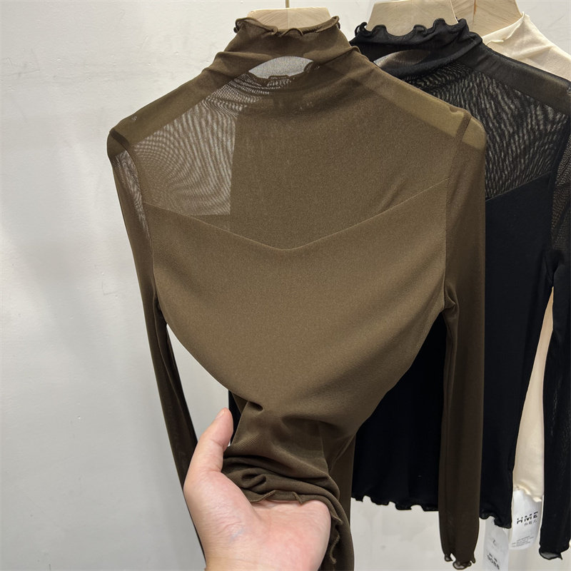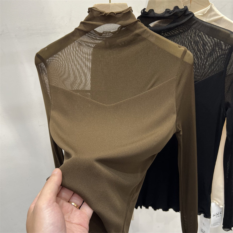 木耳邊半高領網紗長袖T恤女2025春秋新款洋氣時尚內搭打底衫上衣