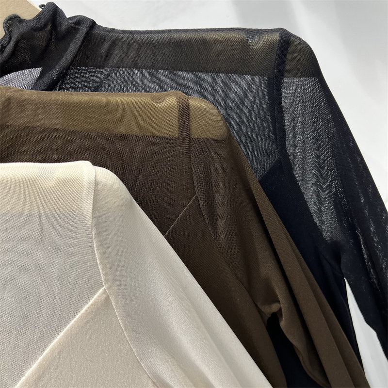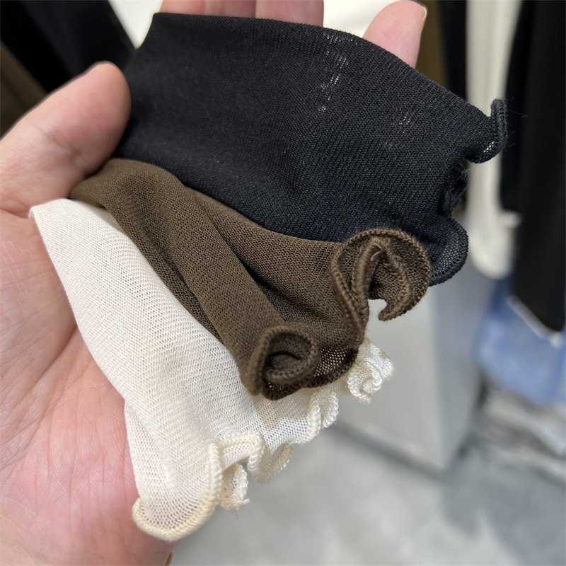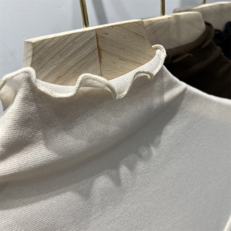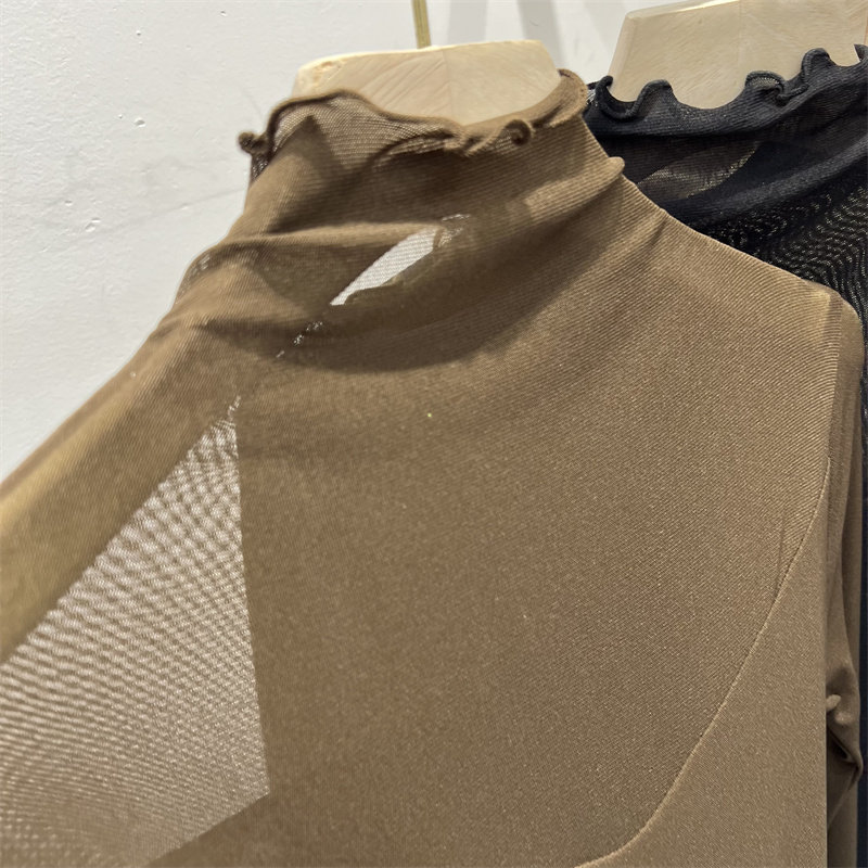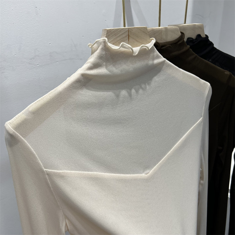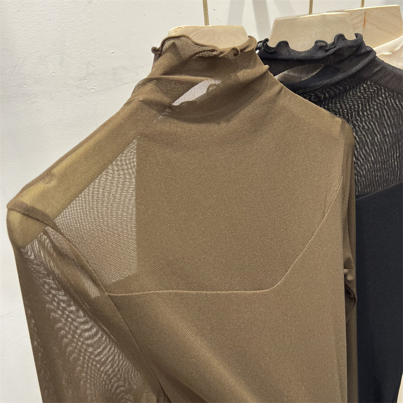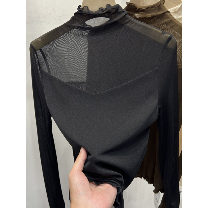 木耳邊半高領網紗長袖T恤女2025春秋新款洋氣時尚內搭打底衫上衣