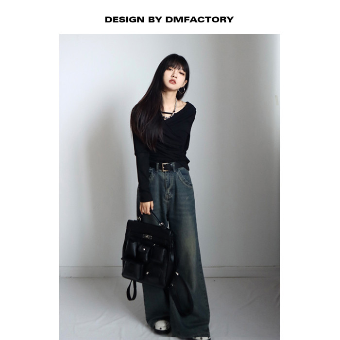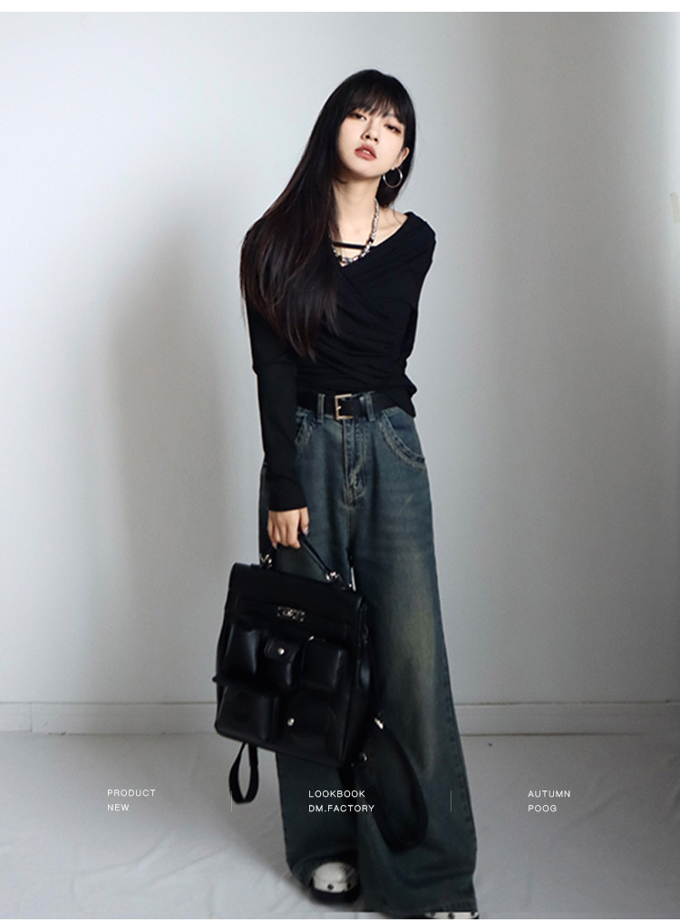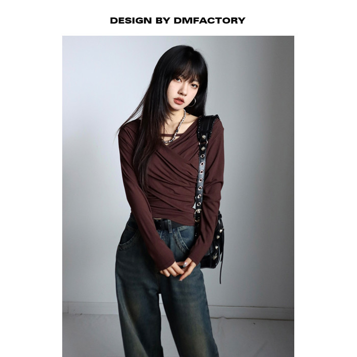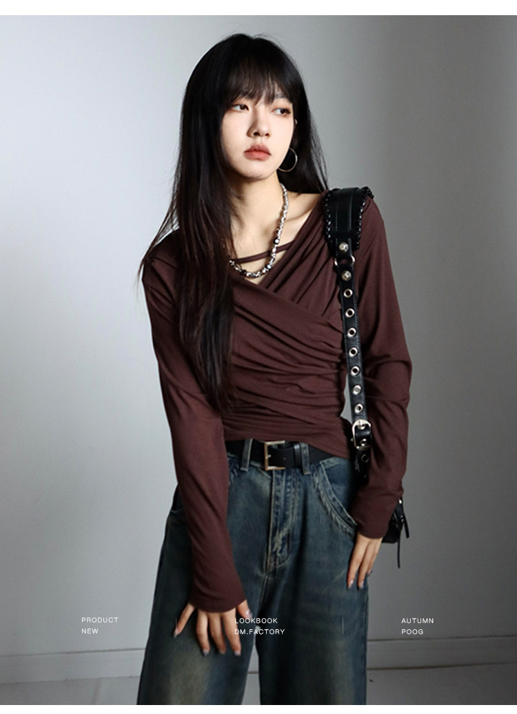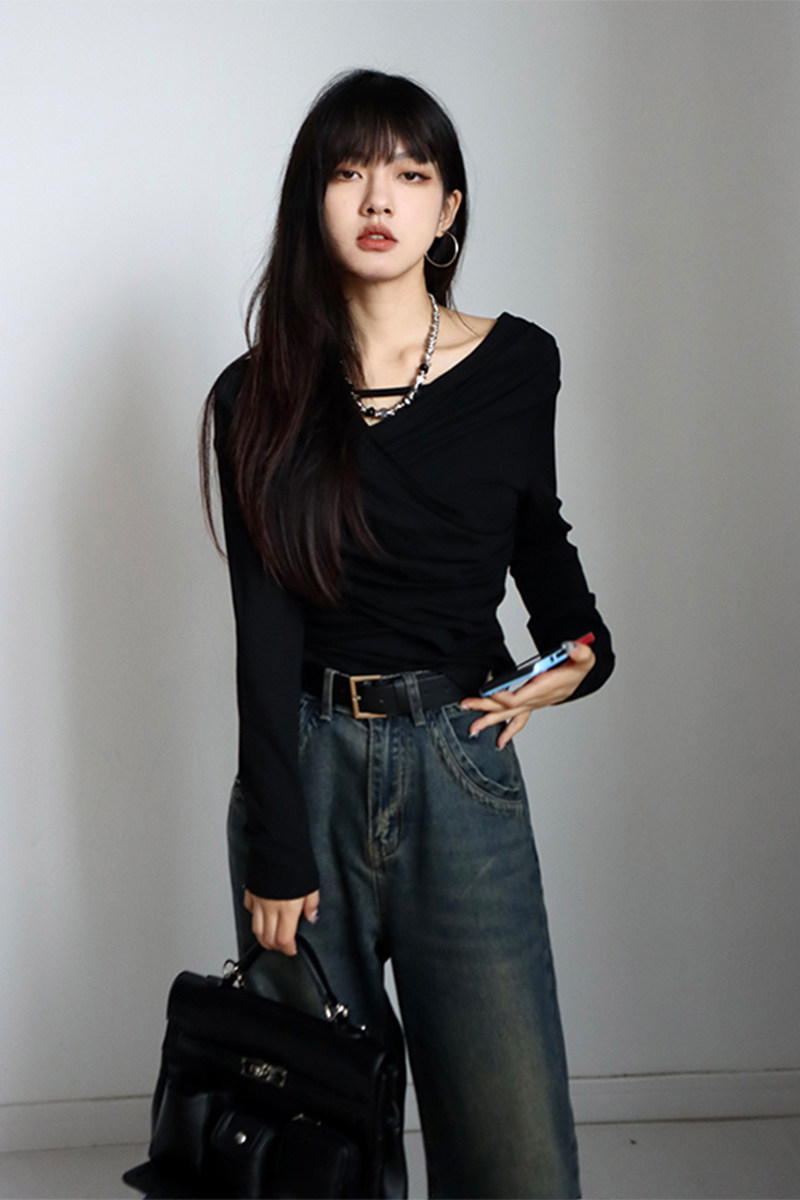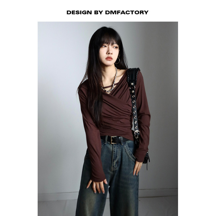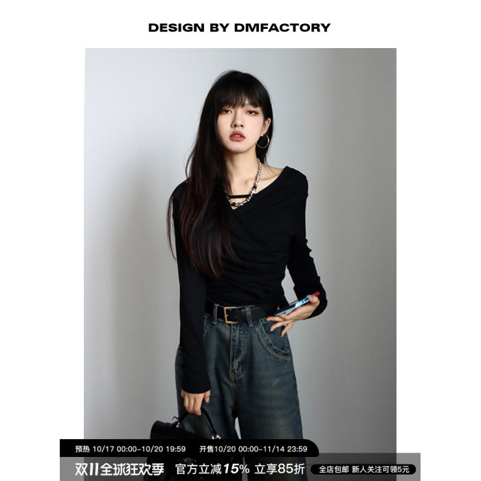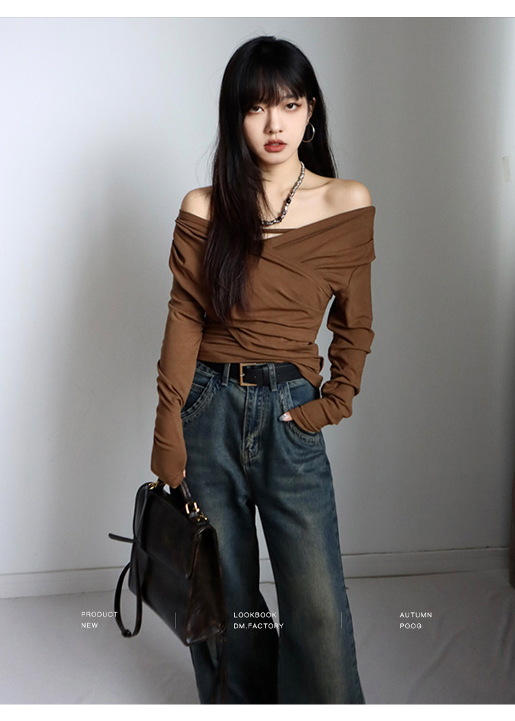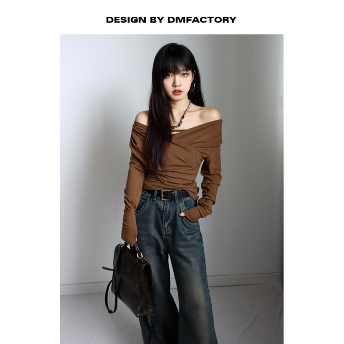 呆毛 設計感蕩領系帶長袖T恤女春秋不規則修身顯瘦褶皺一字肩上衣