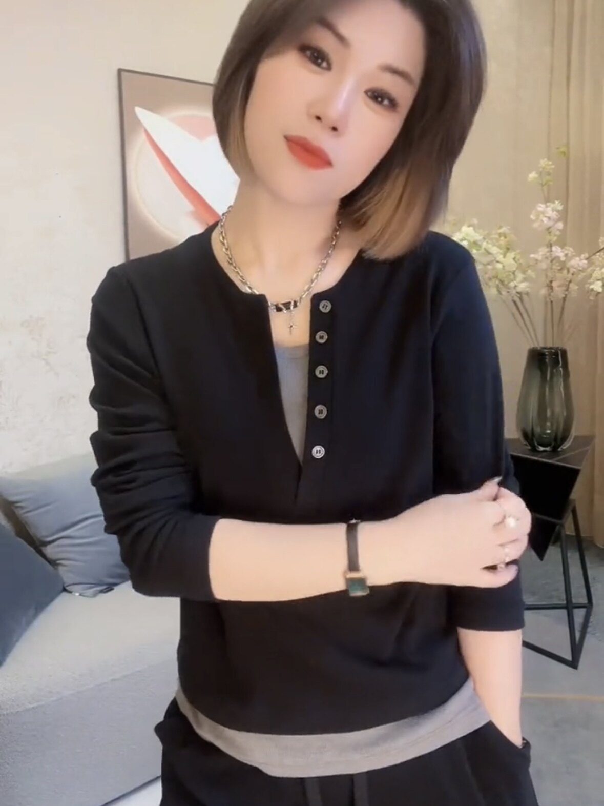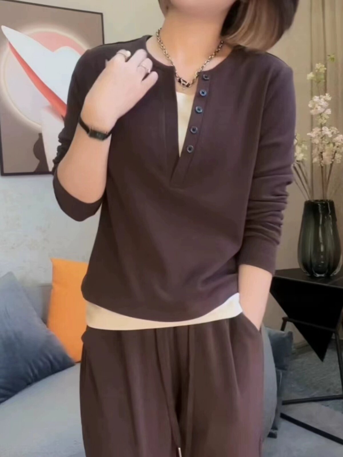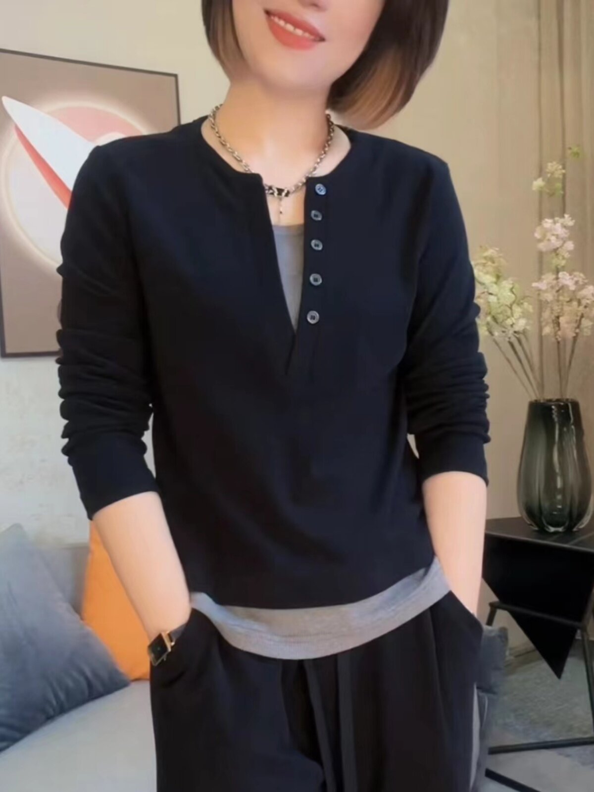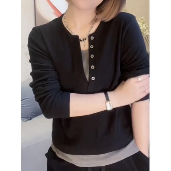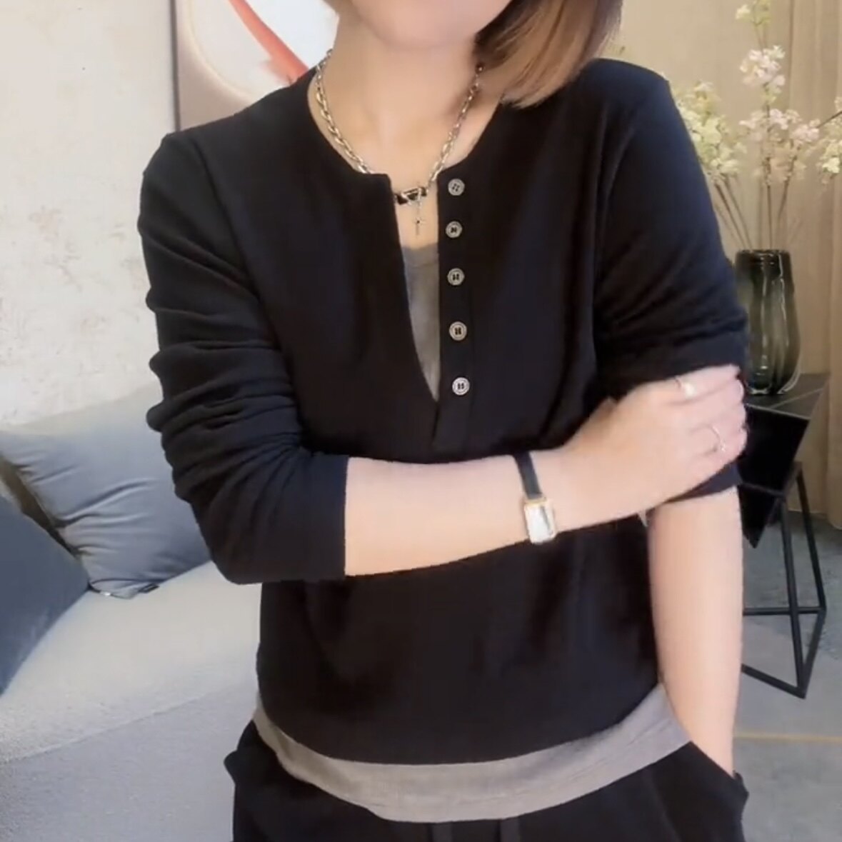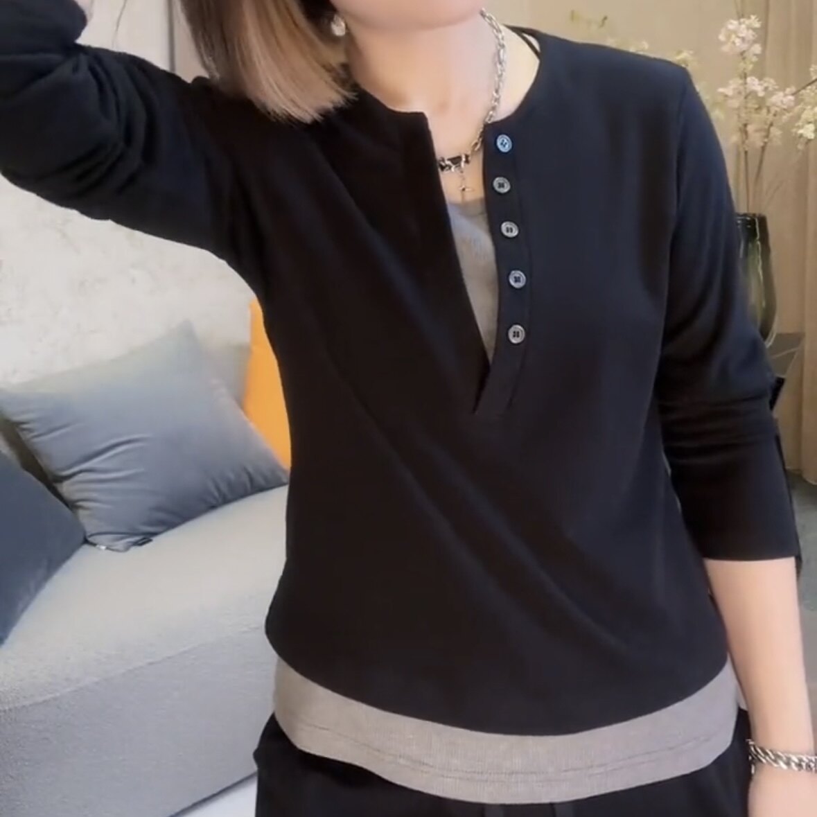 春秋季氣質純棉假兩件長袖T恤女韓版設計感紐釦寬松百搭打底小衫