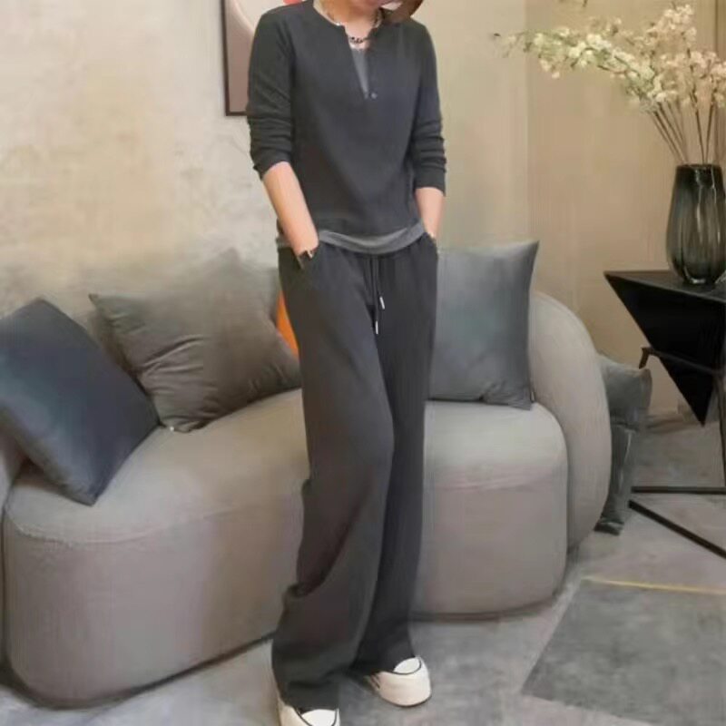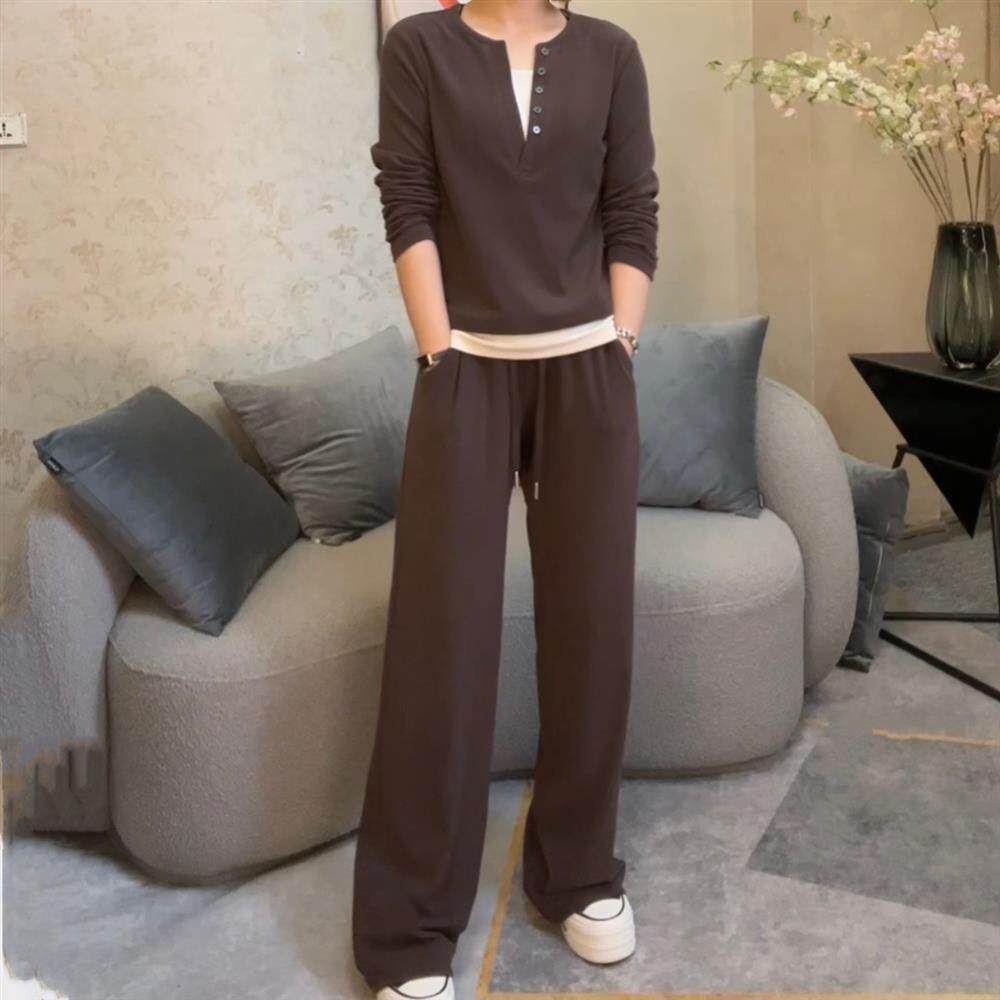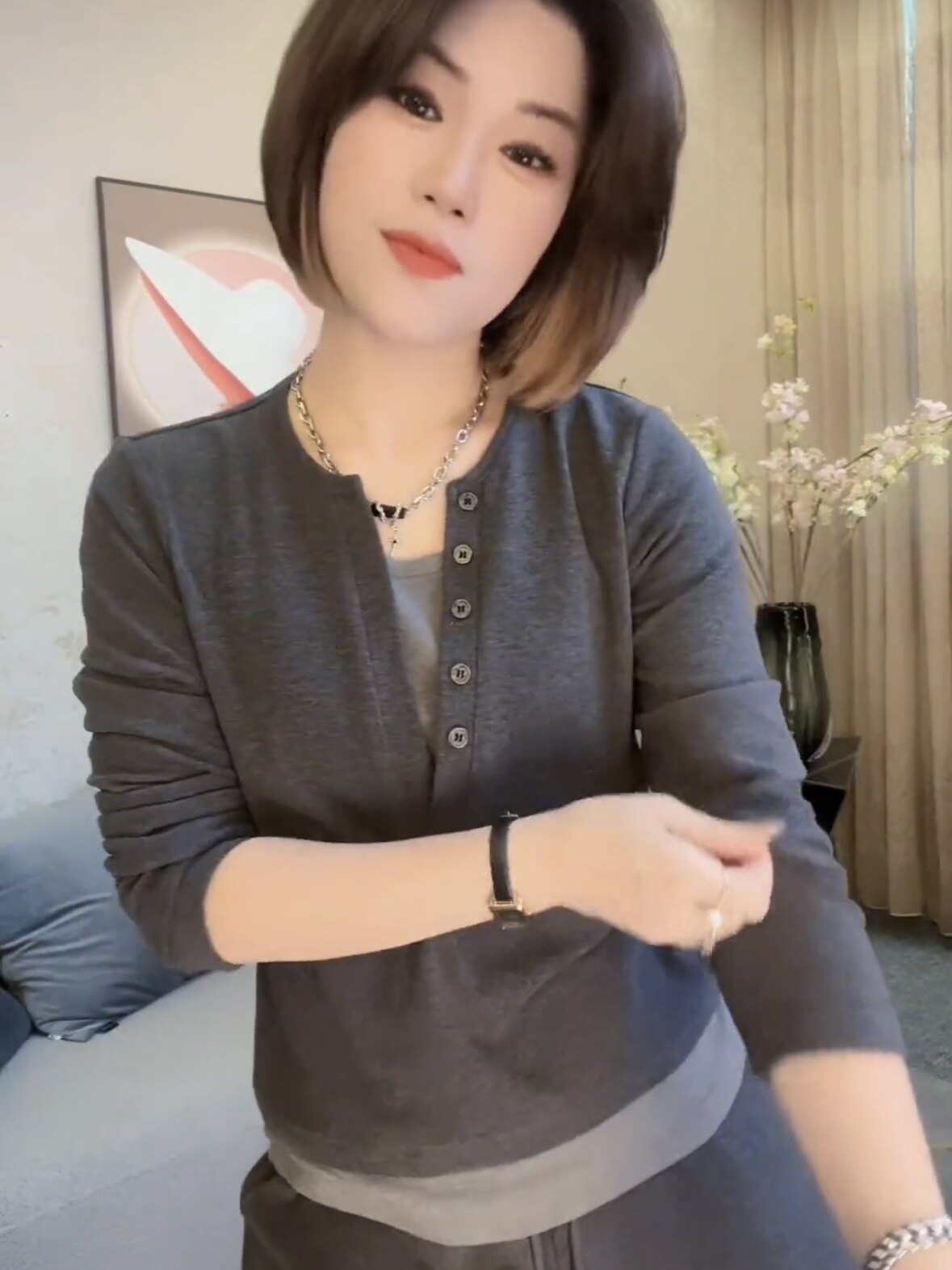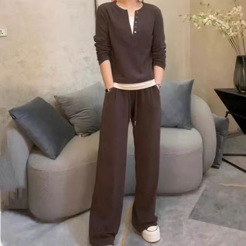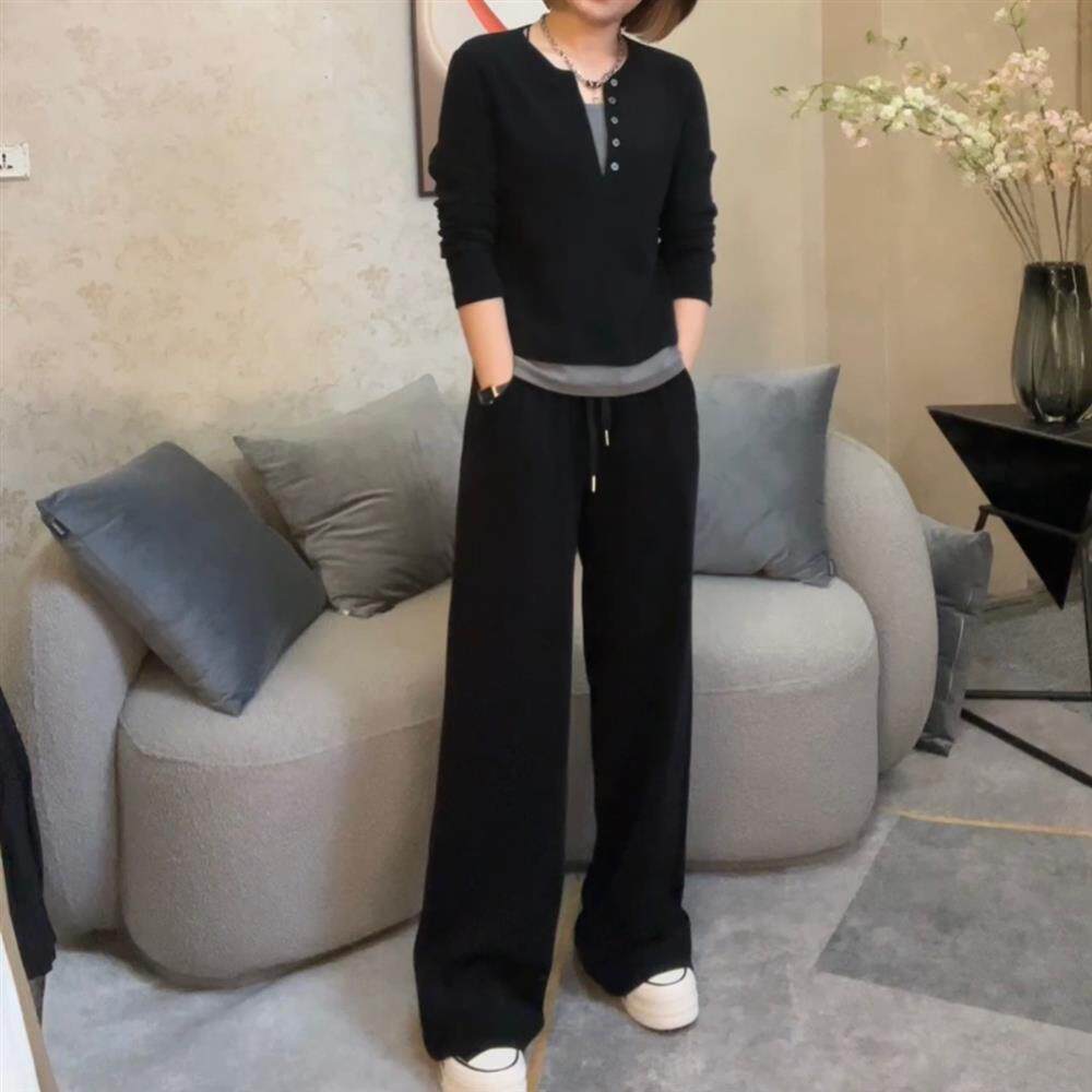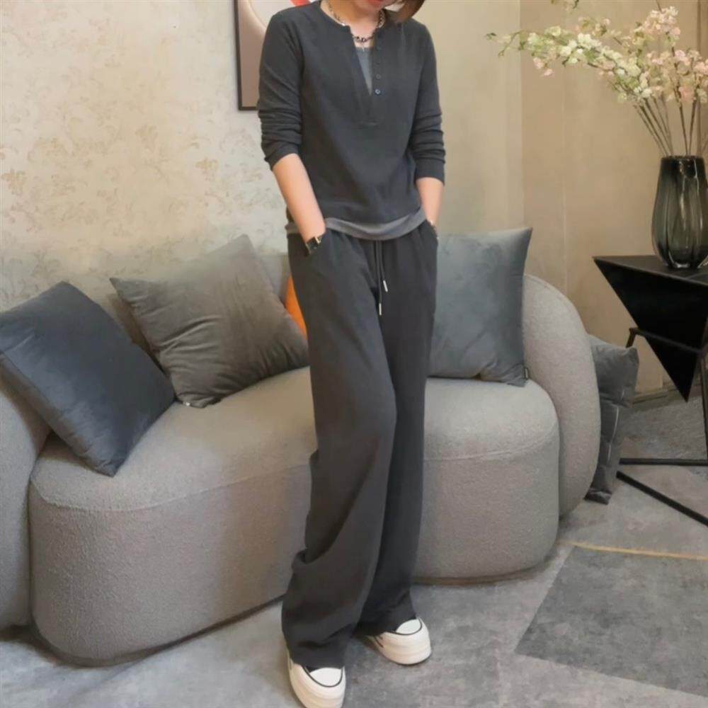 春秋季氣質純棉假兩件長袖T恤女韓版設計感紐釦寬松百搭打底小衫