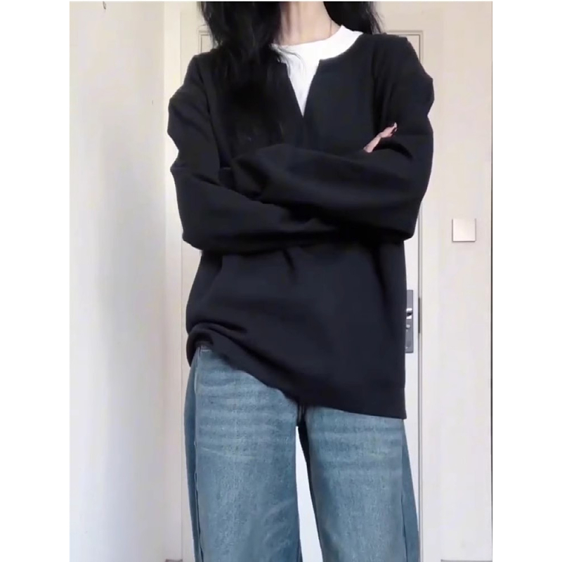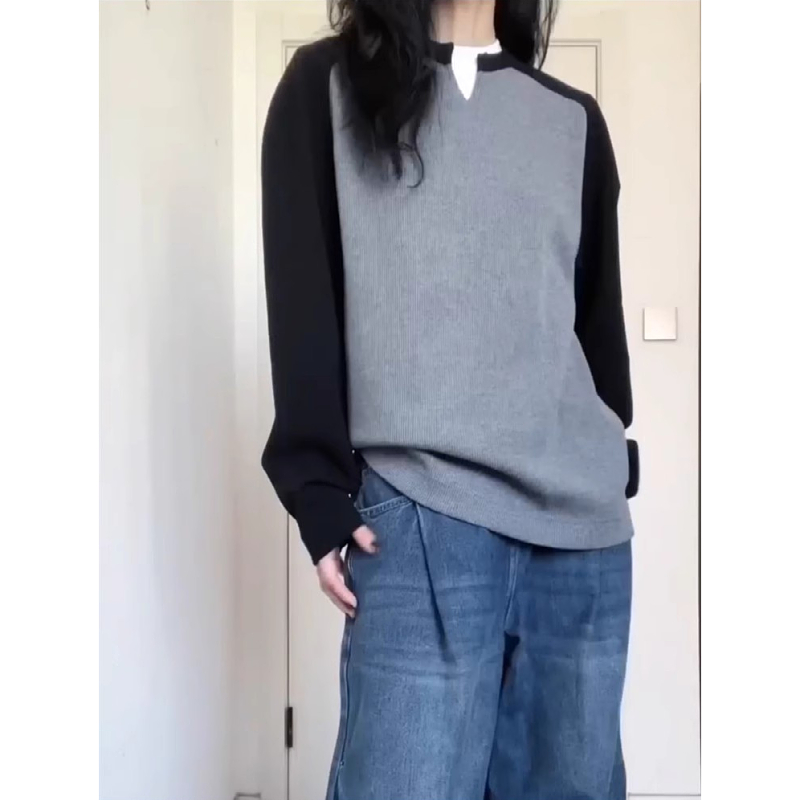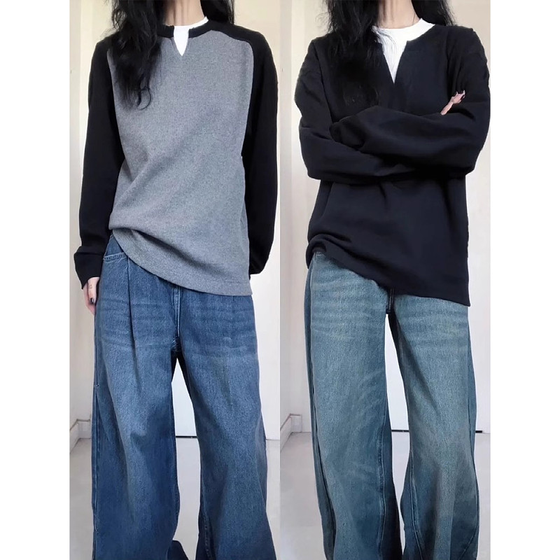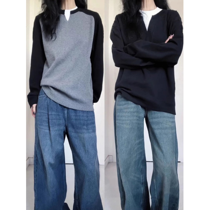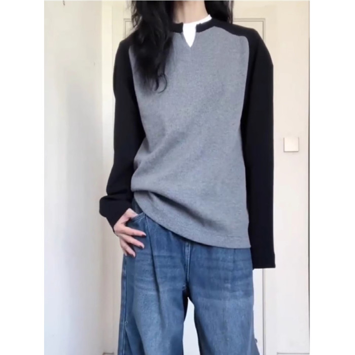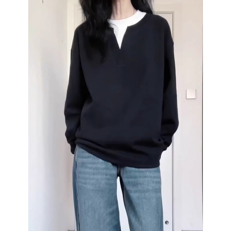 純棉美式復古假兩件長袖T恤女秋季新款大碼胖mm休閒寬松顯瘦上衣