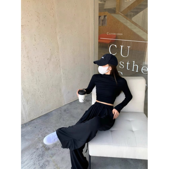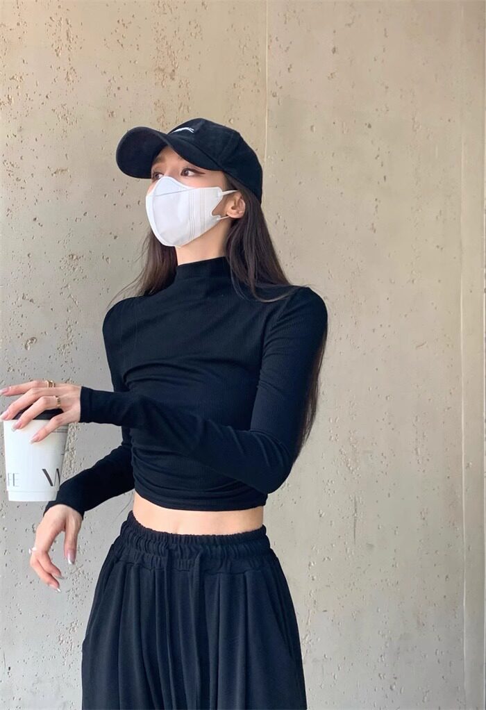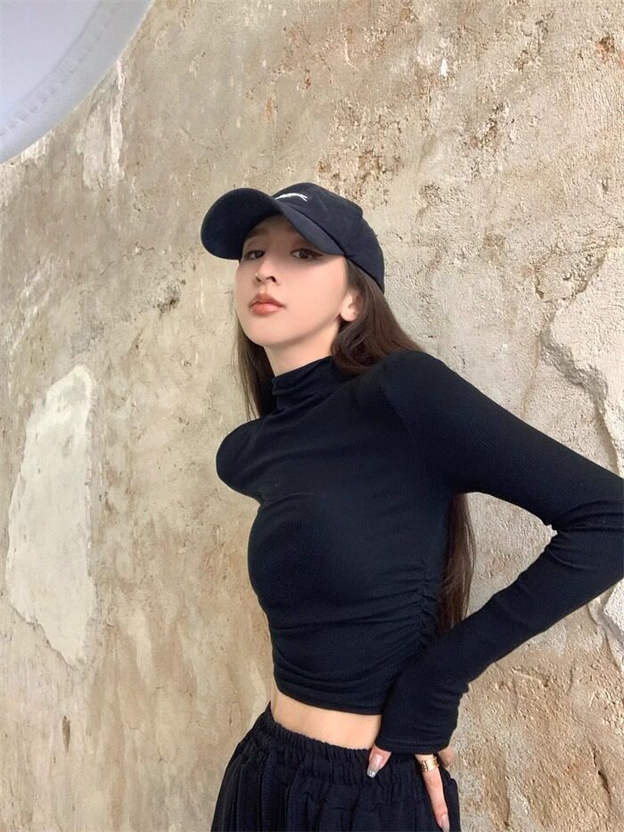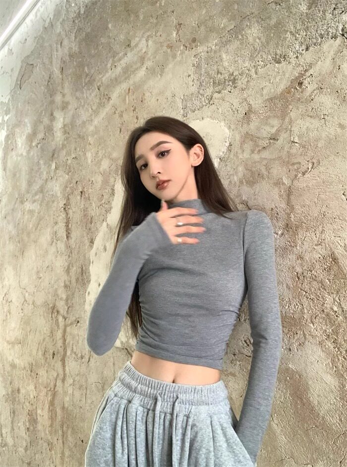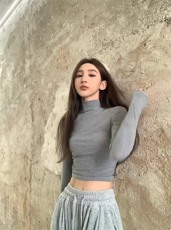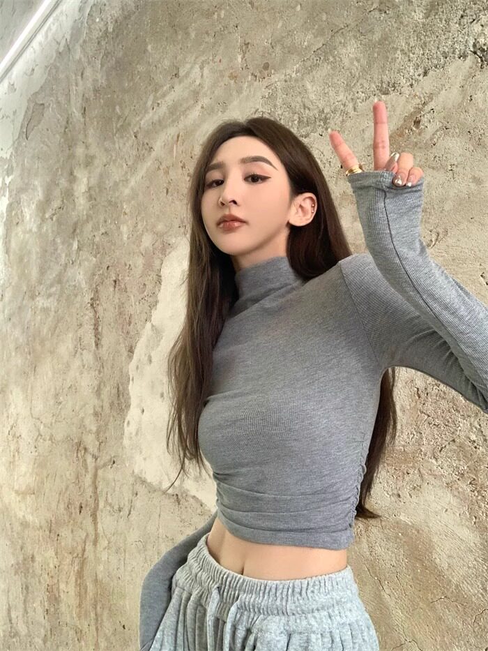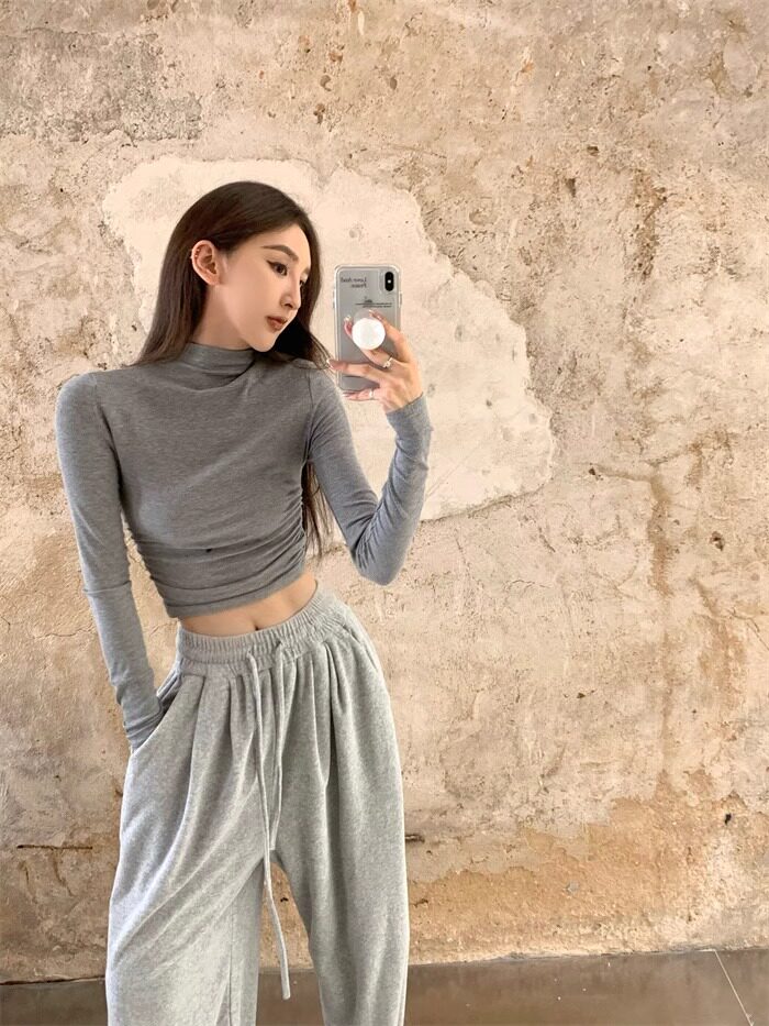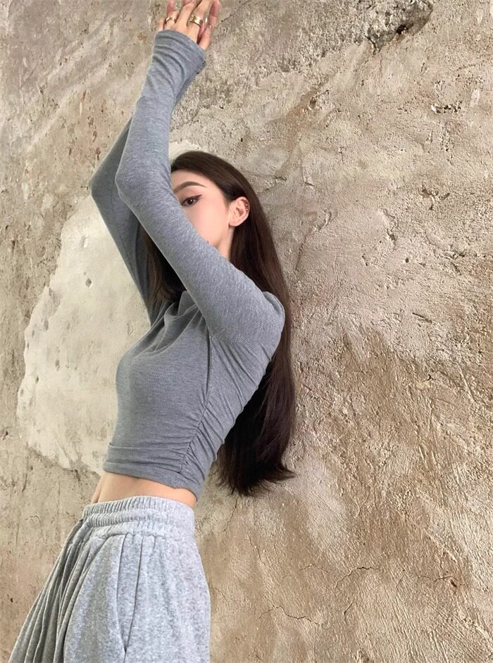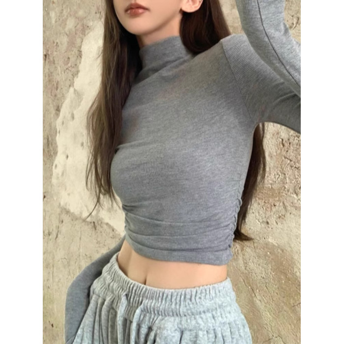 辣妹修身褶皺半高領長袖T恤女秋冬季灰色緊身內搭短款上衣打底衫