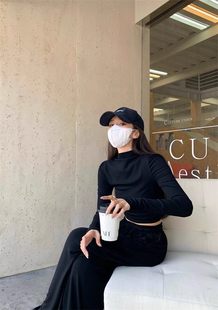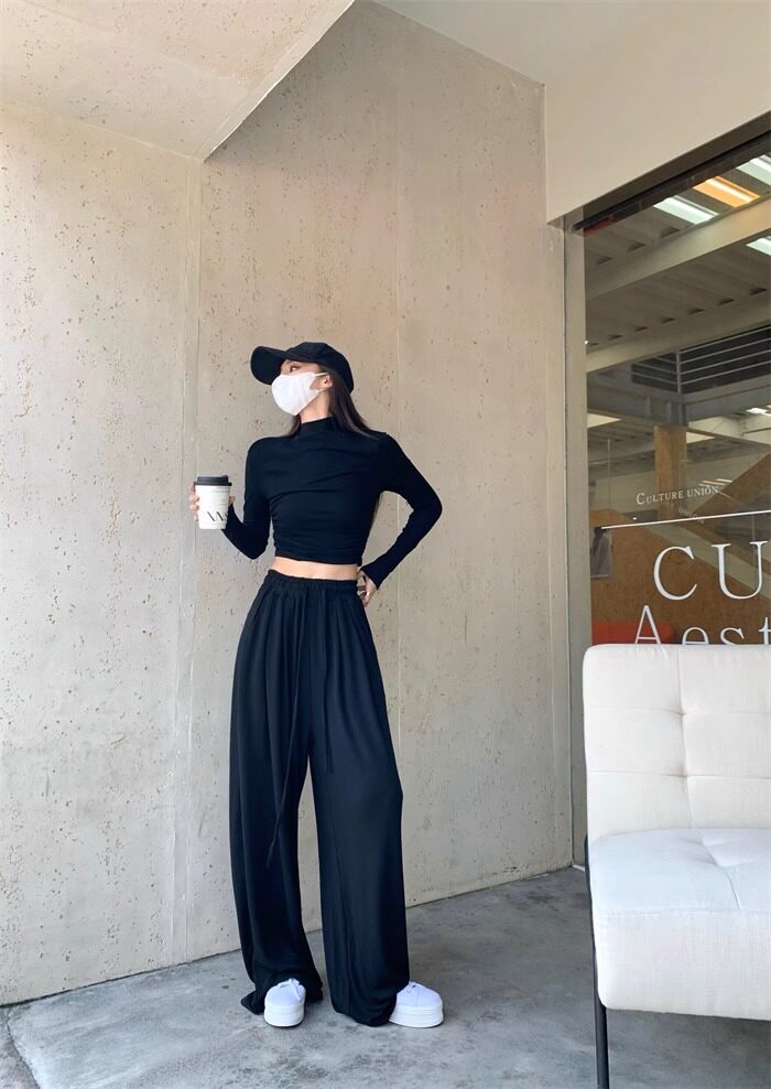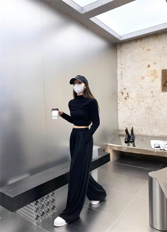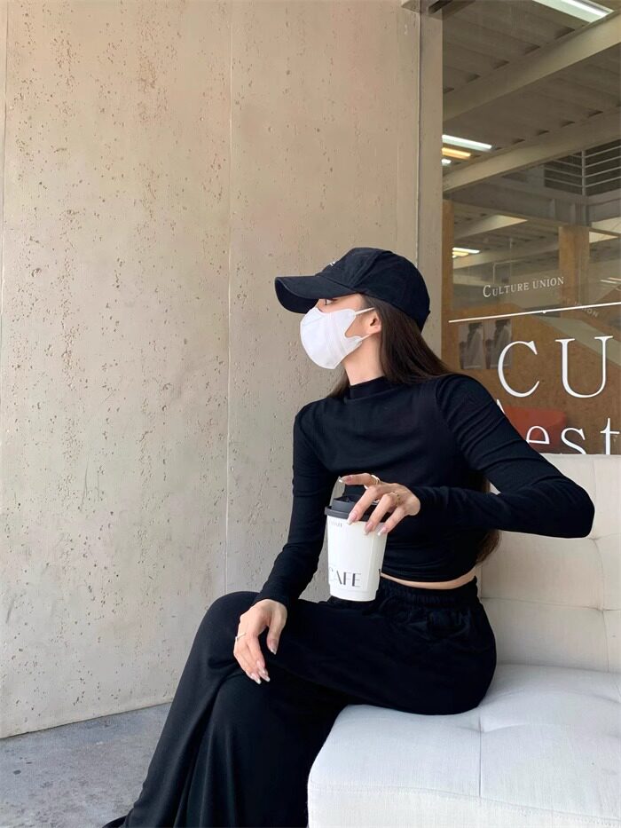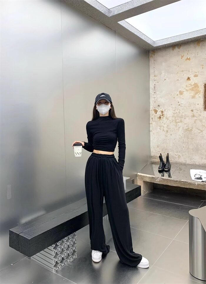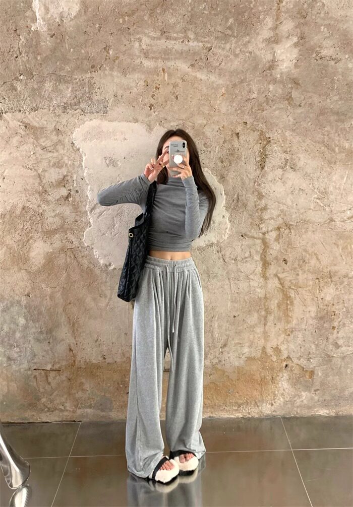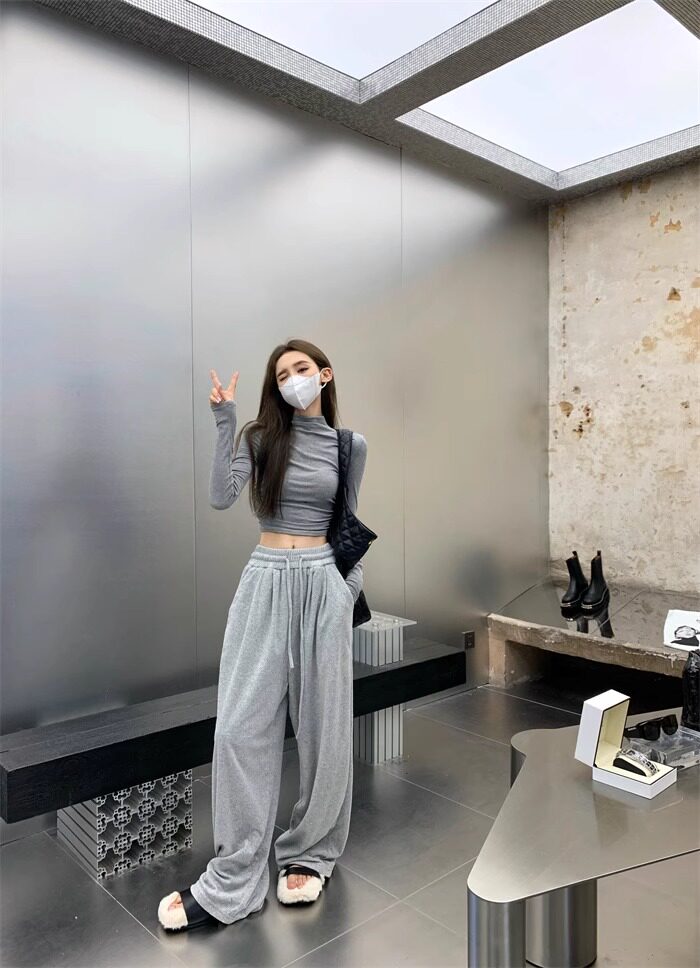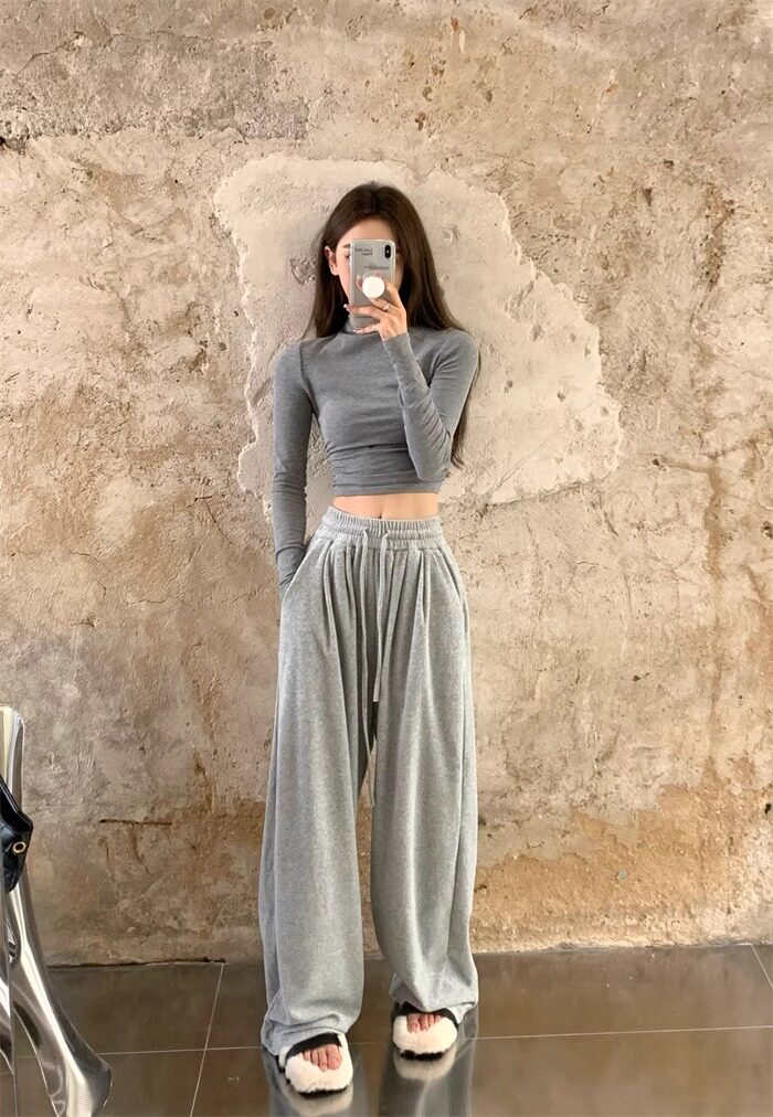 辣妹修身褶皺半高領長袖T恤女秋冬季灰色緊身內搭短款上衣打底衫