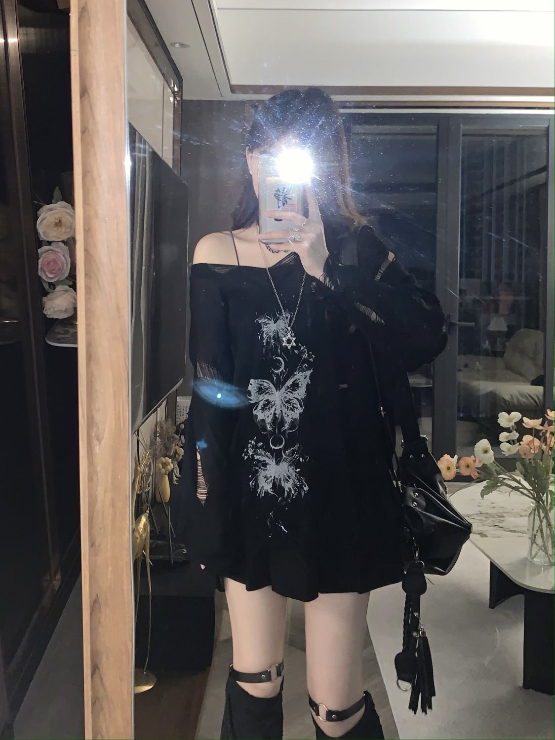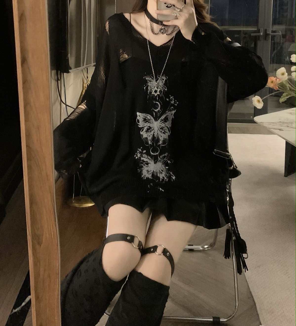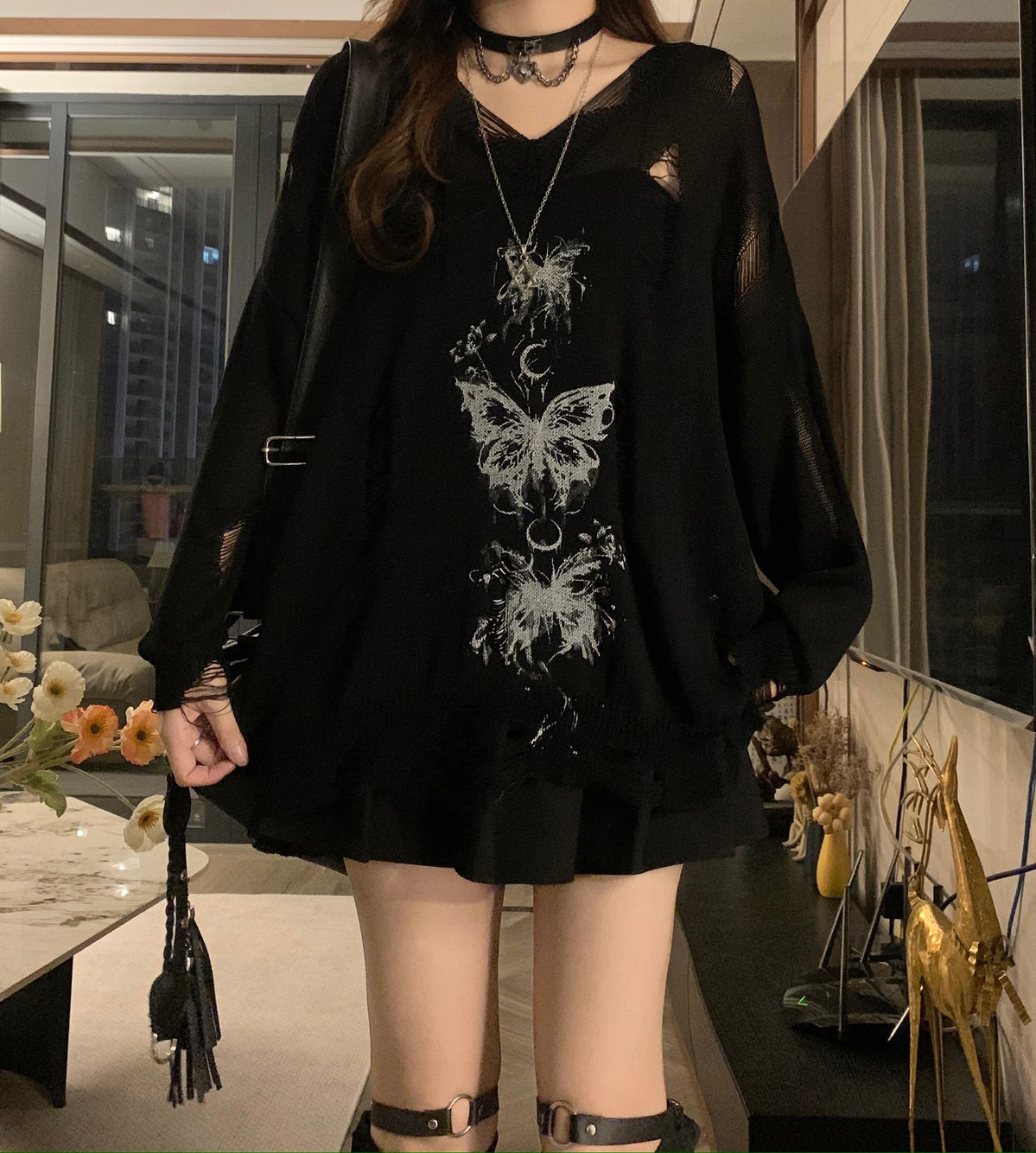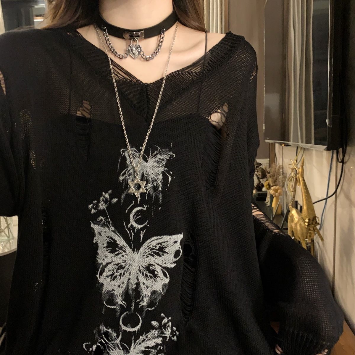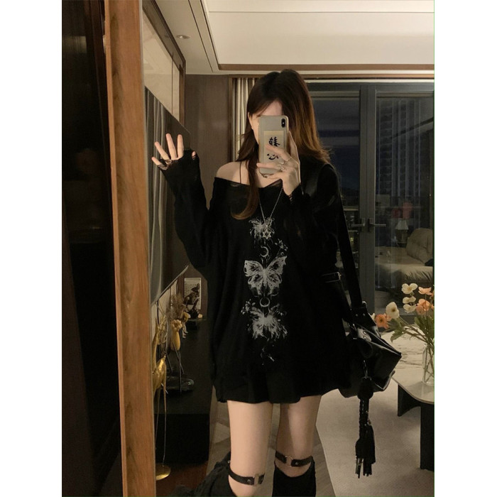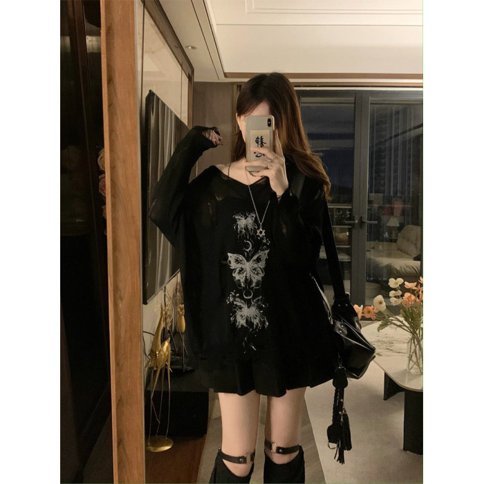 y2k辣妹復古蝴蝶破洞V領針織衫女秋季新款慵懶風長袖防曬罩衫T恤