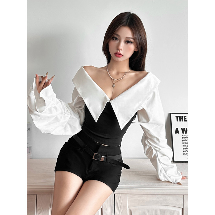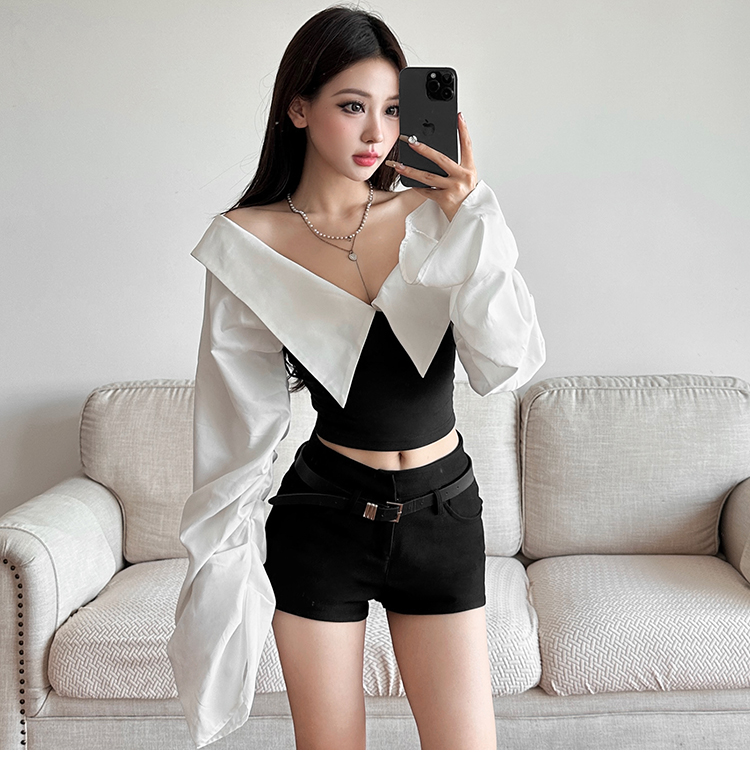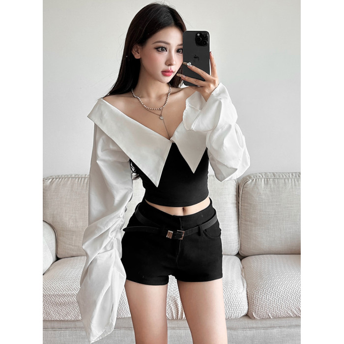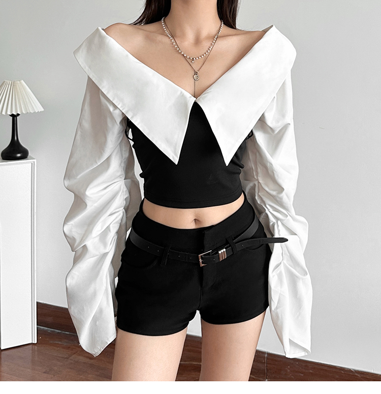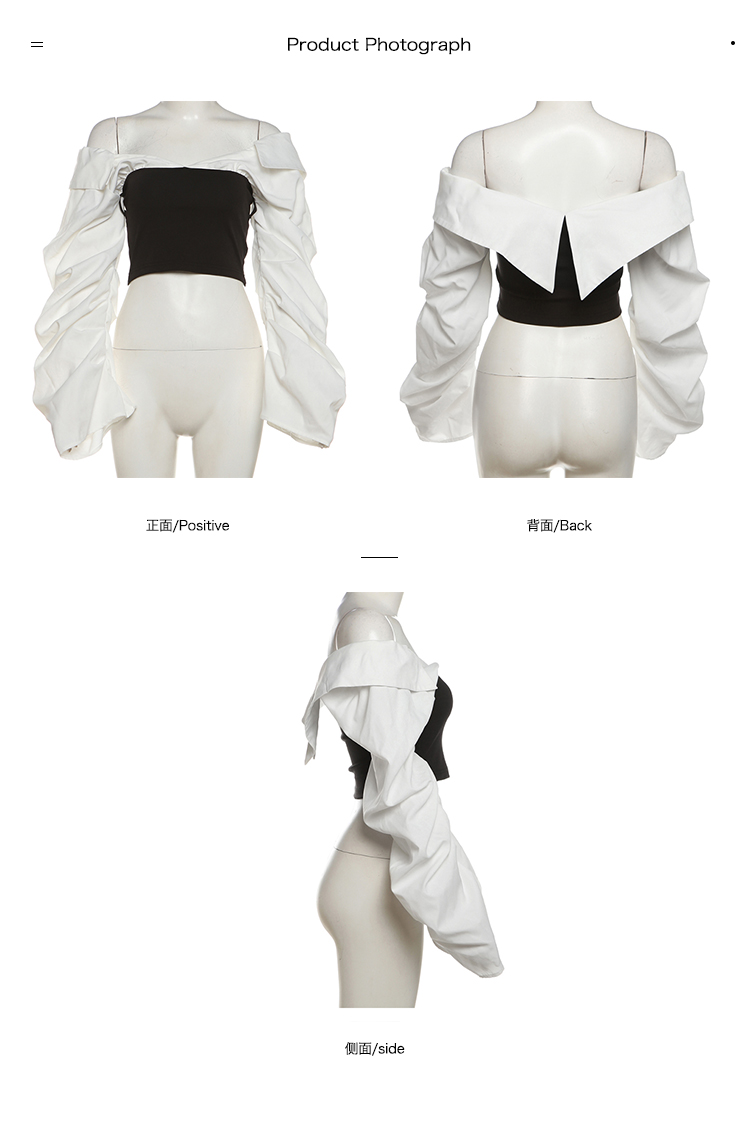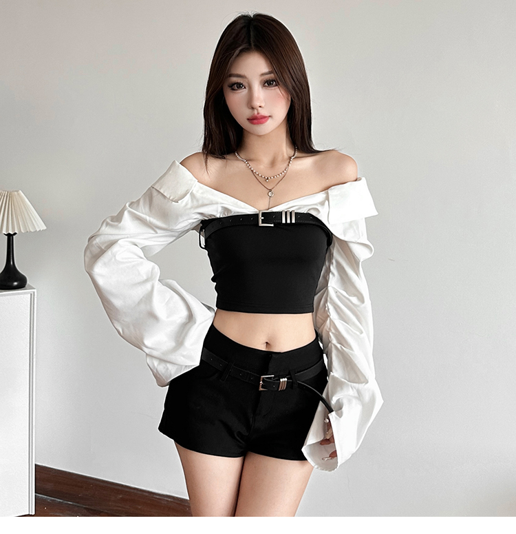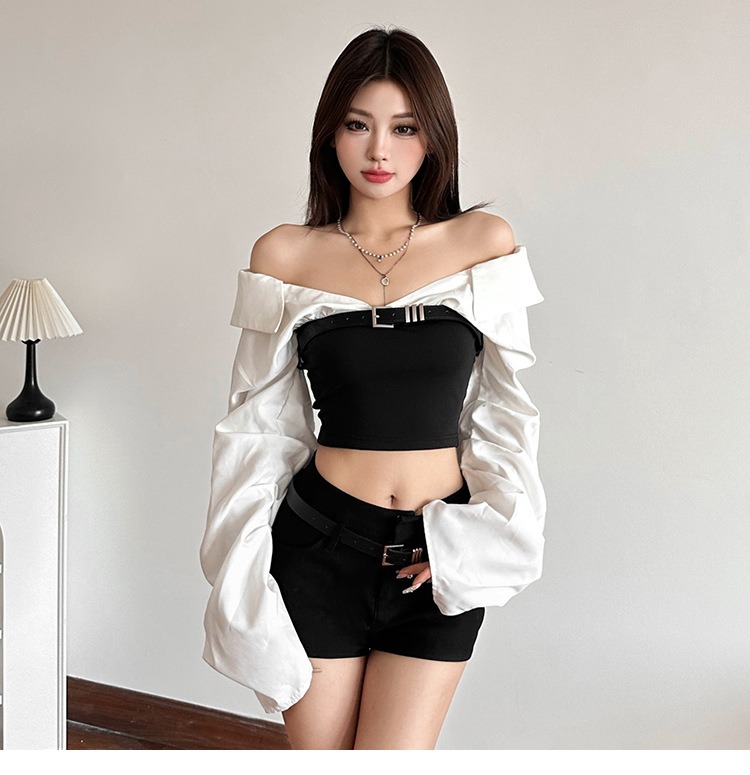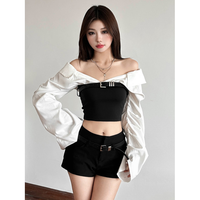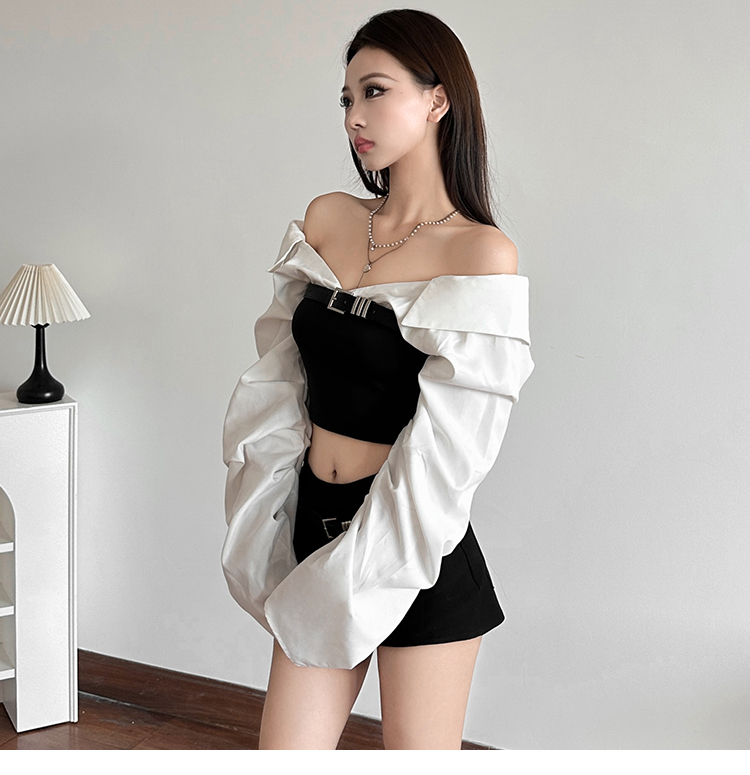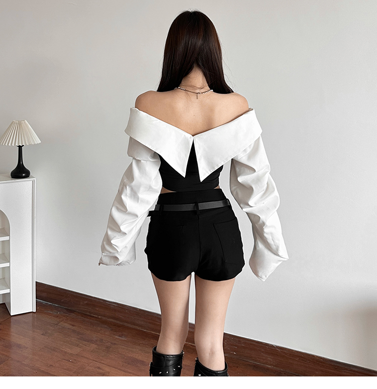 怪誕女孩 韓系chic設計感一字領露肩長袖T恤女 修身顯瘦短上衣秋