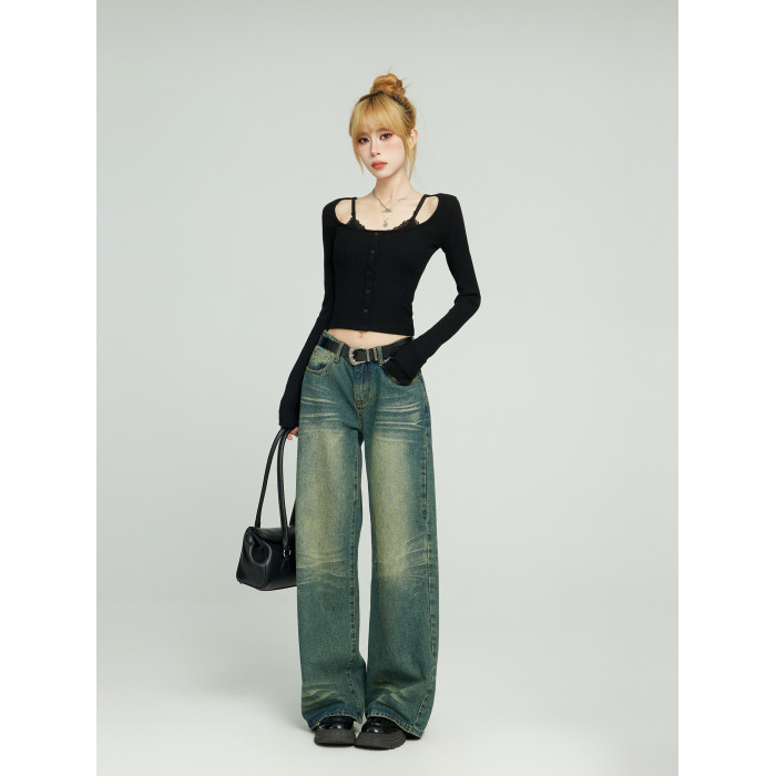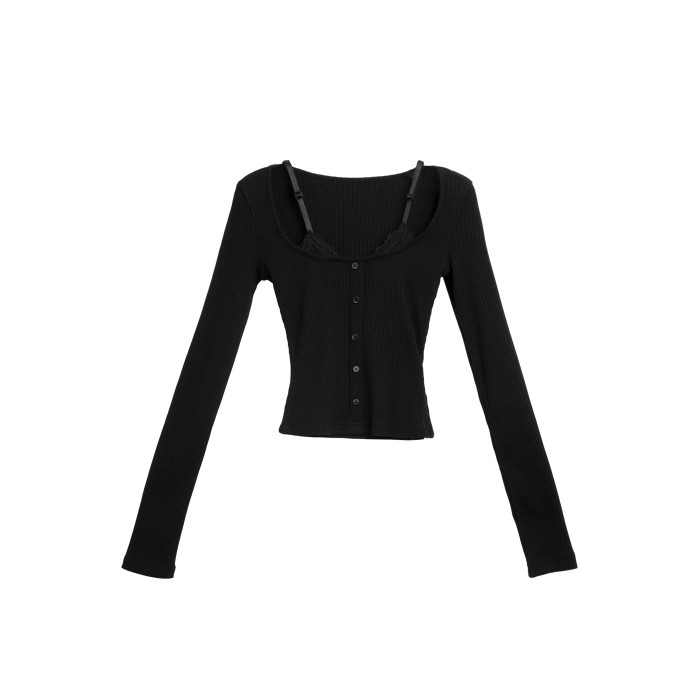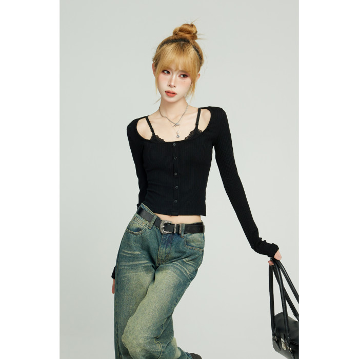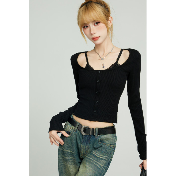 辣妹黑色假兩件蕾絲長袖t恤女早秋修身內搭打底吊帶短款上衣秋季