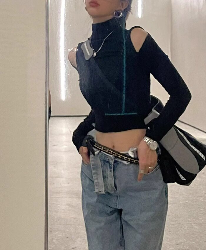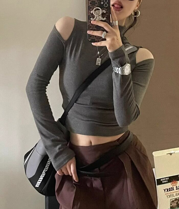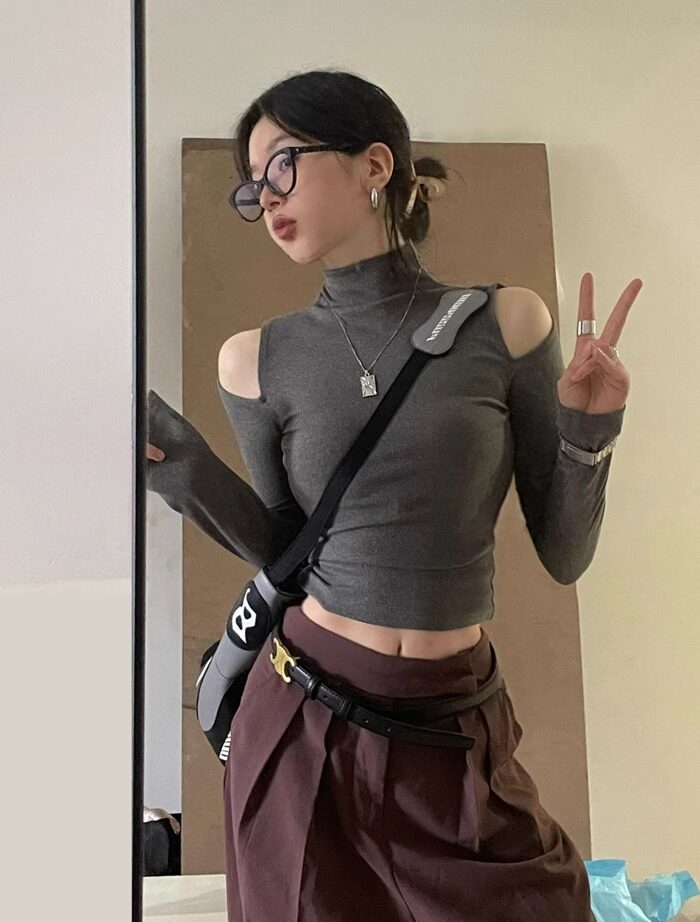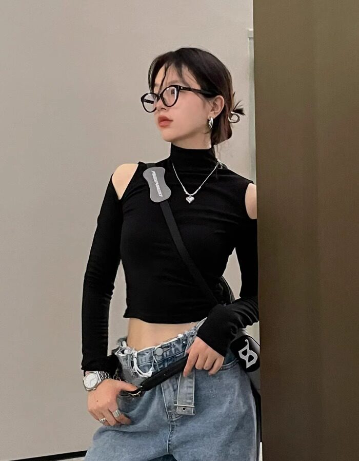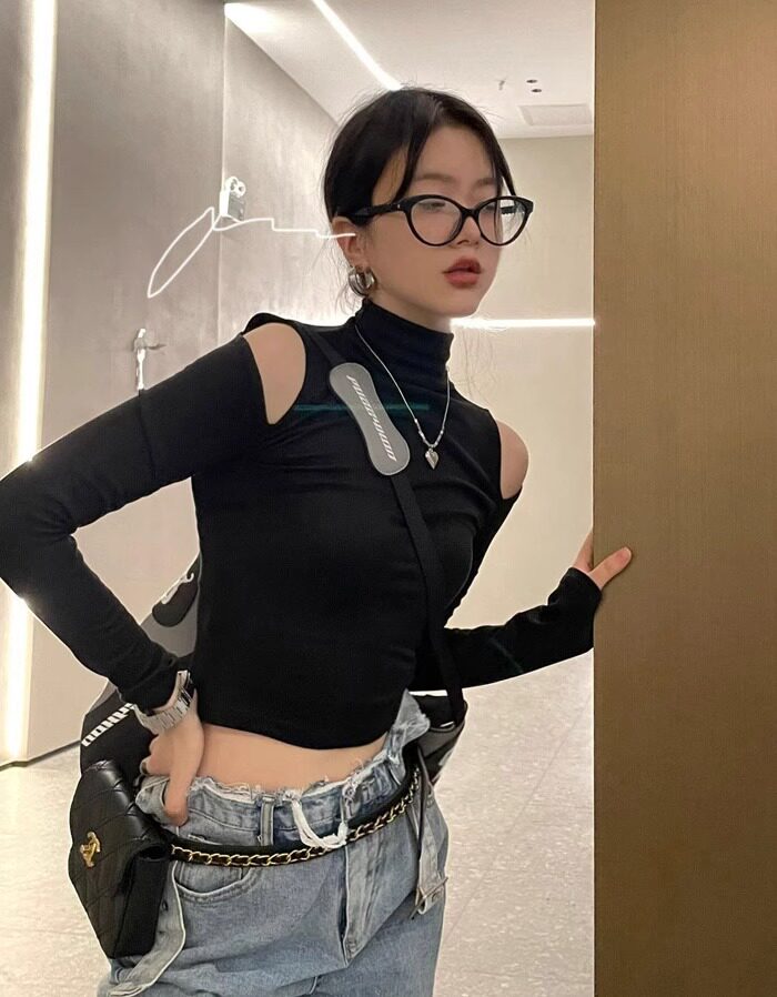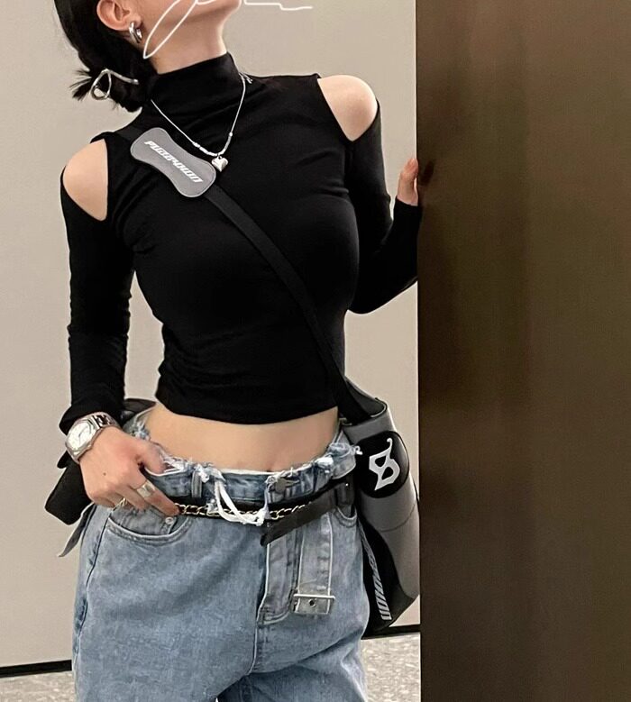 甜酷辣妹半高領長袖露肩緊身T恤女設計感露臍jazz上衣美式打底衫
