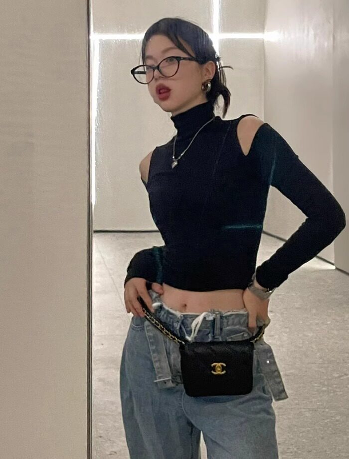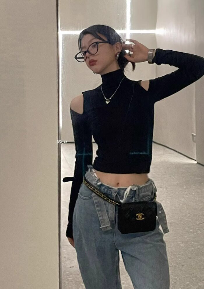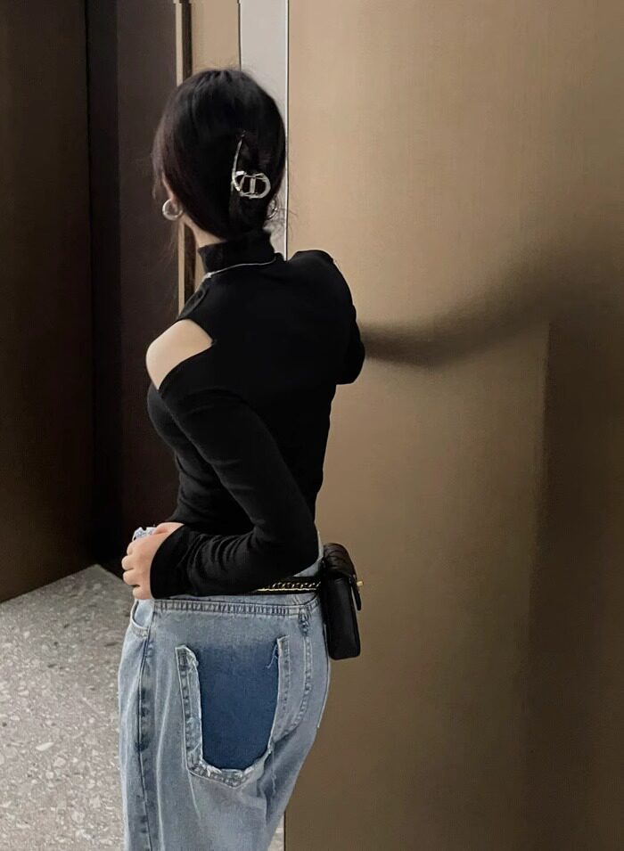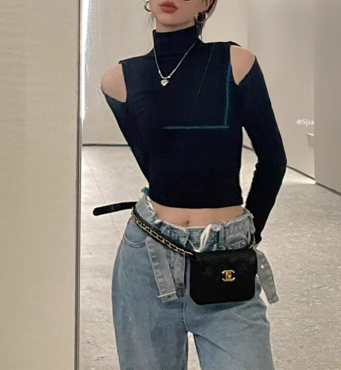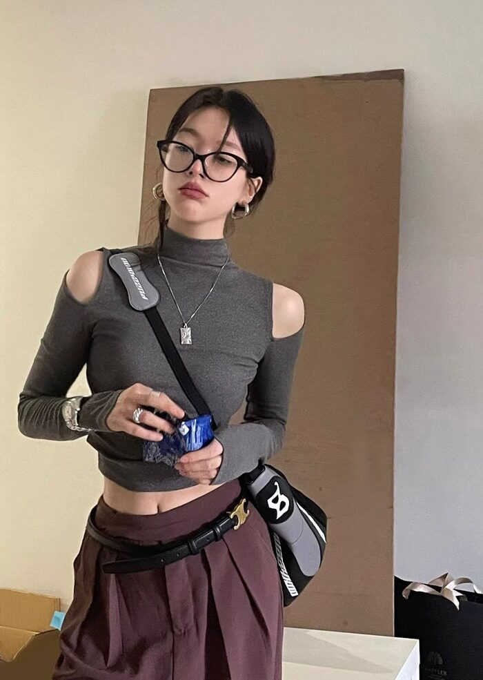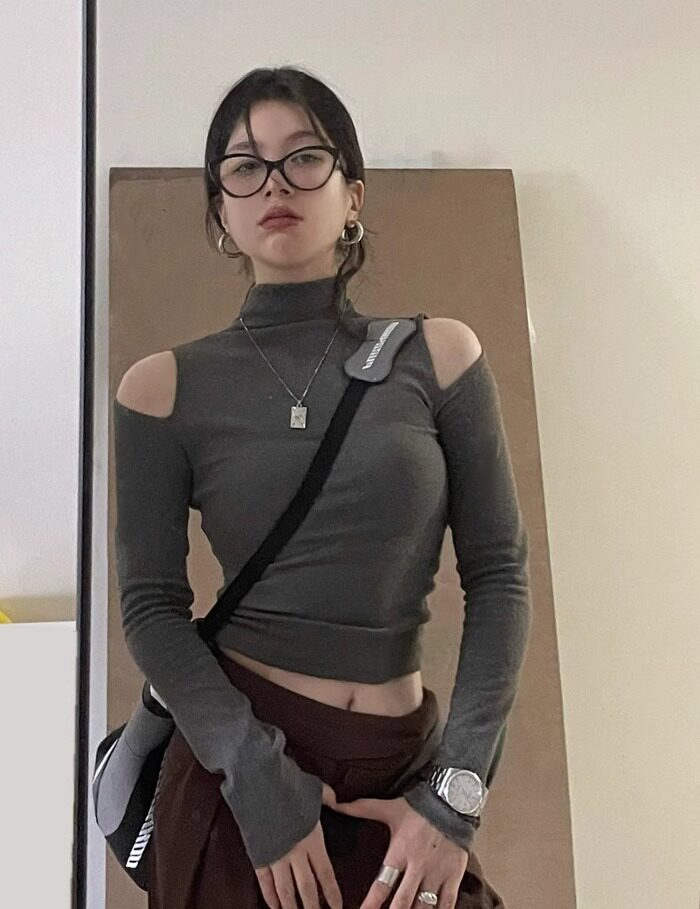 甜酷辣妹半高領長袖露肩緊身T恤女設計感露臍jazz上衣美式打底衫