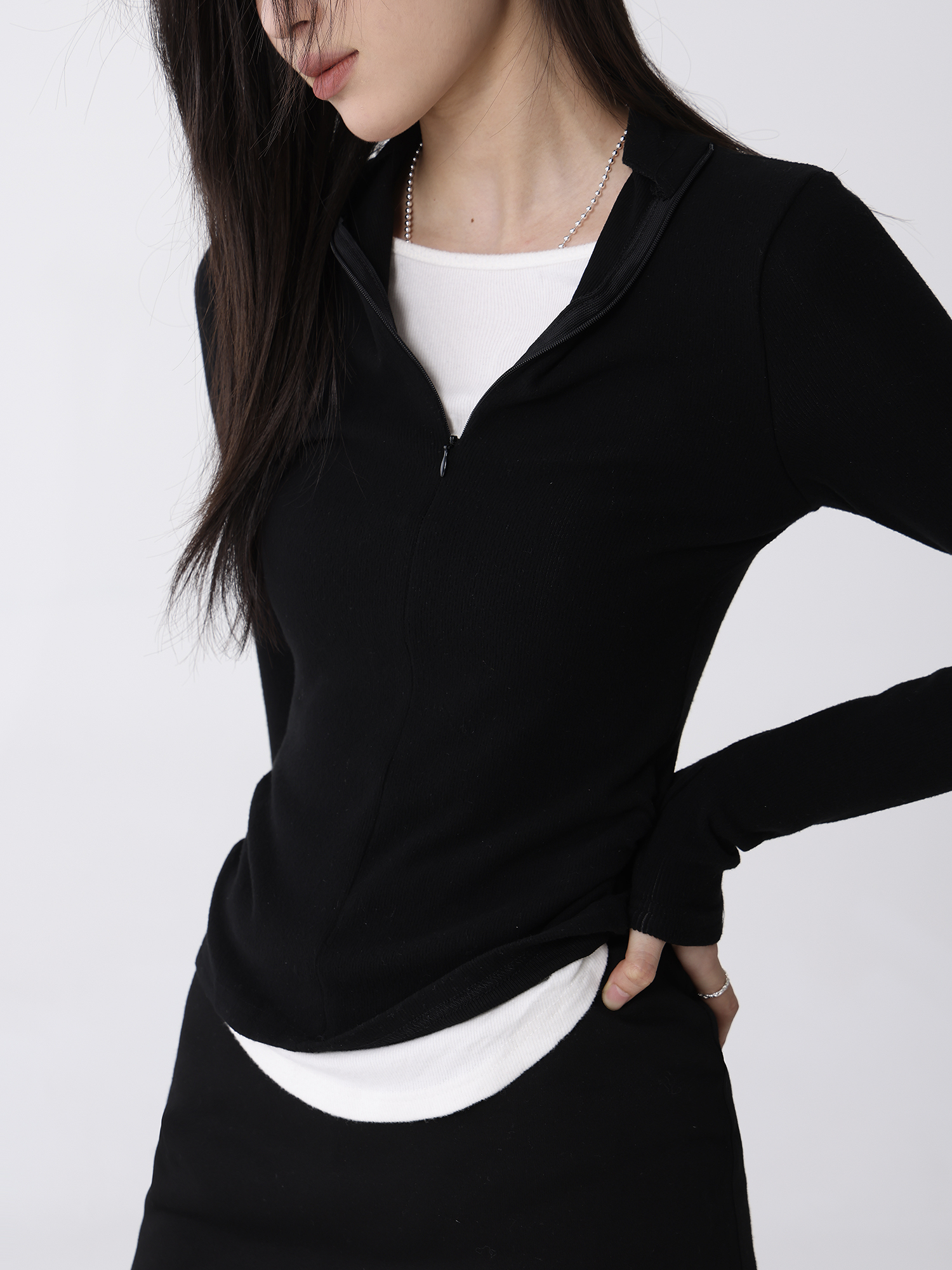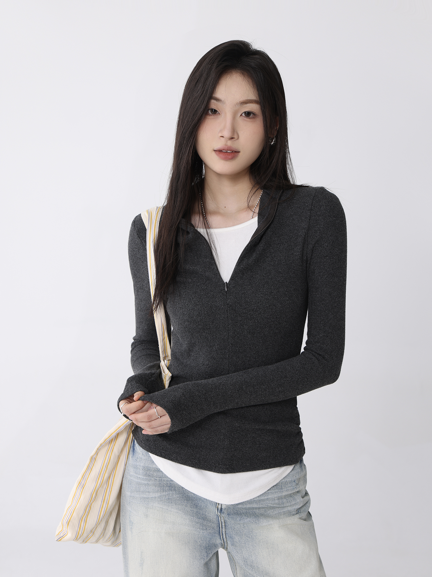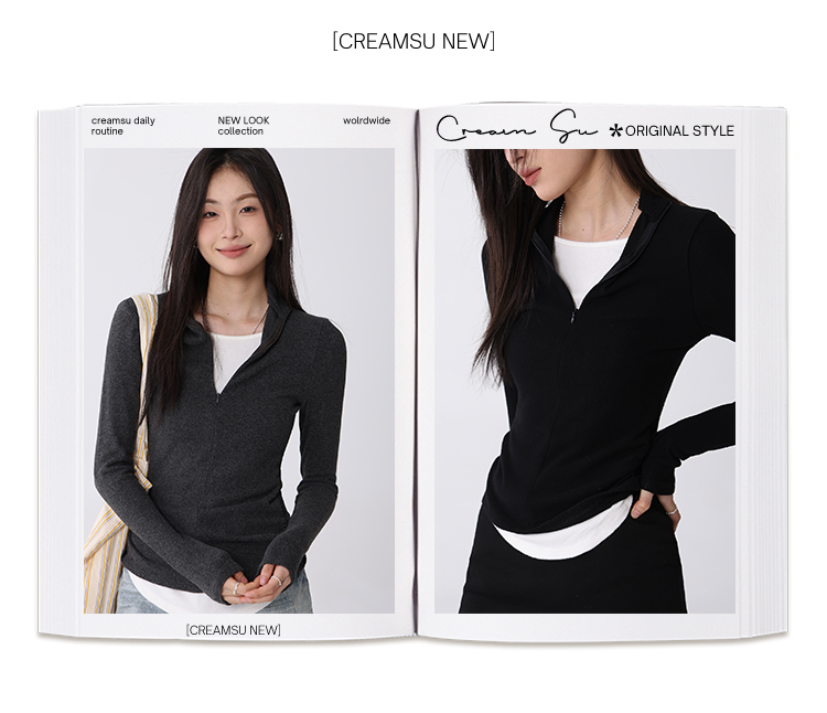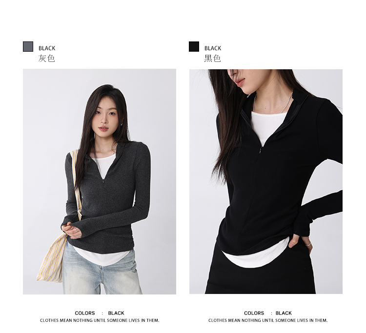 Creamsu敘白 修身內搭拉鍊v領假兩件長袖打底衫t恤2025秋款上衣女