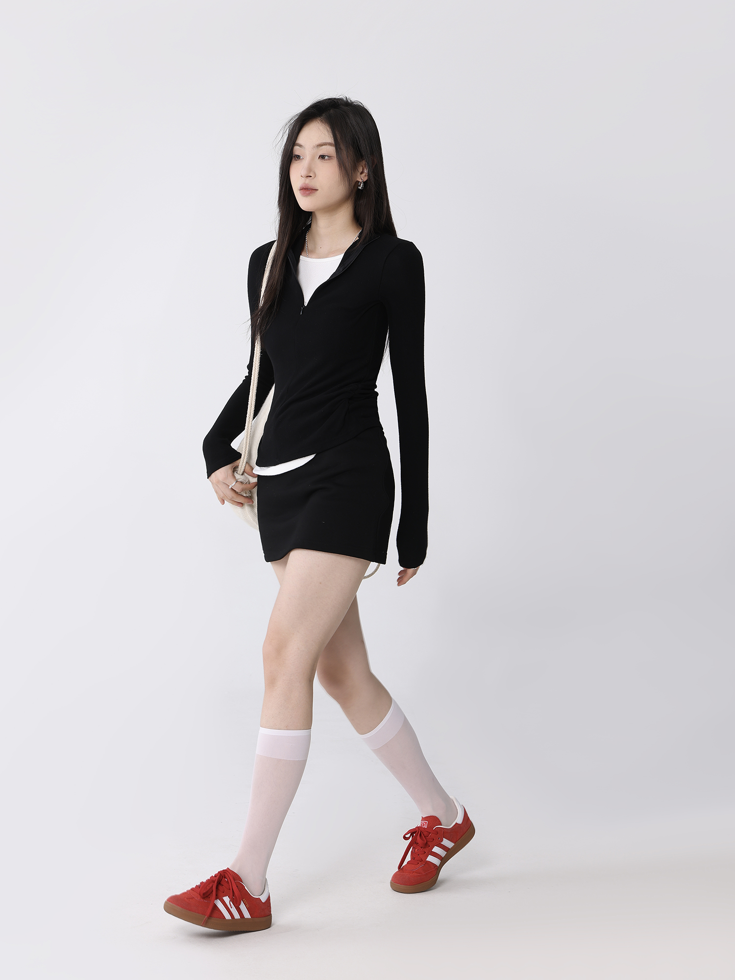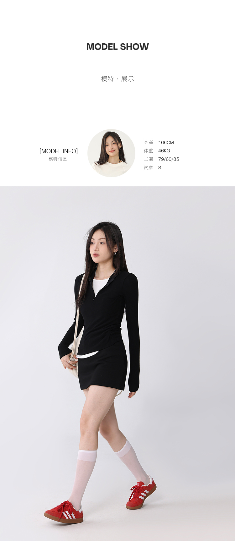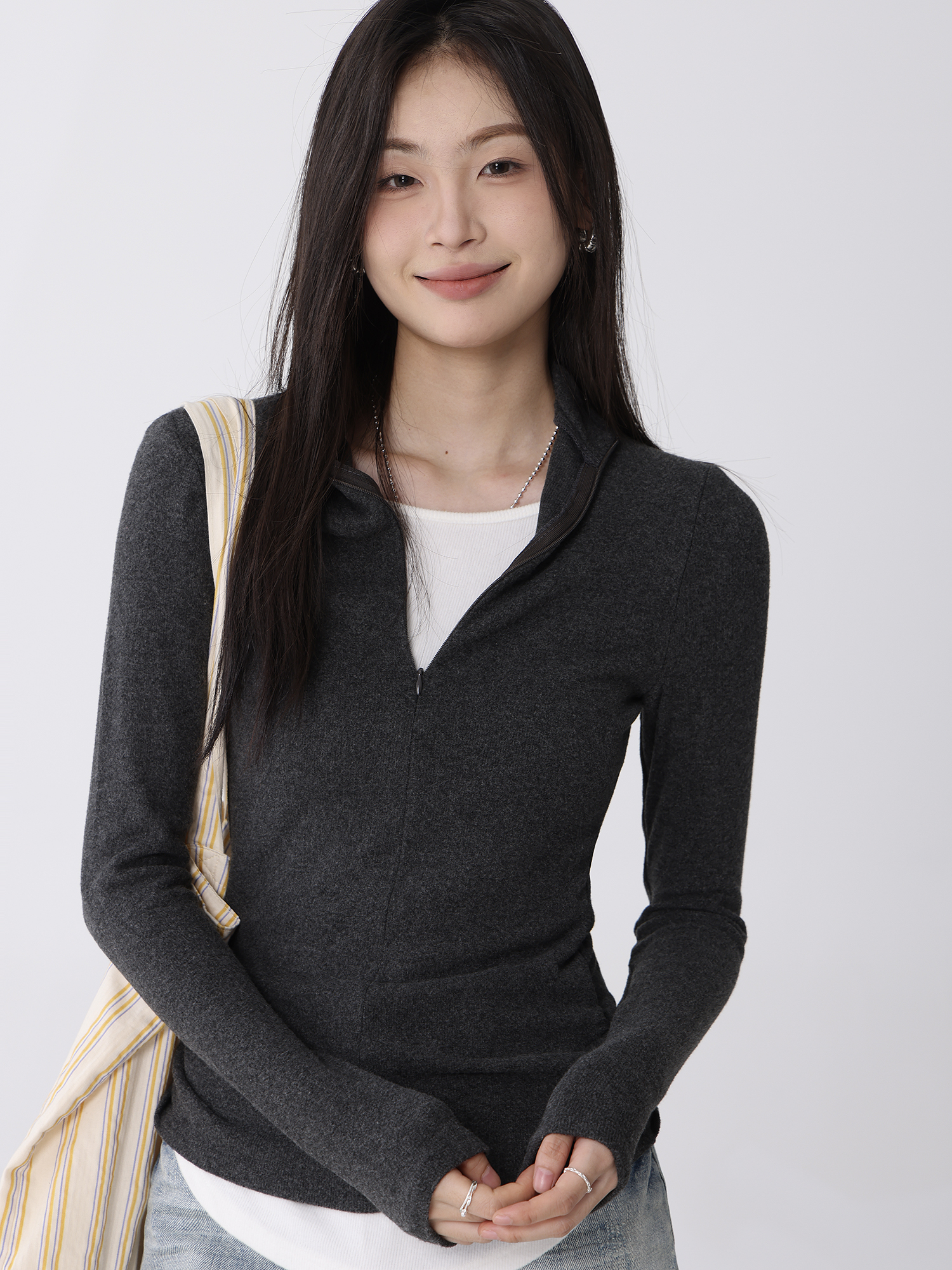 Creamsu敘白 修身內搭拉鍊v領假兩件長袖打底衫t恤2025秋款上衣女