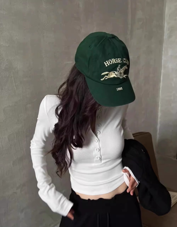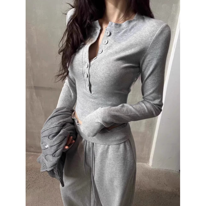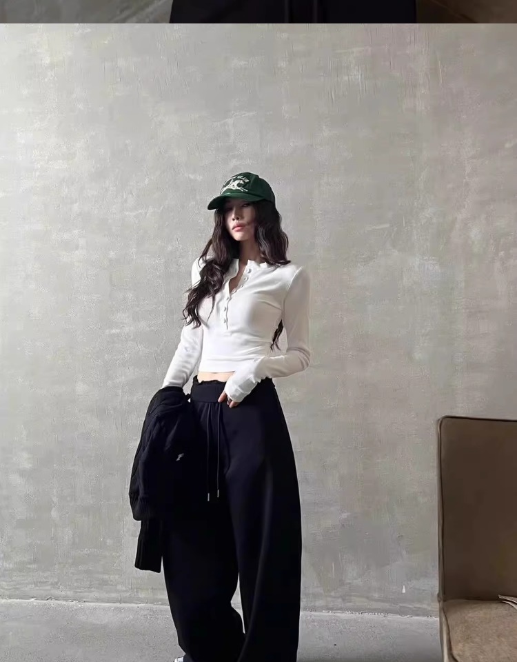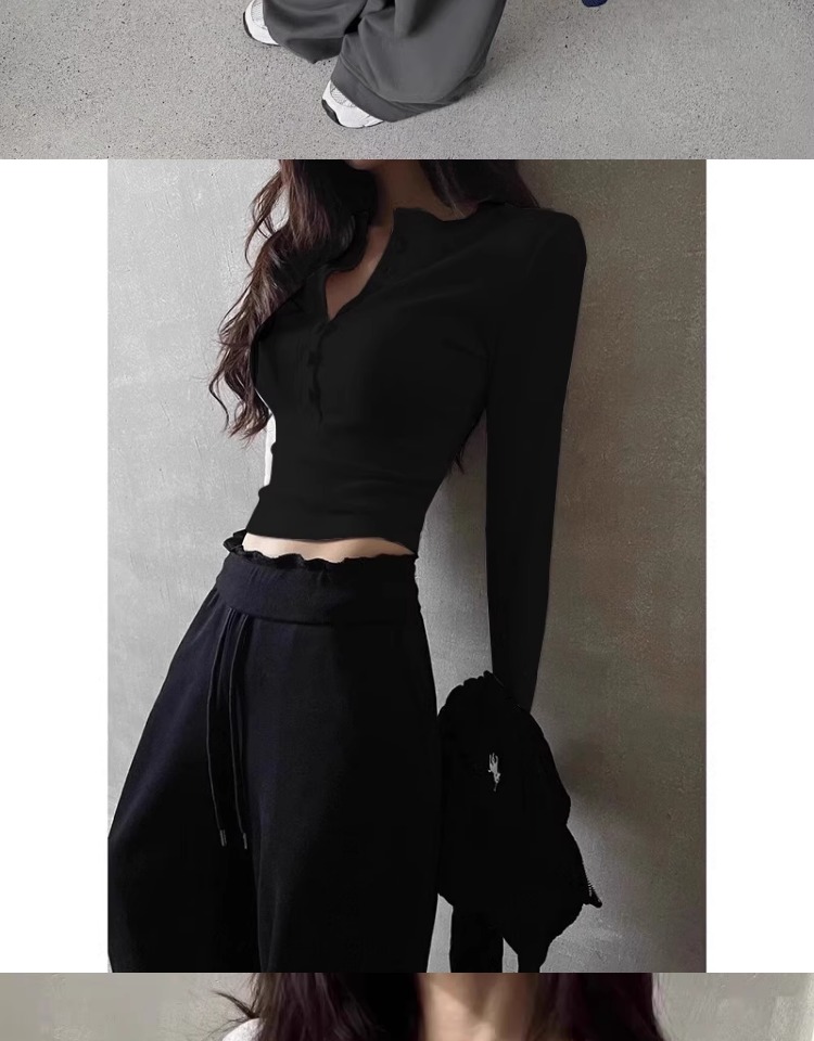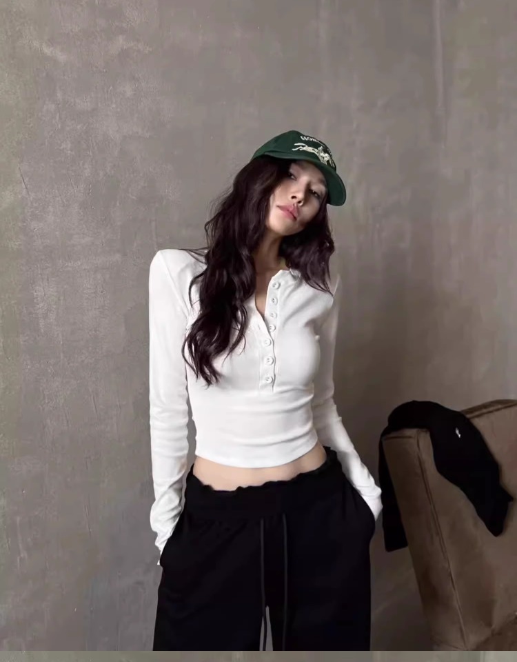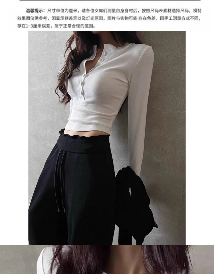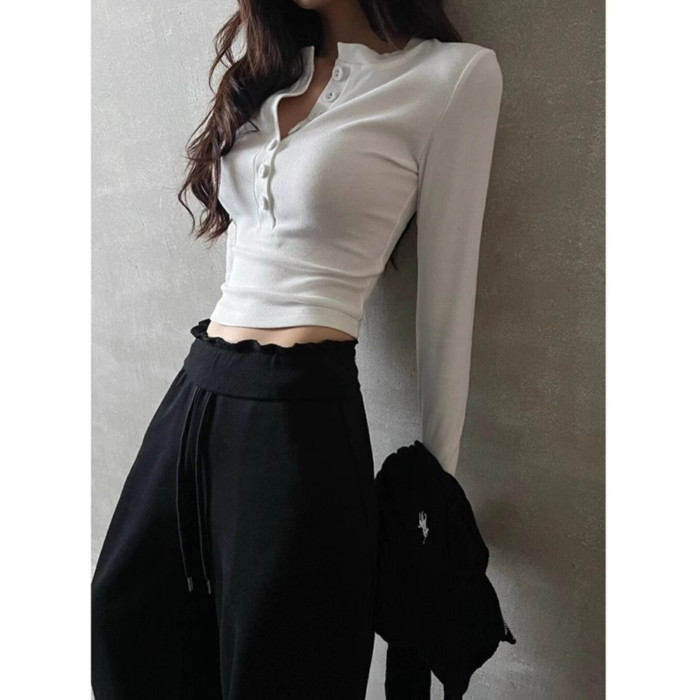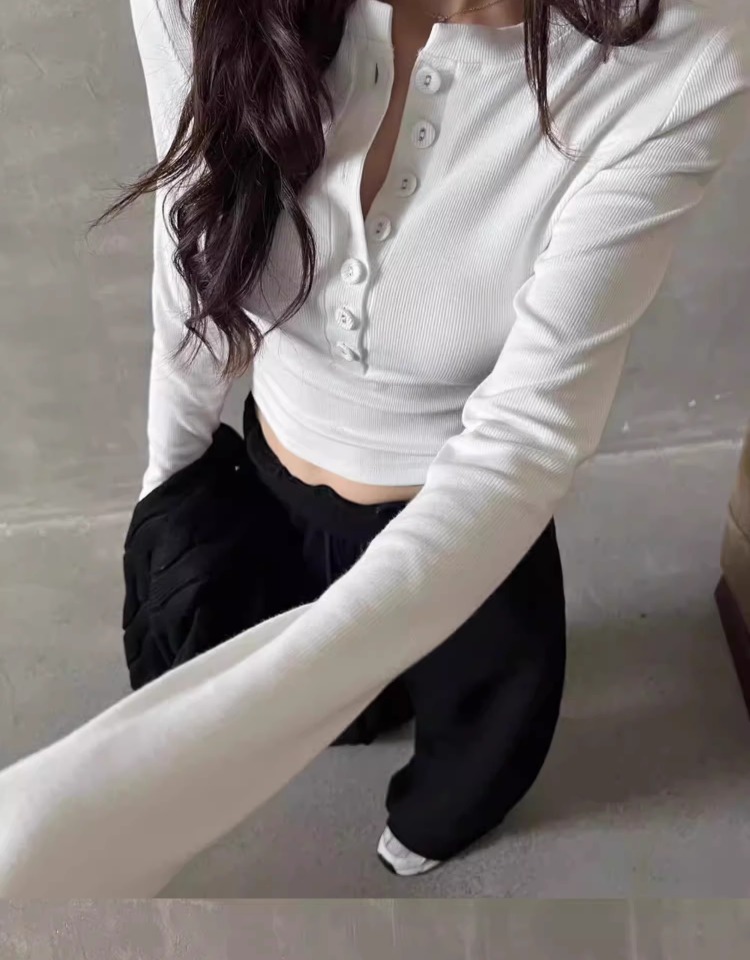 v領排釦修身設計感上衣女春秋白色棉質內搭長袖打底衫短款正肩T恤