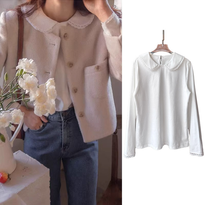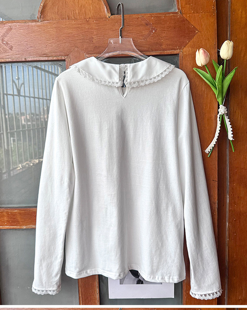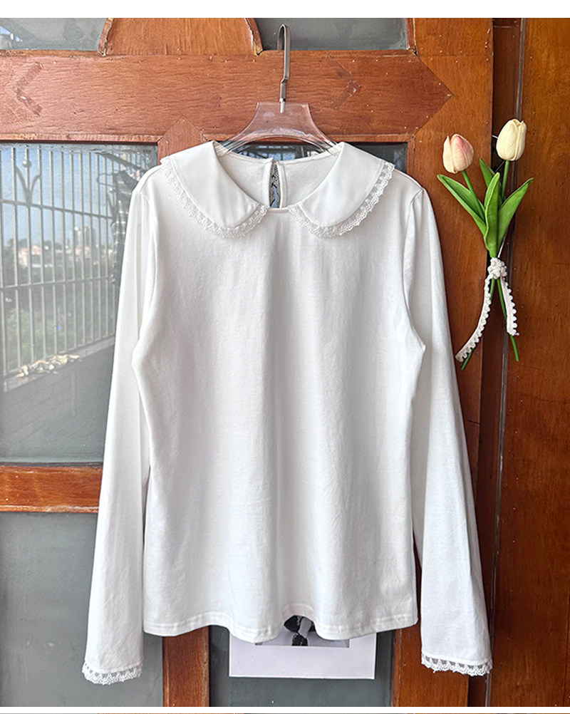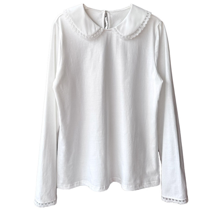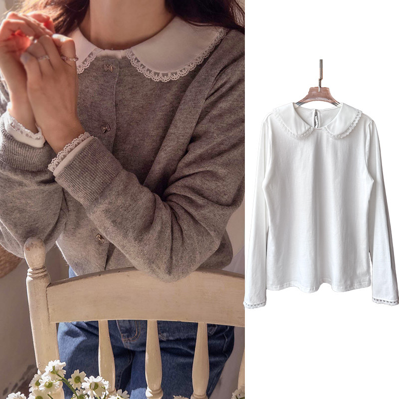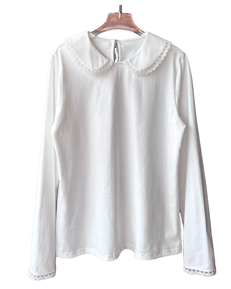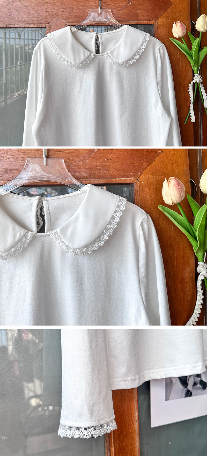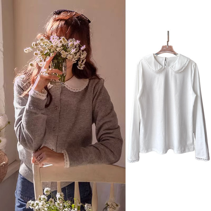 純棉蕾絲花邊拼接翻領娃娃領長袖打底衫T恤女上衣寬松襯衫白色潮