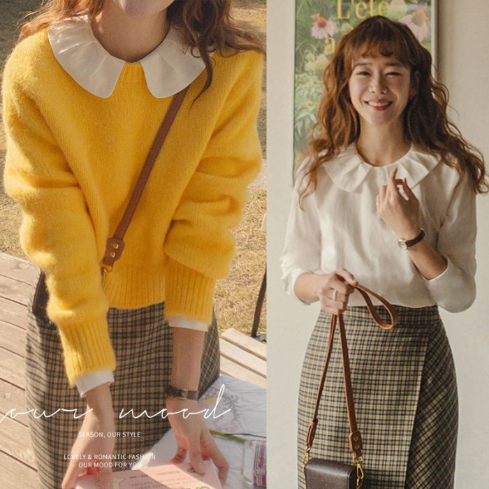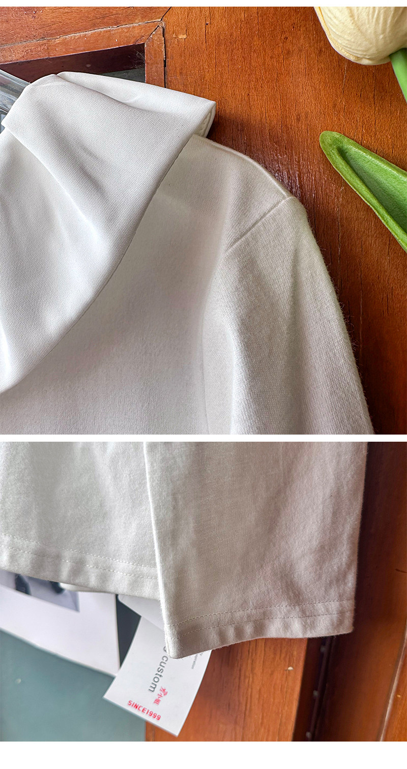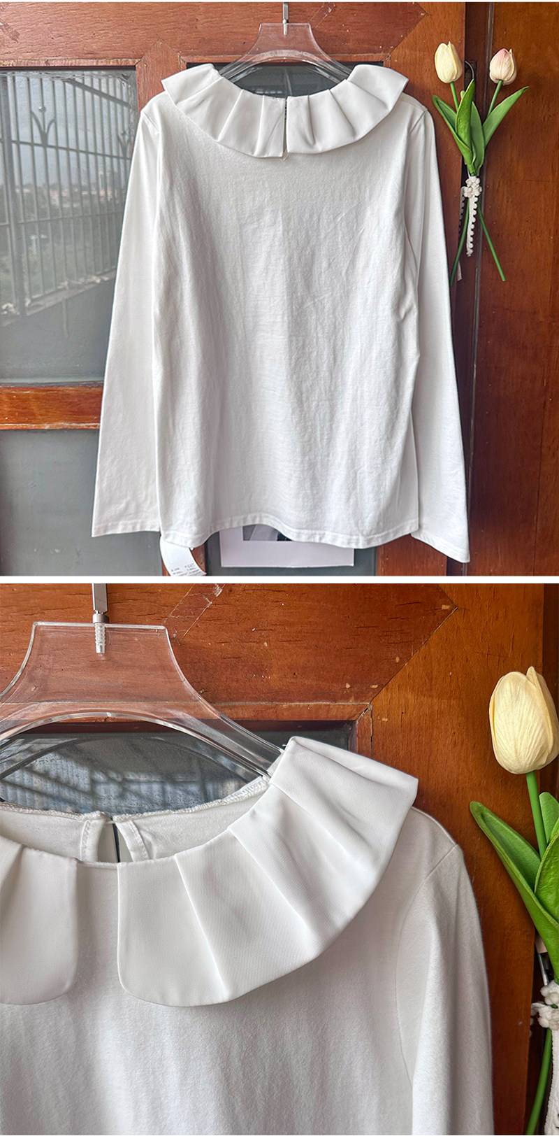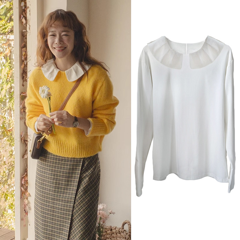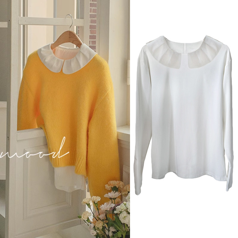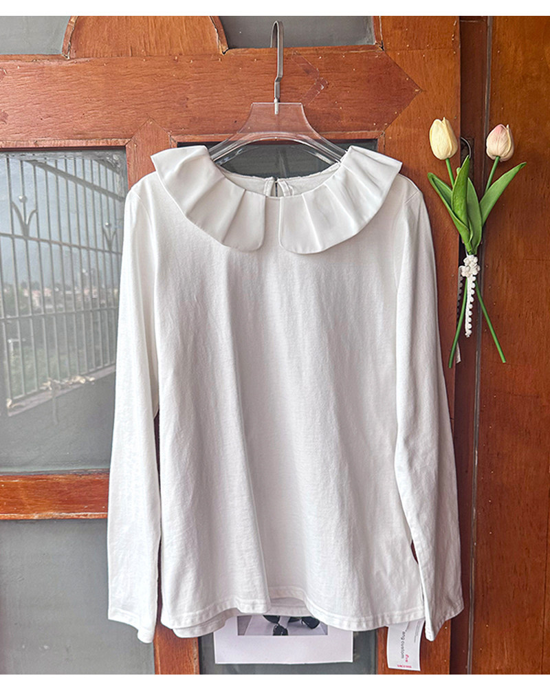 純棉蕾絲花邊拼接翻領娃娃領長袖打底衫T恤女上衣寬松襯衫白色潮