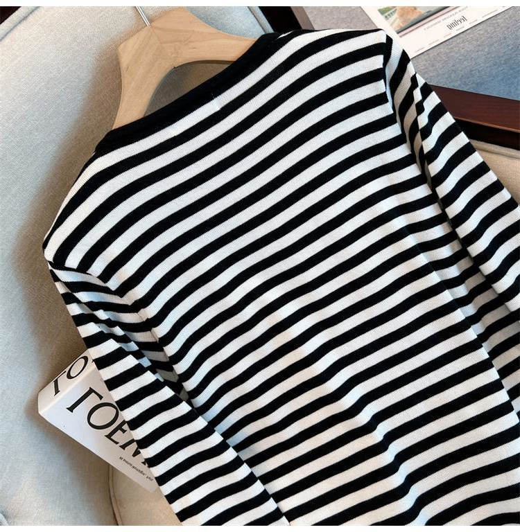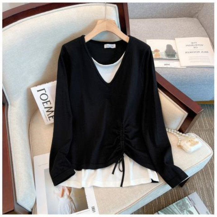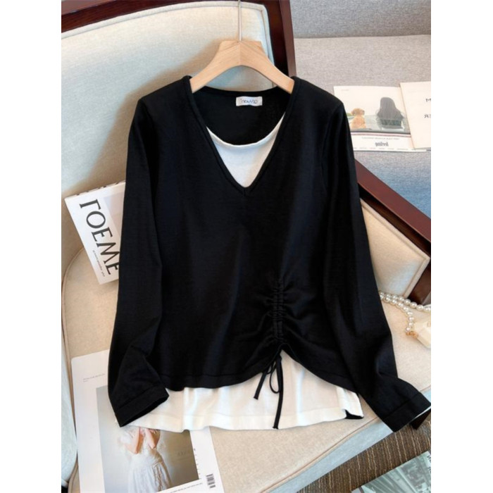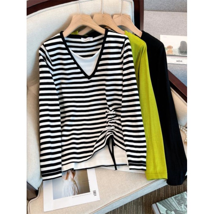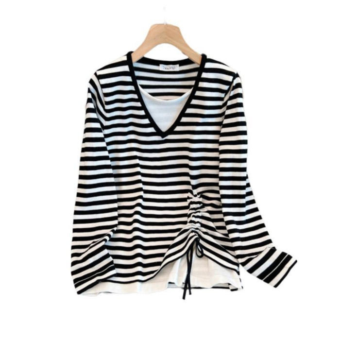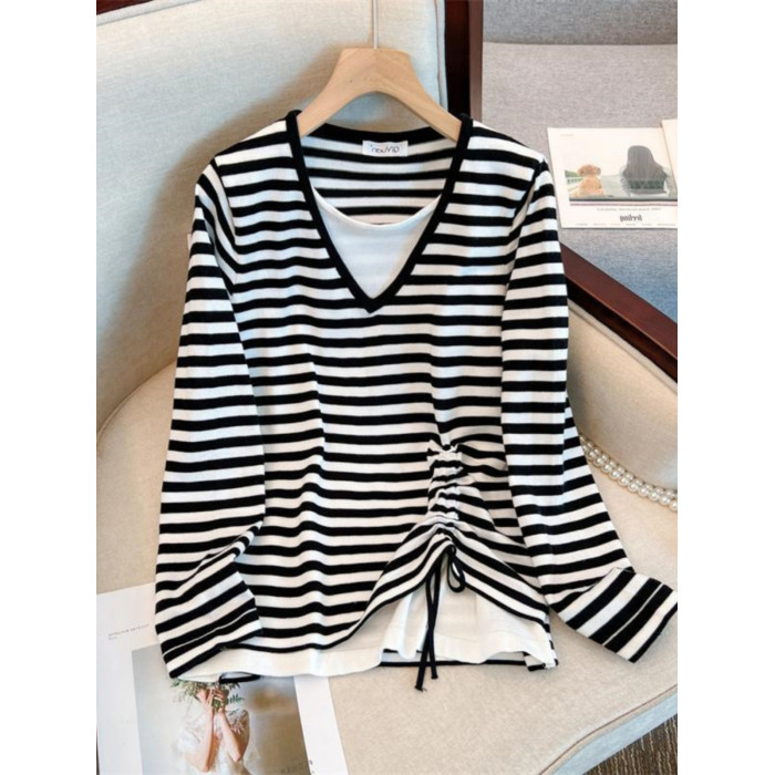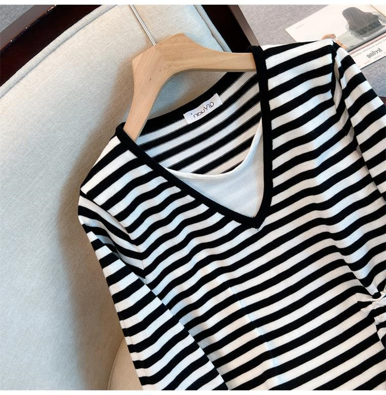 早秋季新款中長款拼接假兩件條紋設計感胖MM2-300斤超大碼上衣T恤