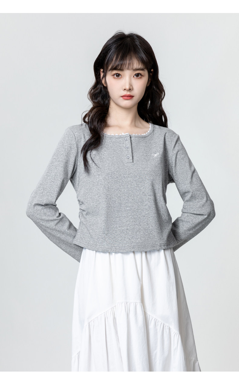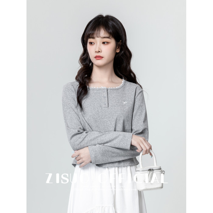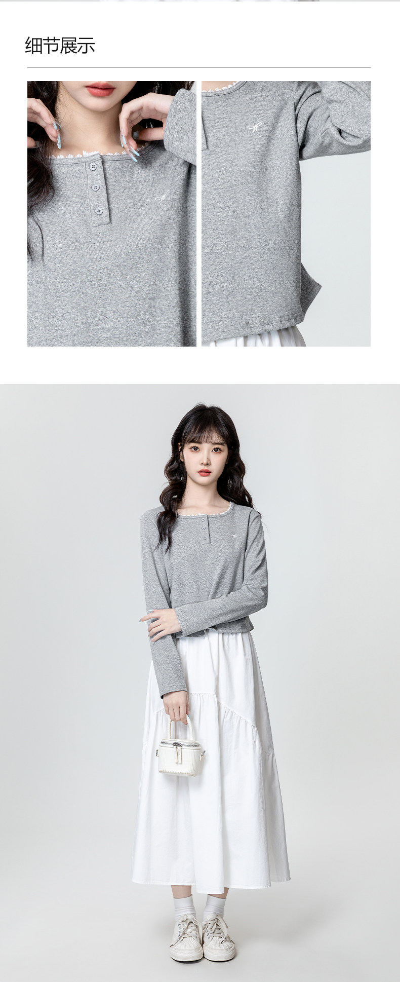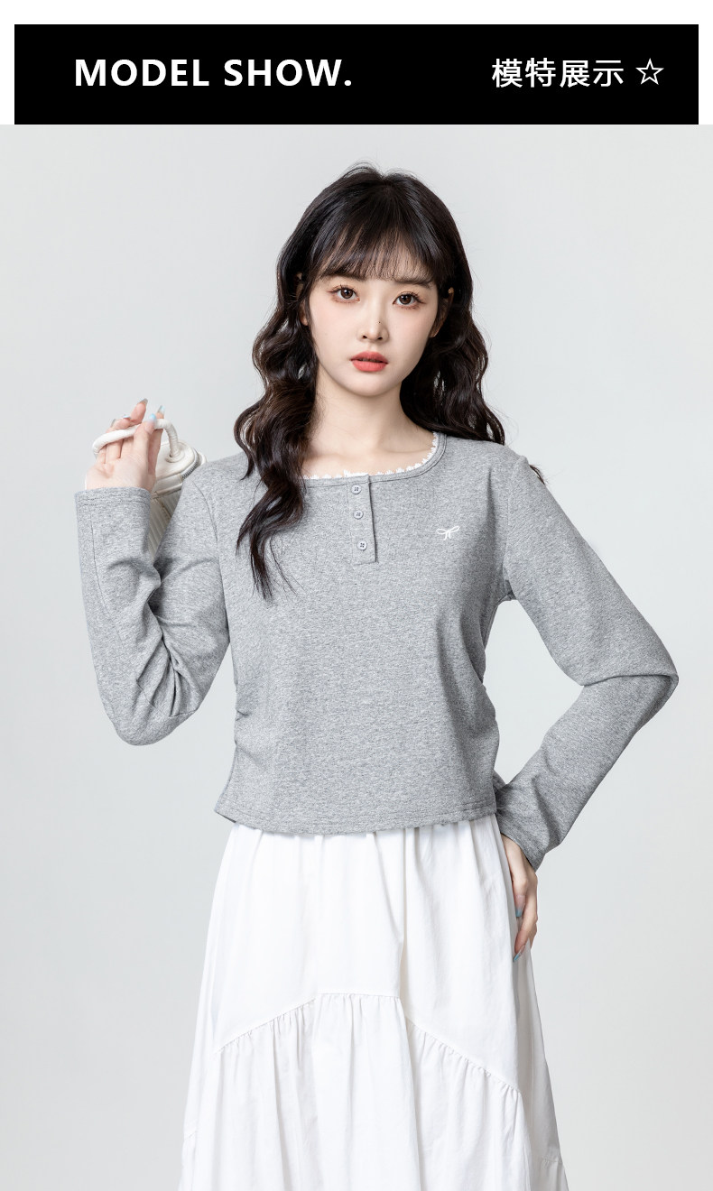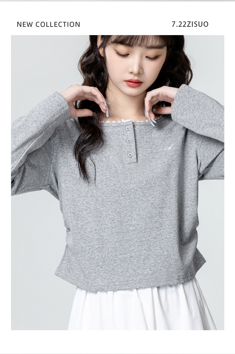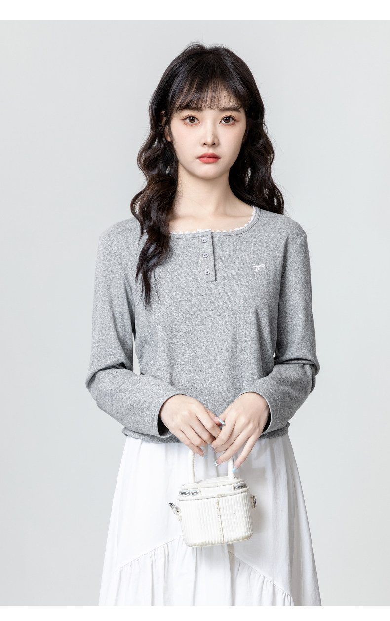 灰色長袖t恤女2026春秋季新款韓版蕾絲邊內搭打底衫顯瘦短款上衣