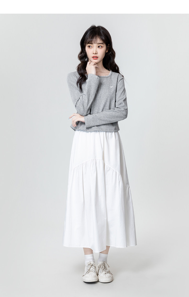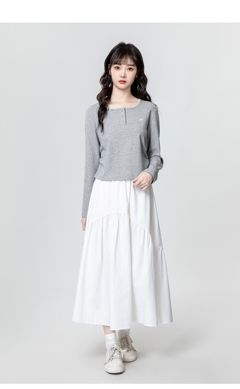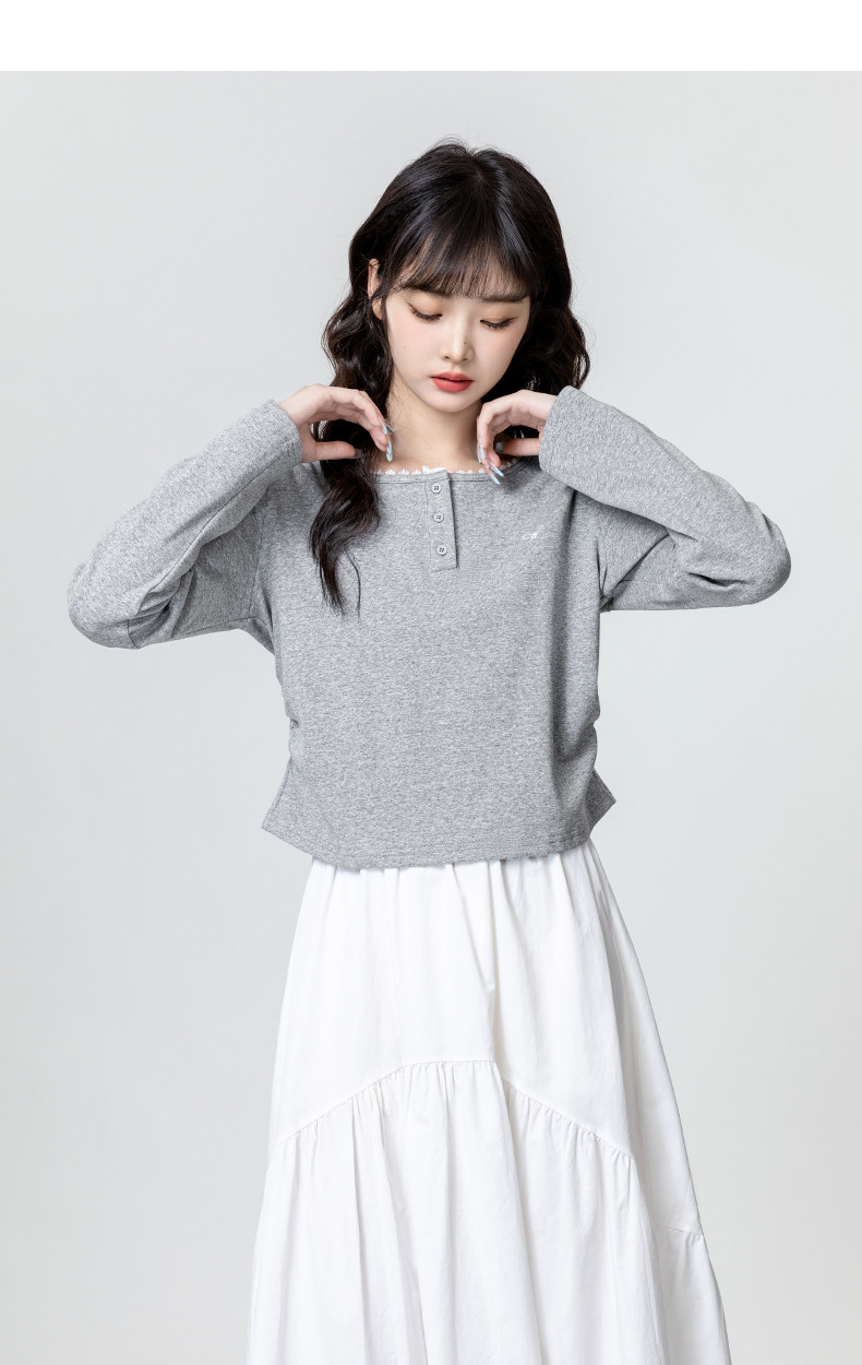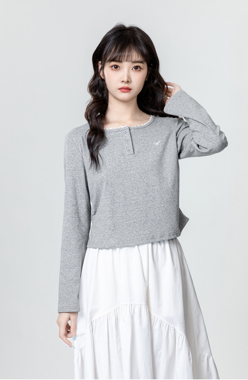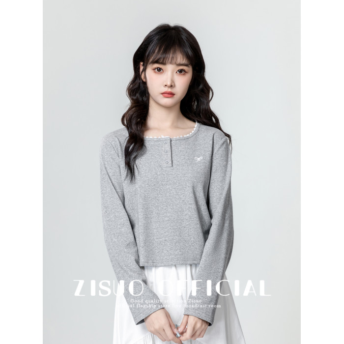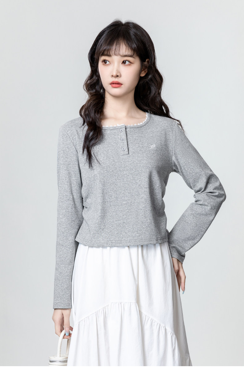 灰色長袖t恤女2026春秋季新款韓版蕾絲邊內搭打底衫顯瘦短款上衣