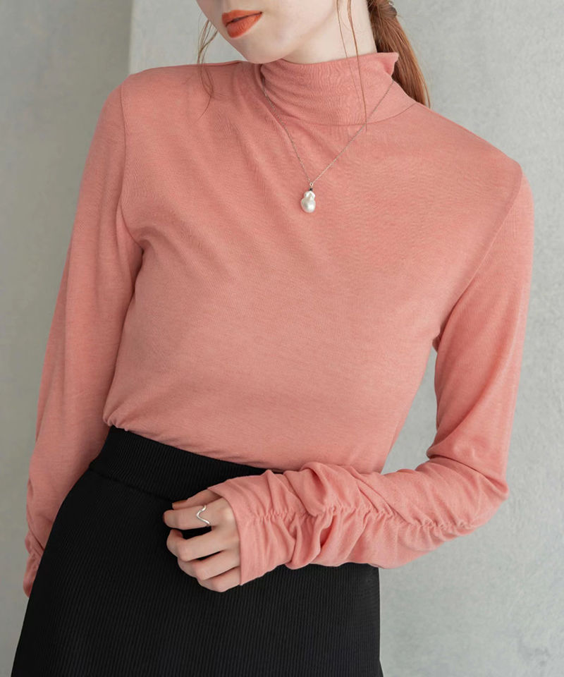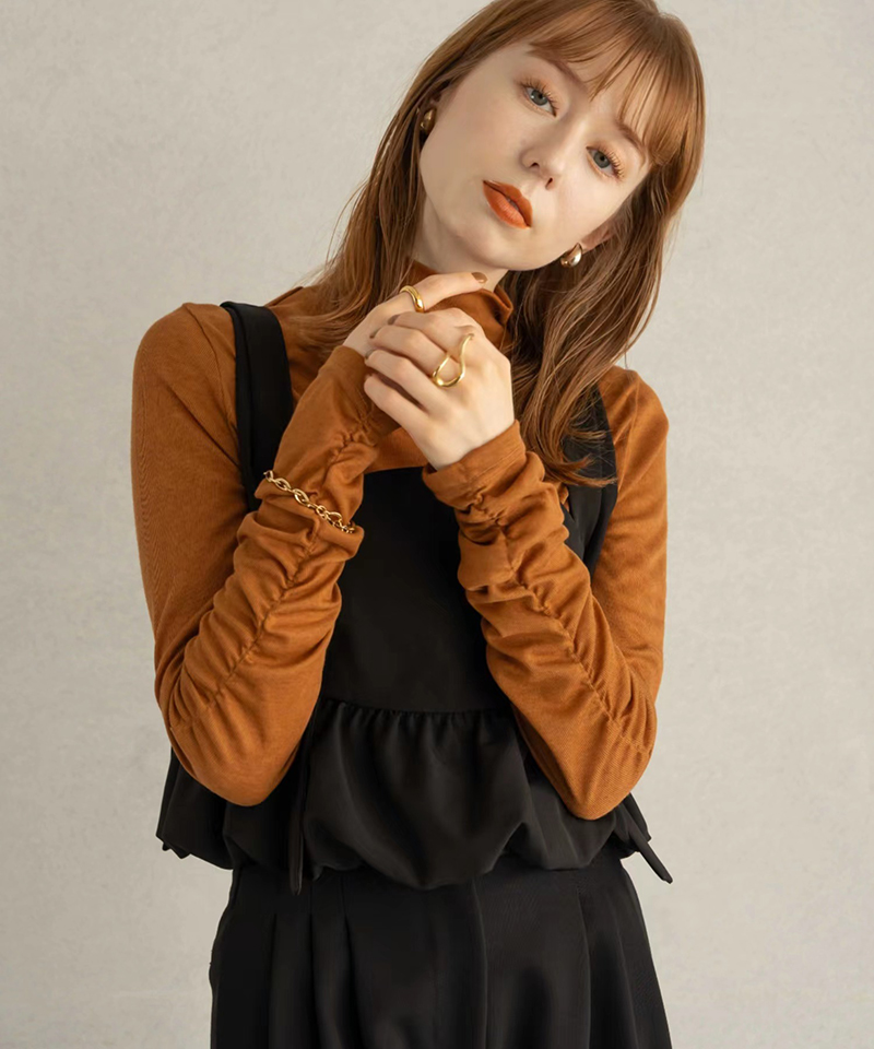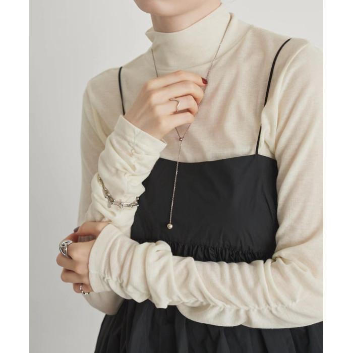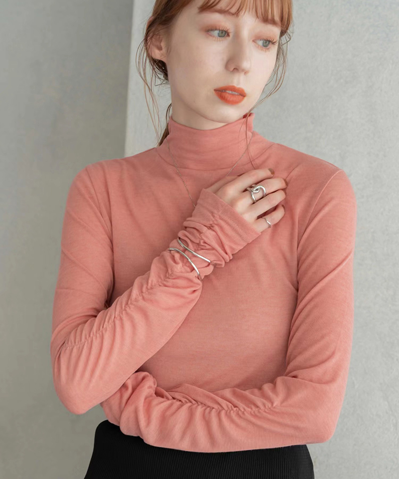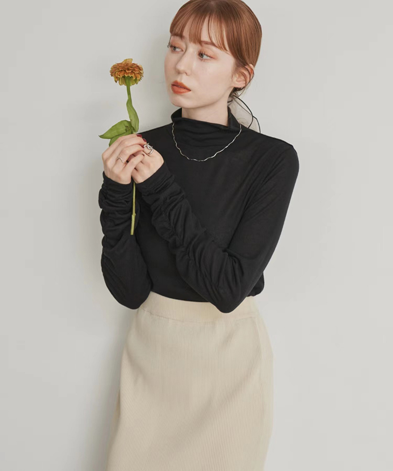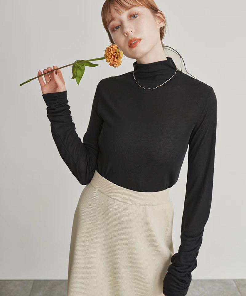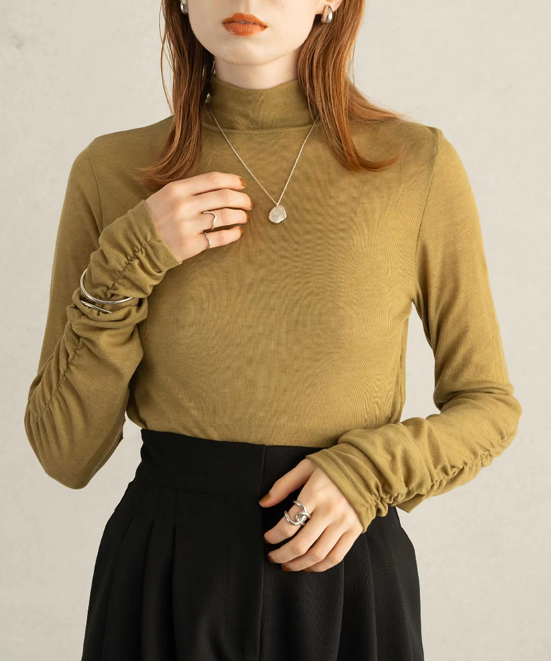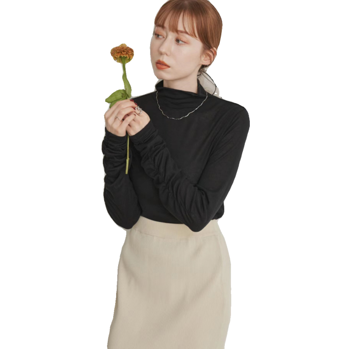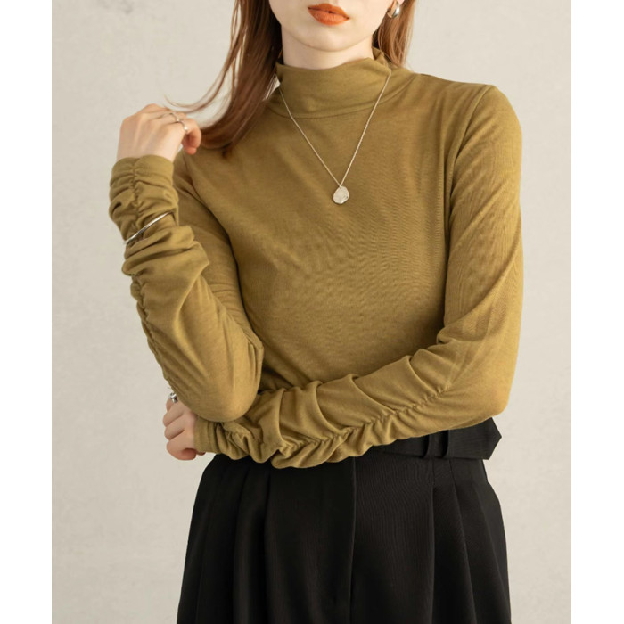 hin秋季新款薄款打底衫上衣女褶皺堆堆袖半高領上衣T恤女小衫