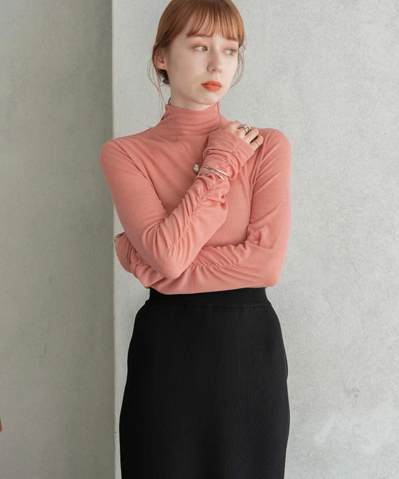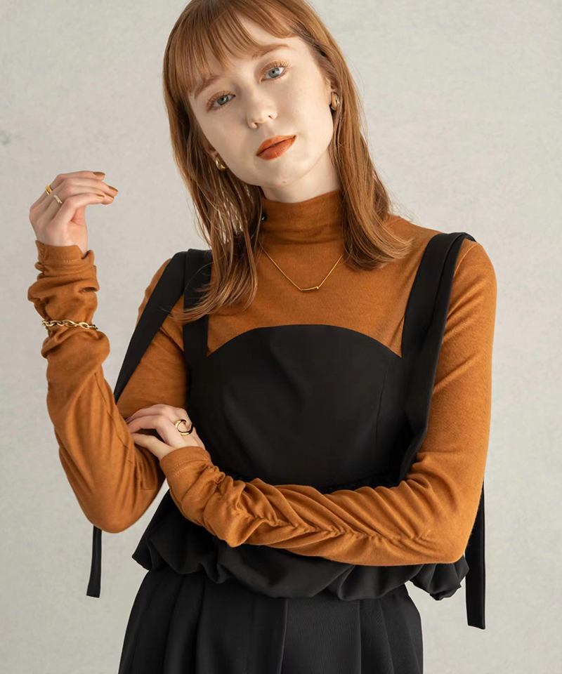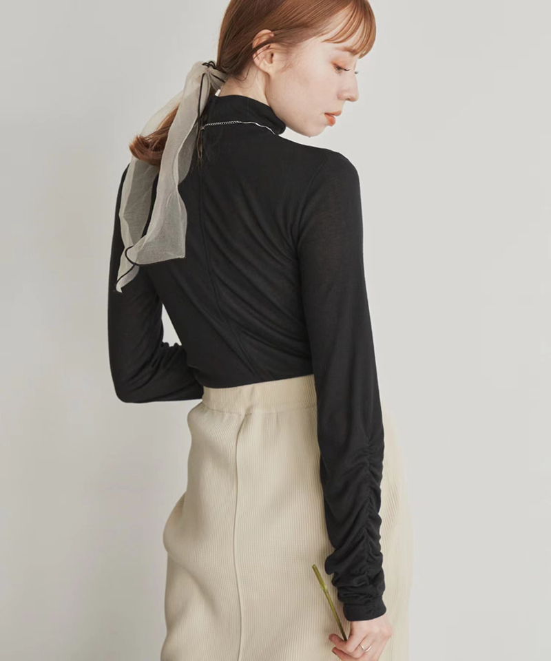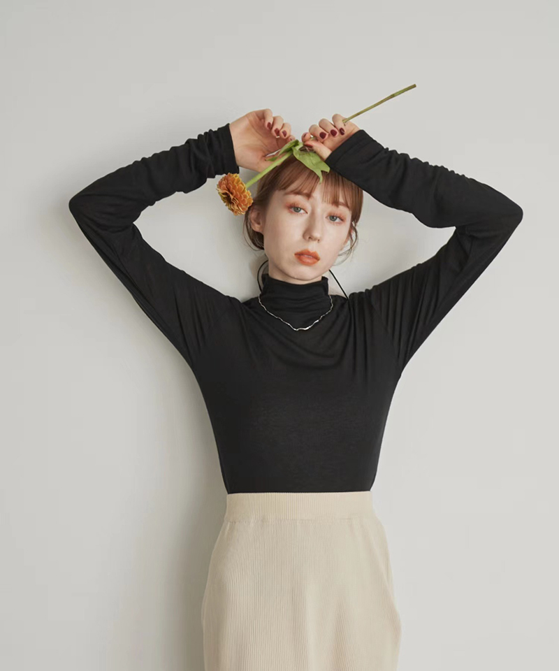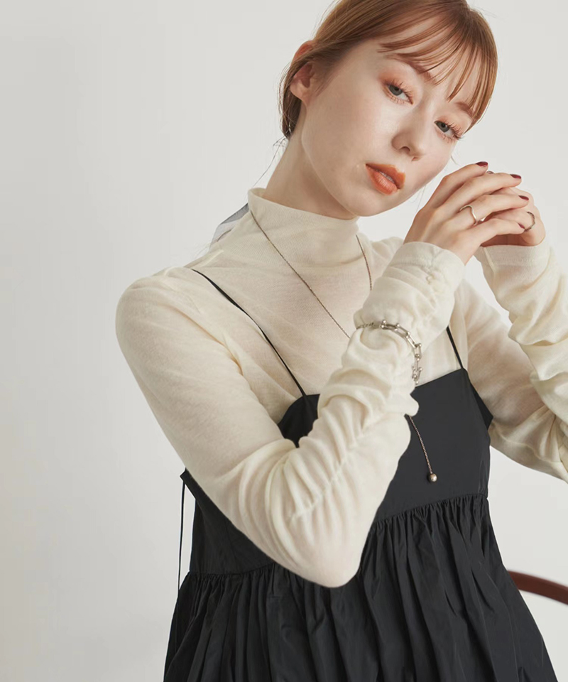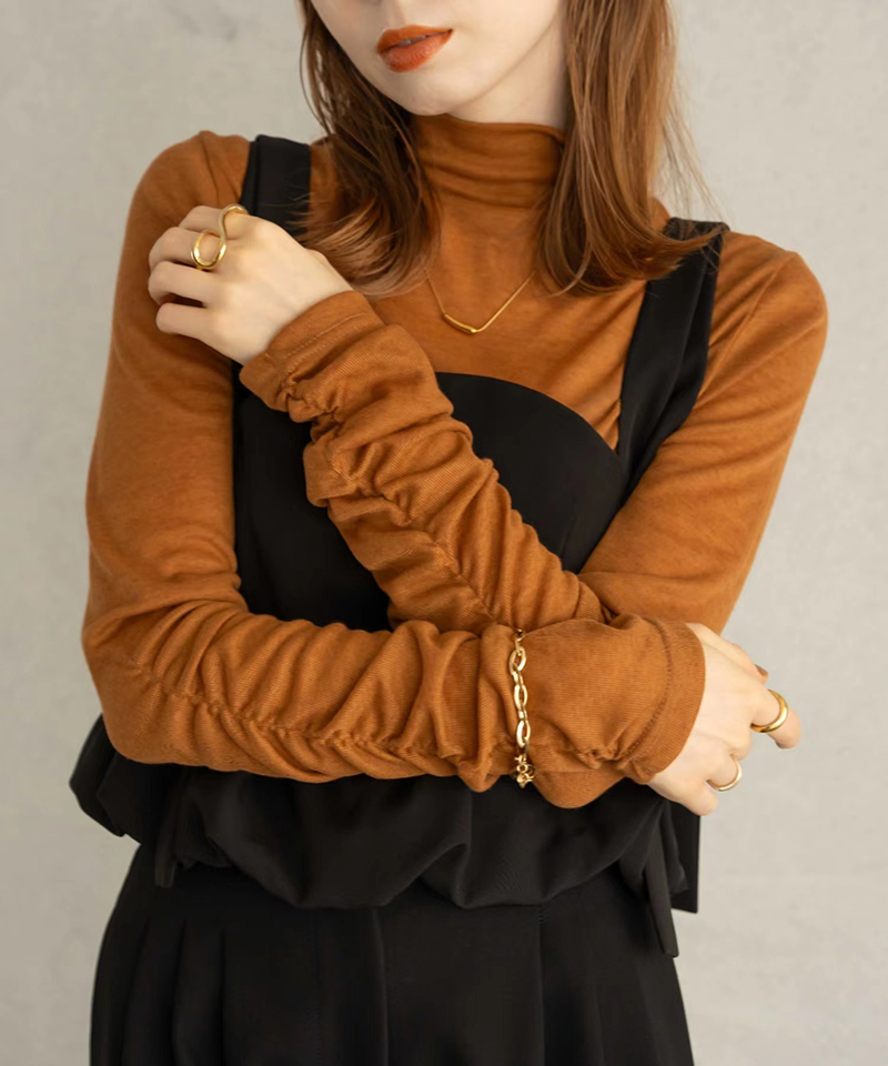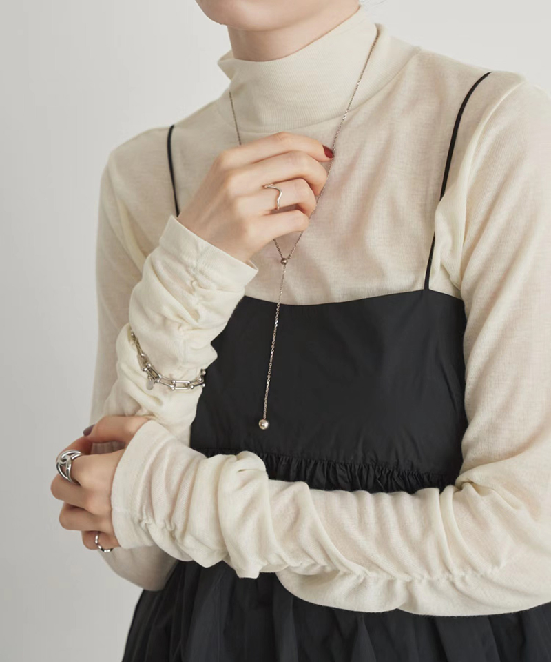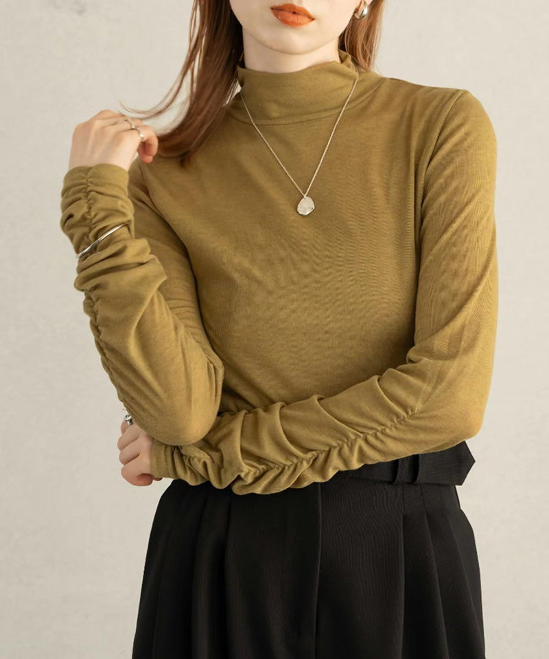 hin秋季新款薄款打底衫上衣女褶皺堆堆袖半高領上衣T恤女小衫