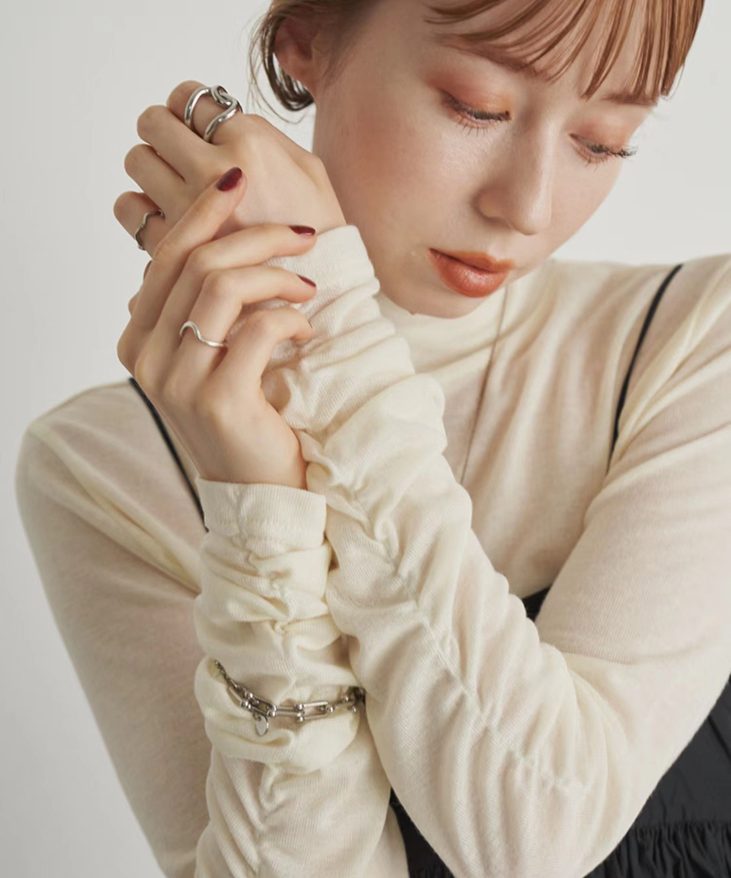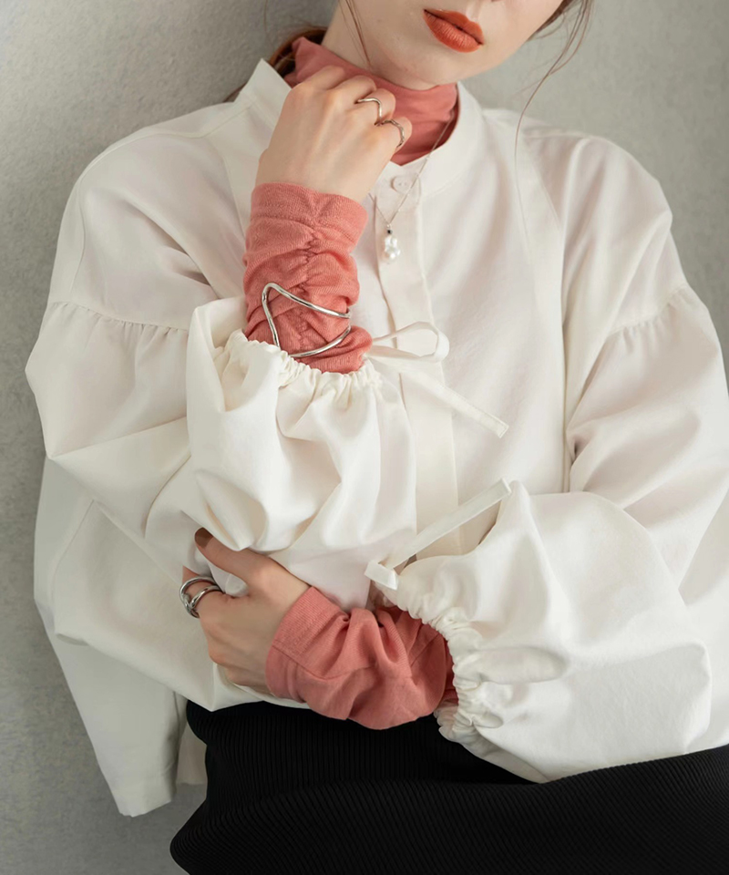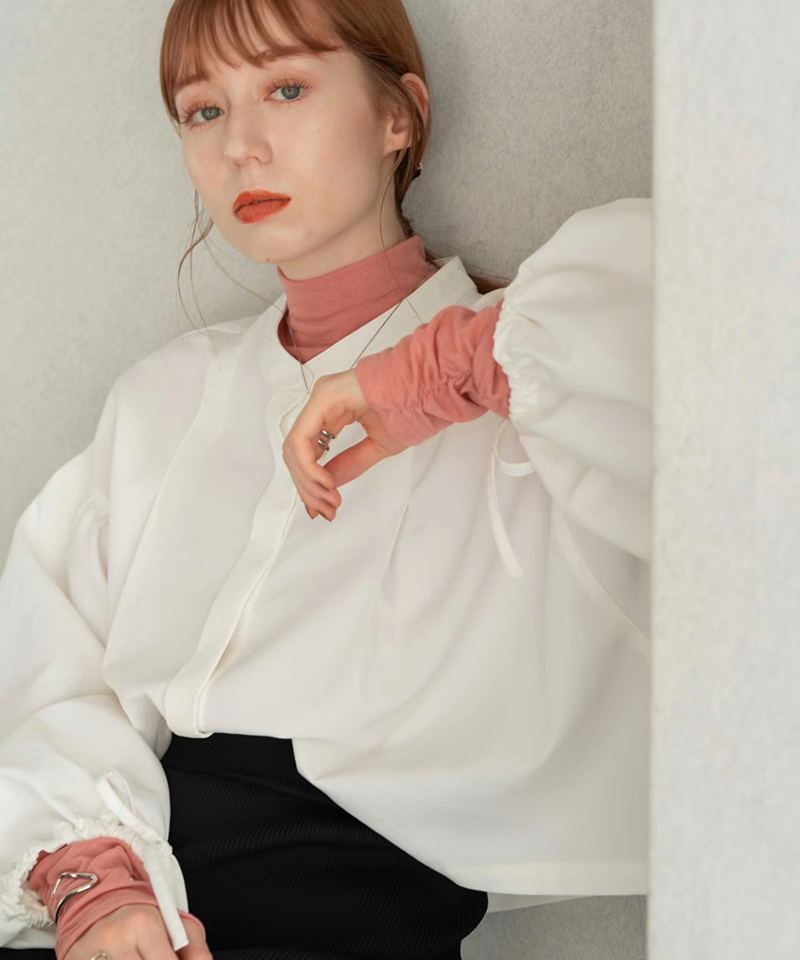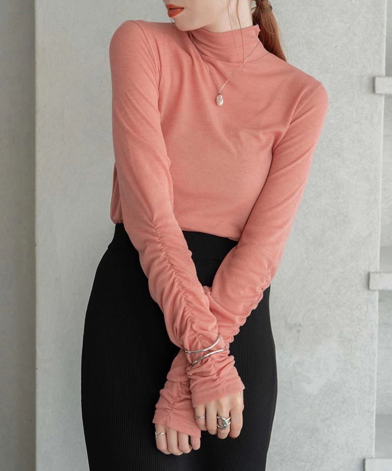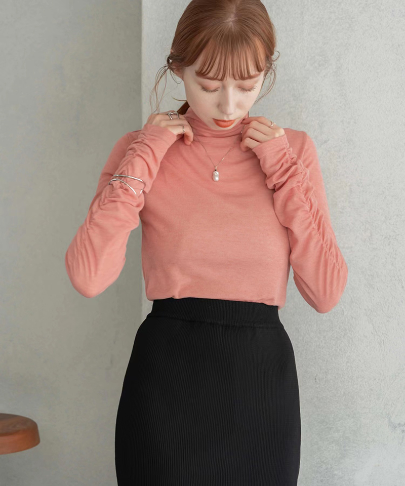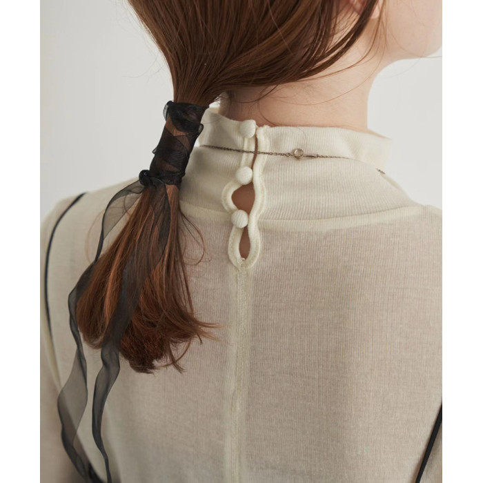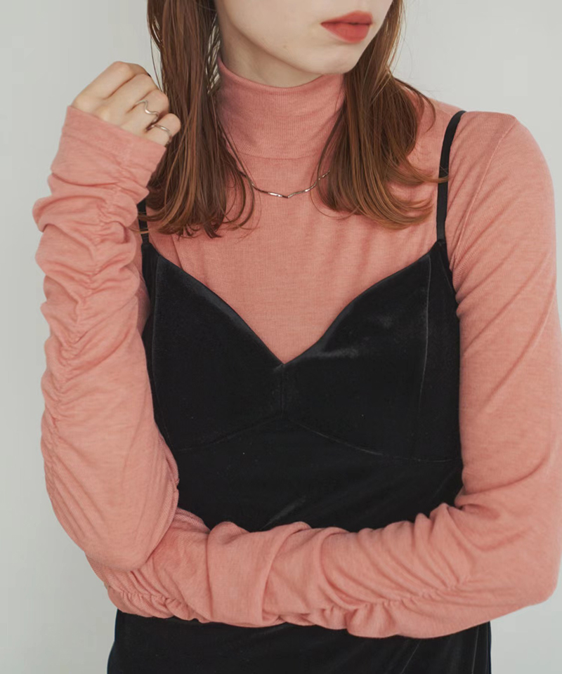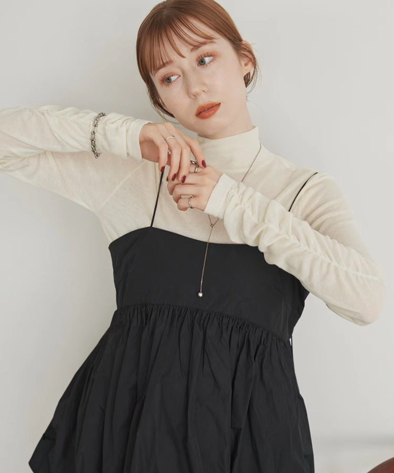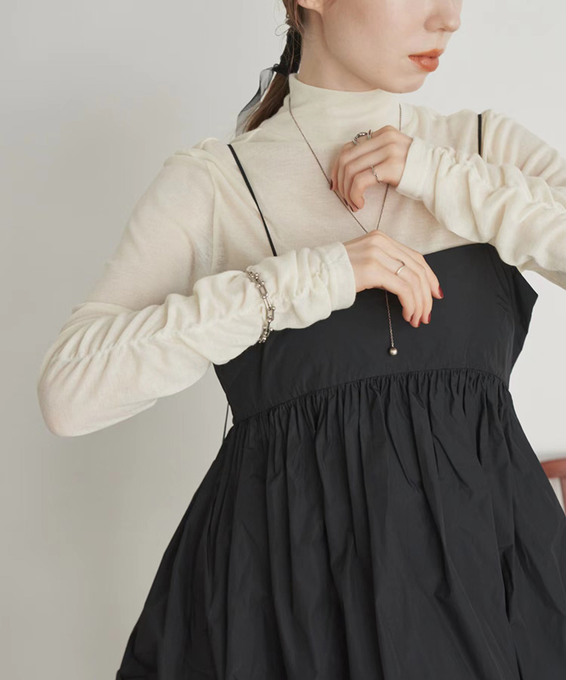 hin秋季新款薄款打底衫上衣女褶皺堆堆袖半高領上衣T恤女小衫