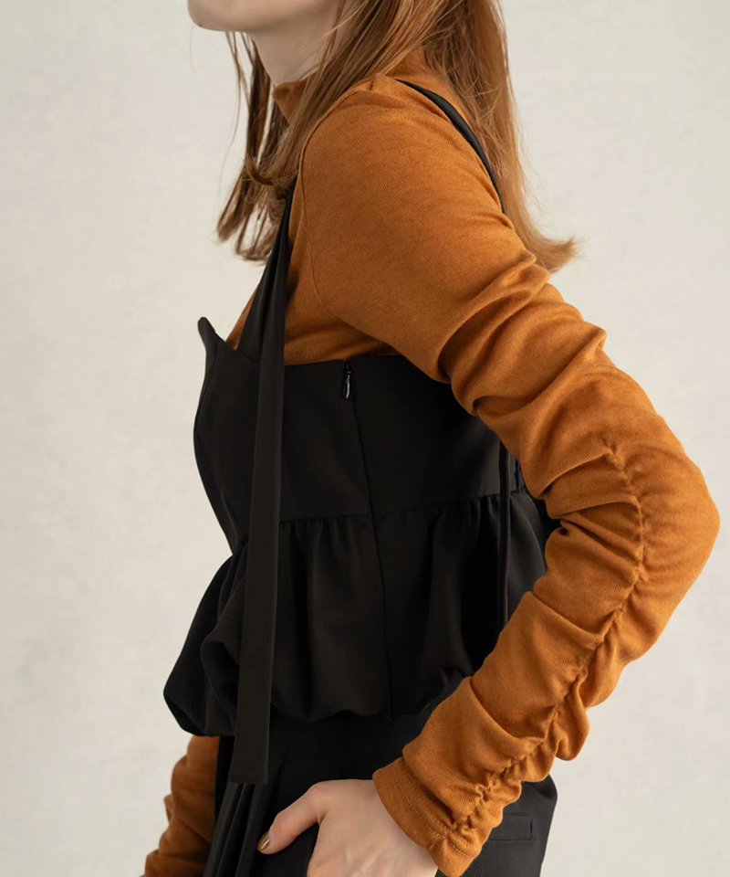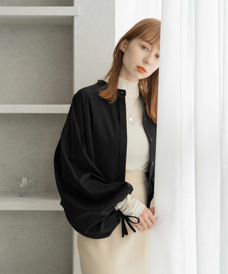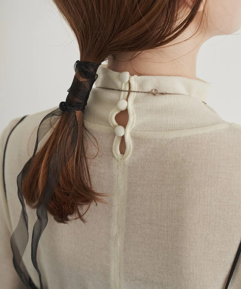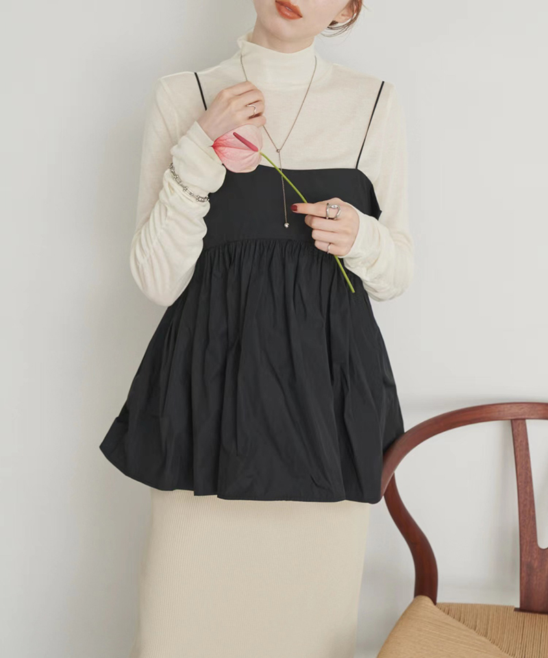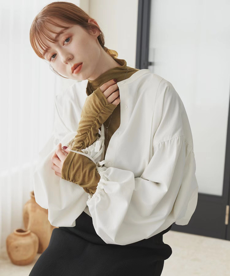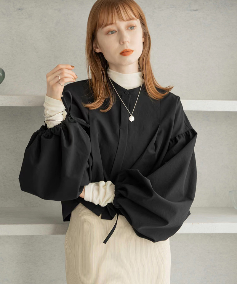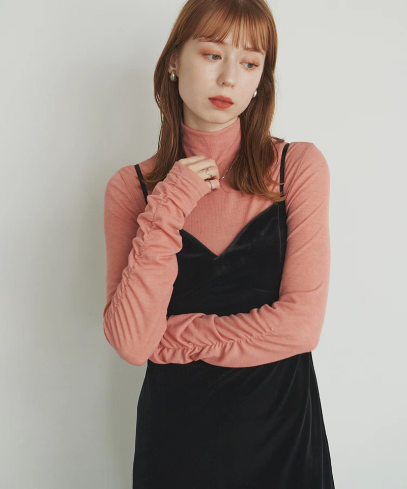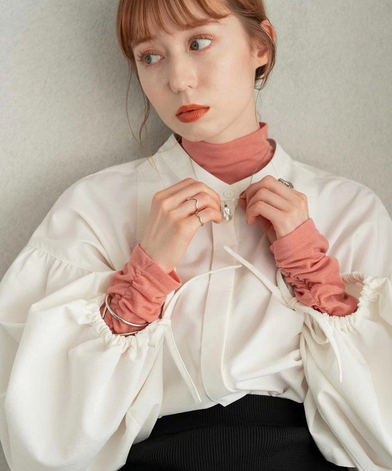hin秋季新款薄款打底衫上衣女褶皺堆堆袖半高領上衣T恤女小衫