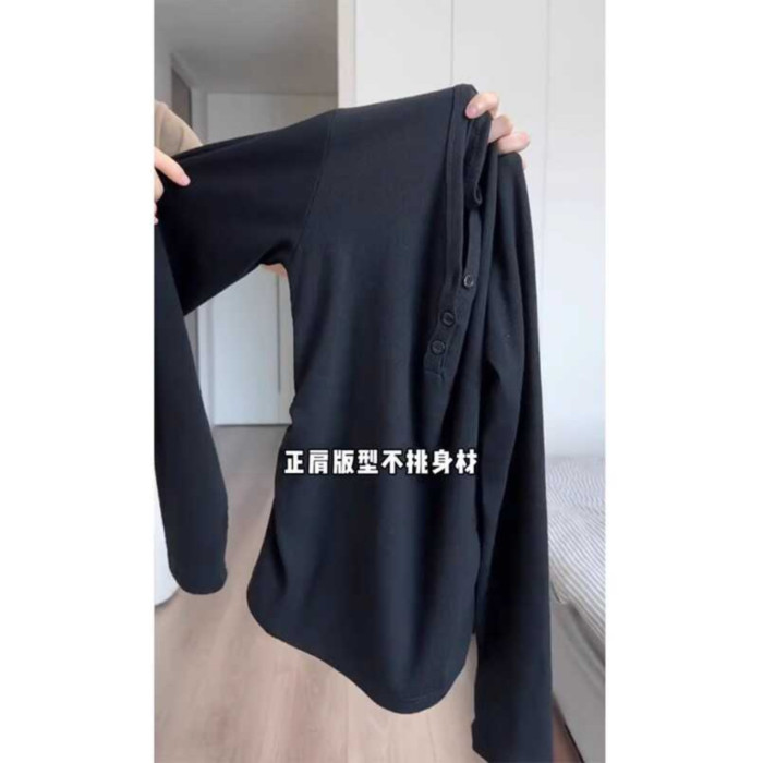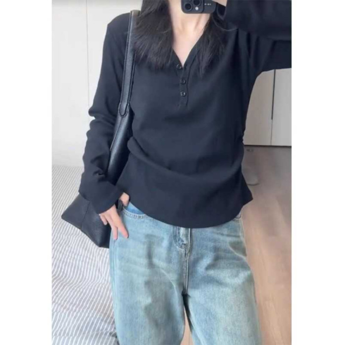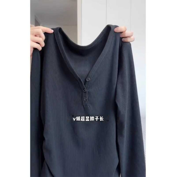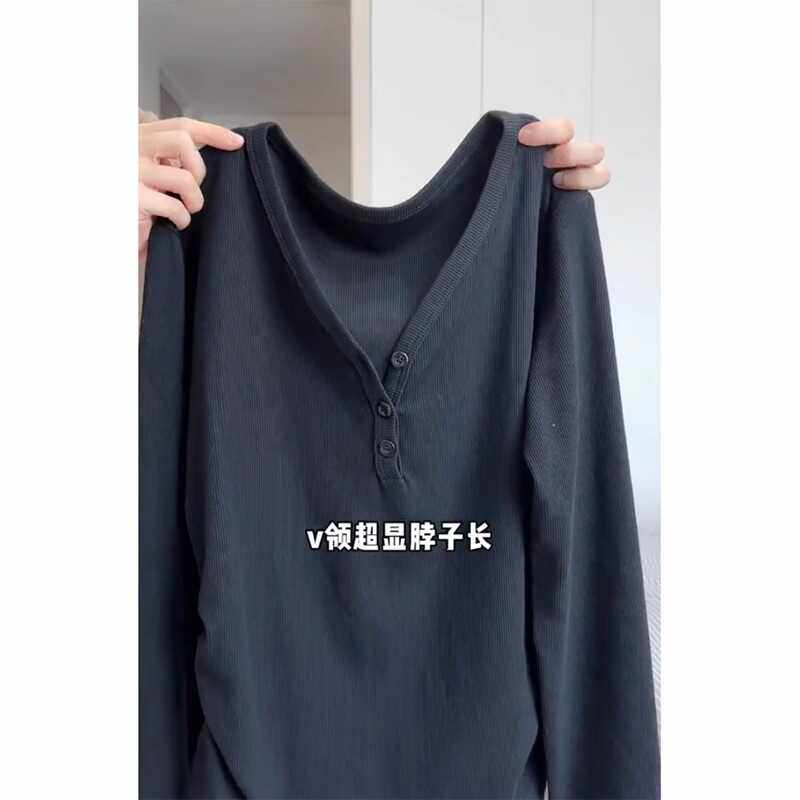 純棉不規則v領正肩長袖t恤打底衫女2025秋季洋氣內搭收腰上衣大碼