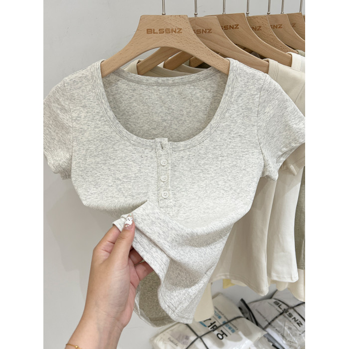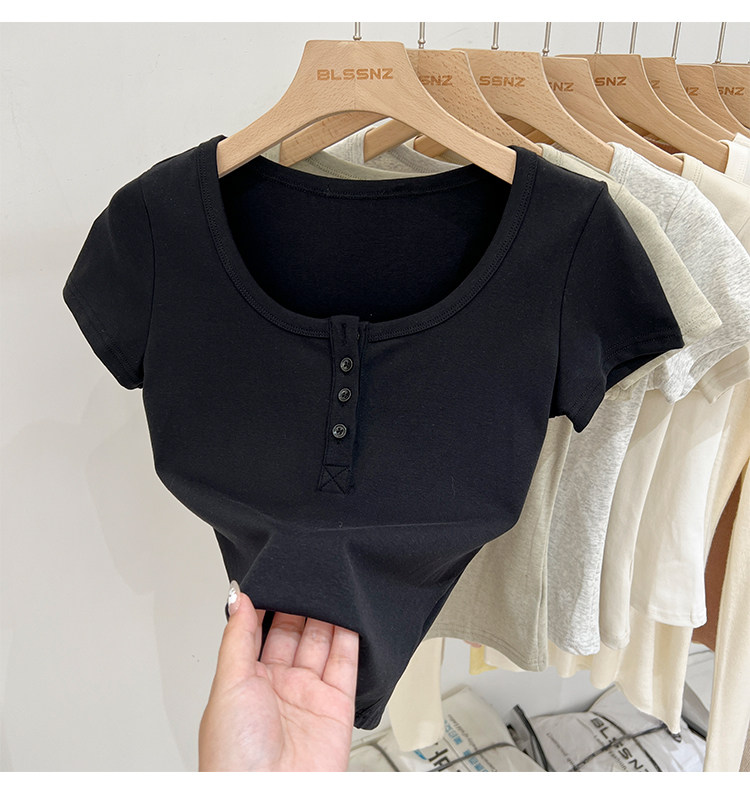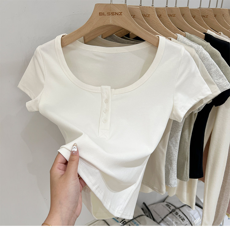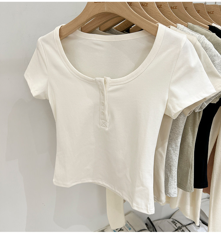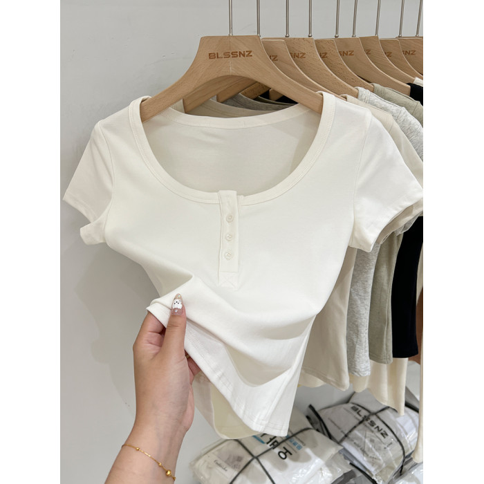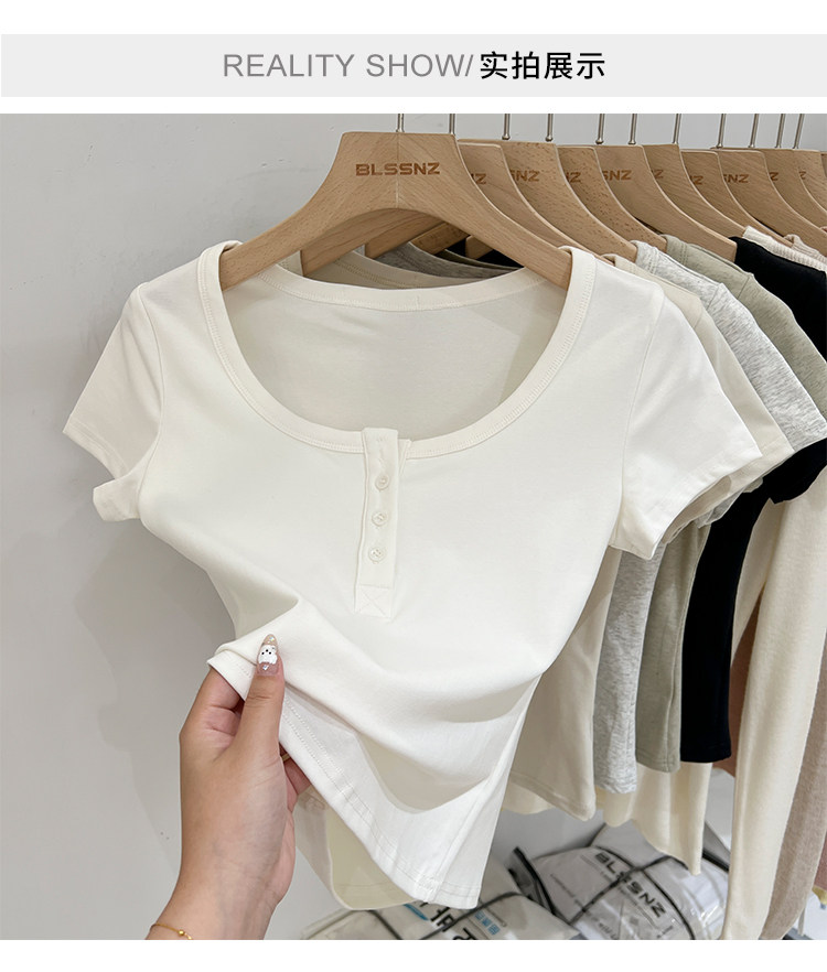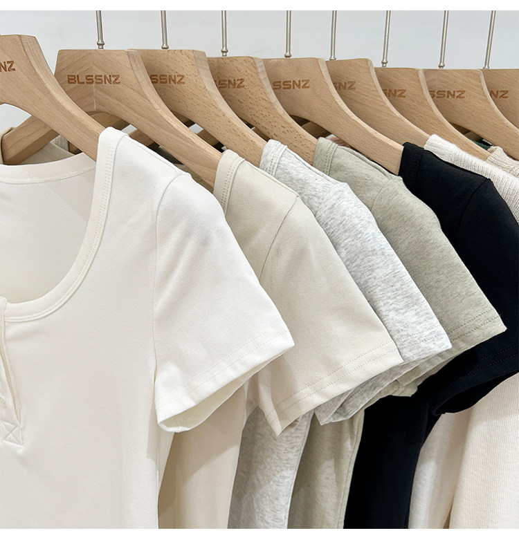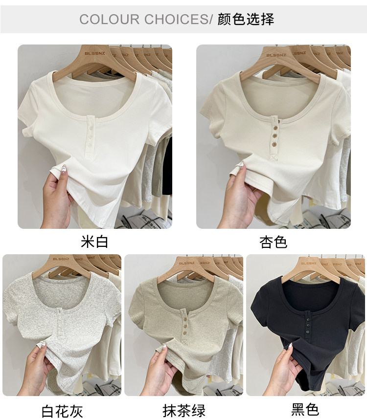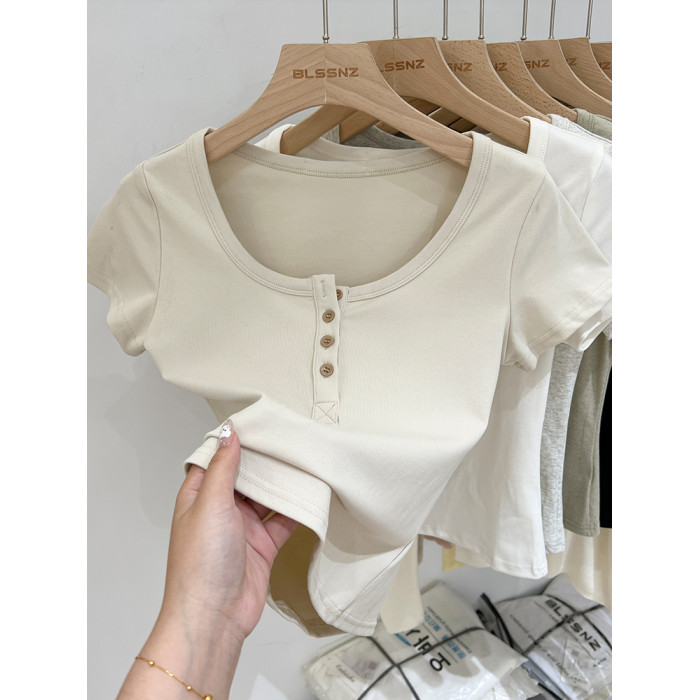 杏色純棉u領正肩短袖t恤女夏季2025新款純色修身短款上衣半袖體恤