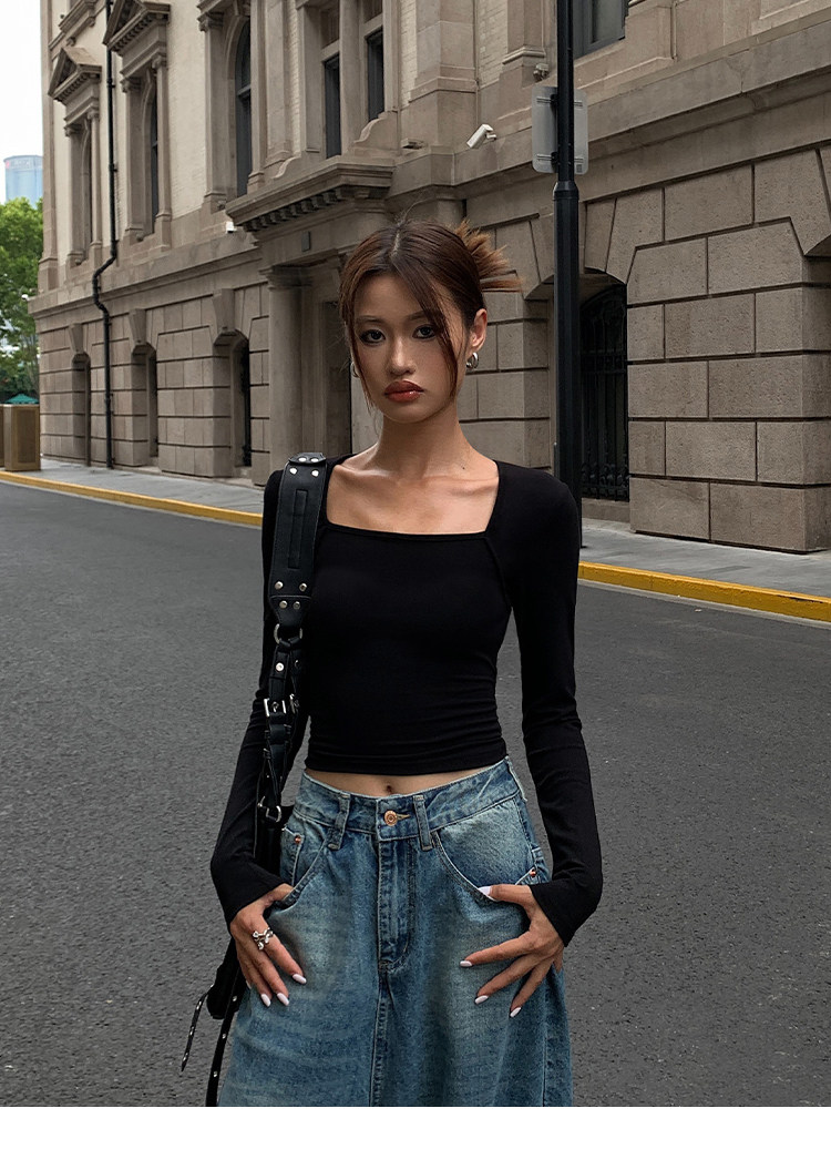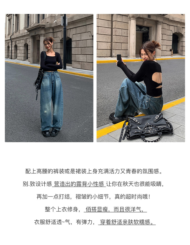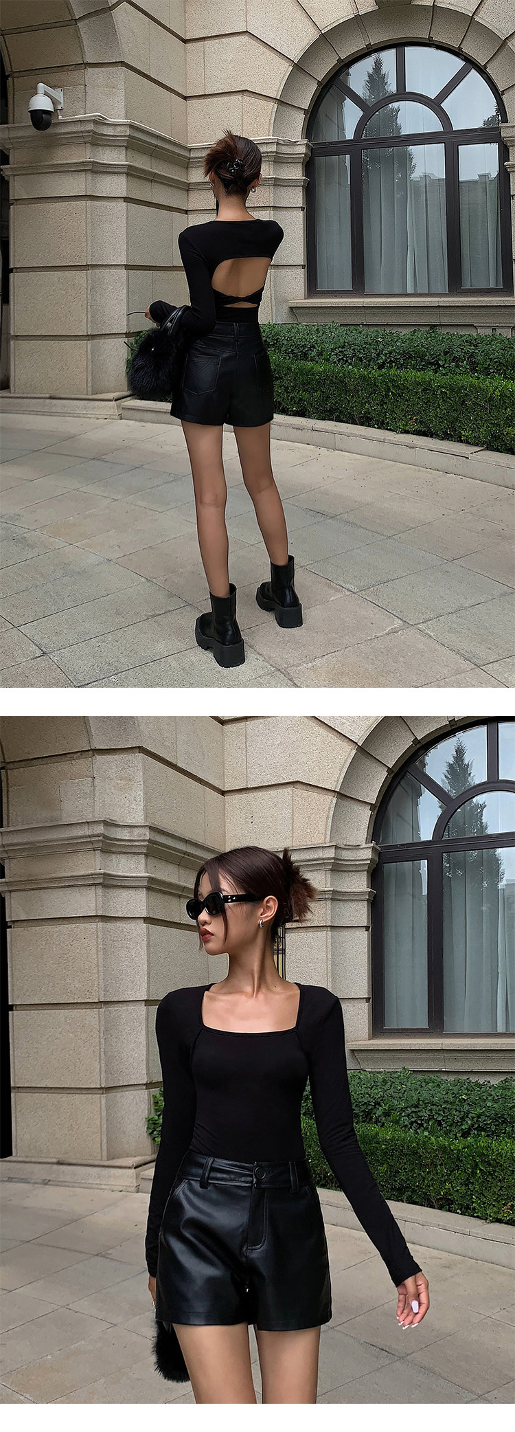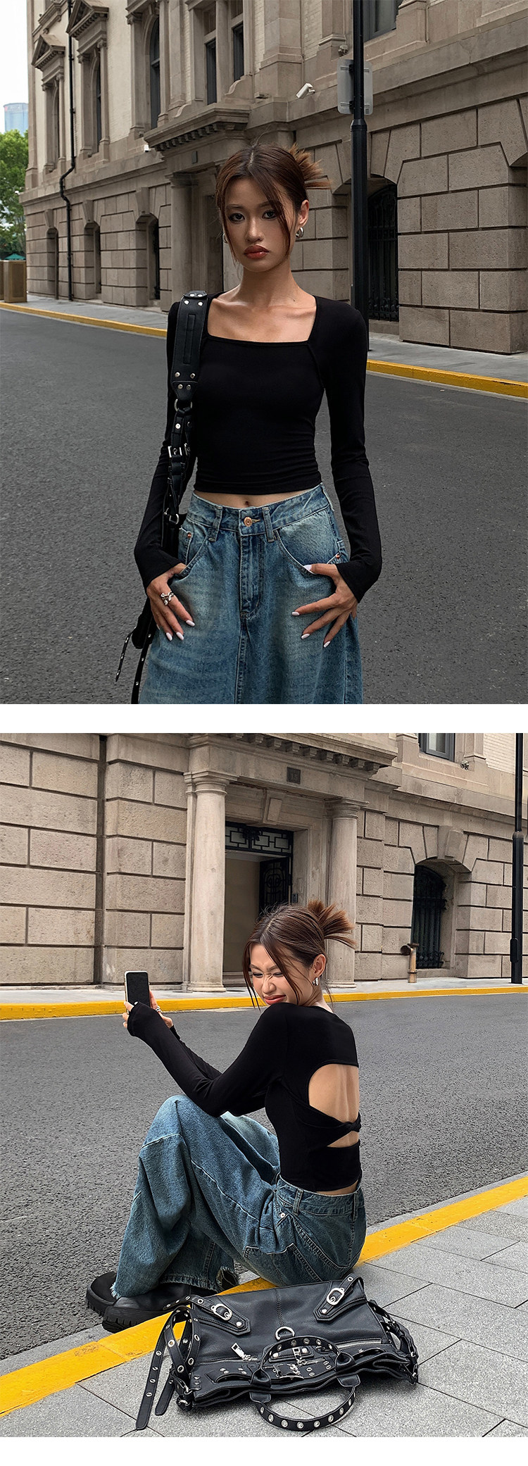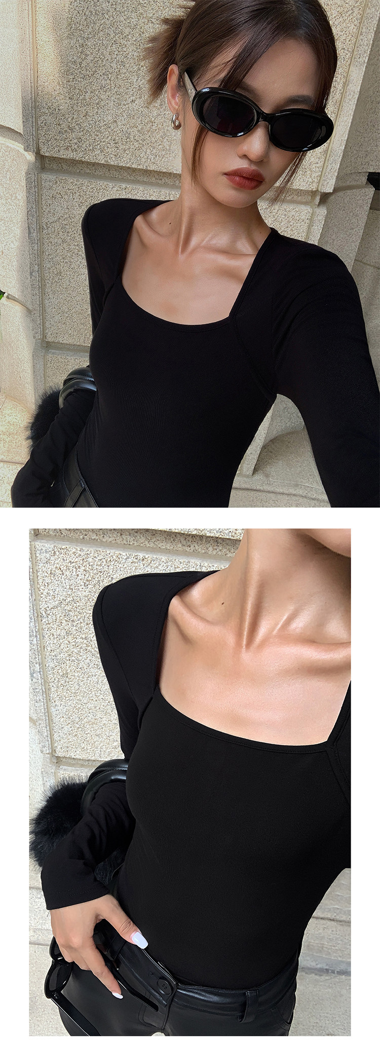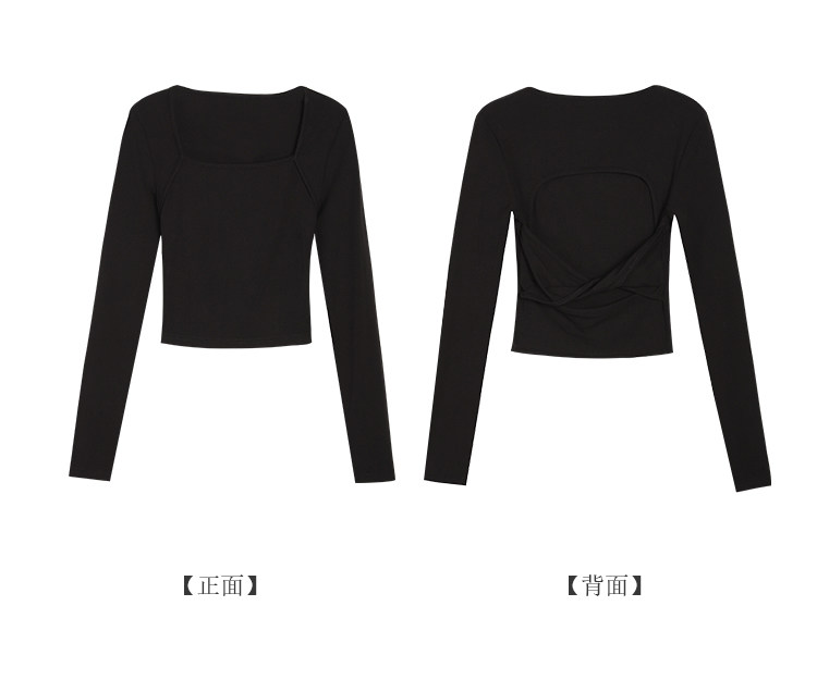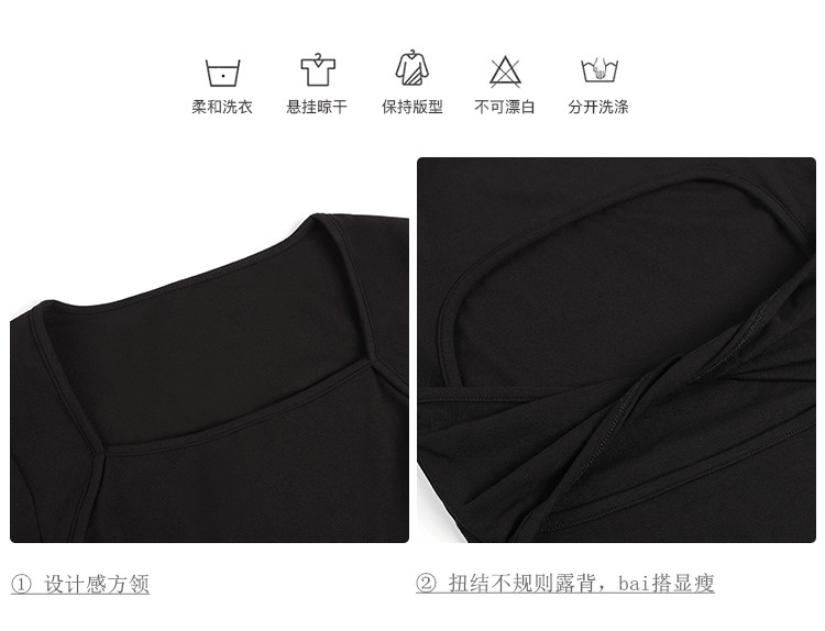 ousph黑色方領針織打底衫女秋秋款露背設計感修身顯瘦長袖T恤上衣