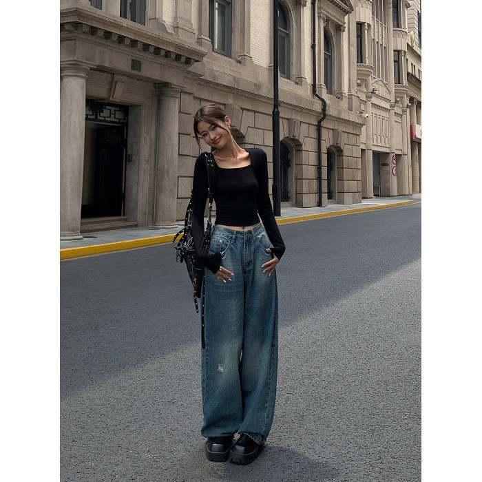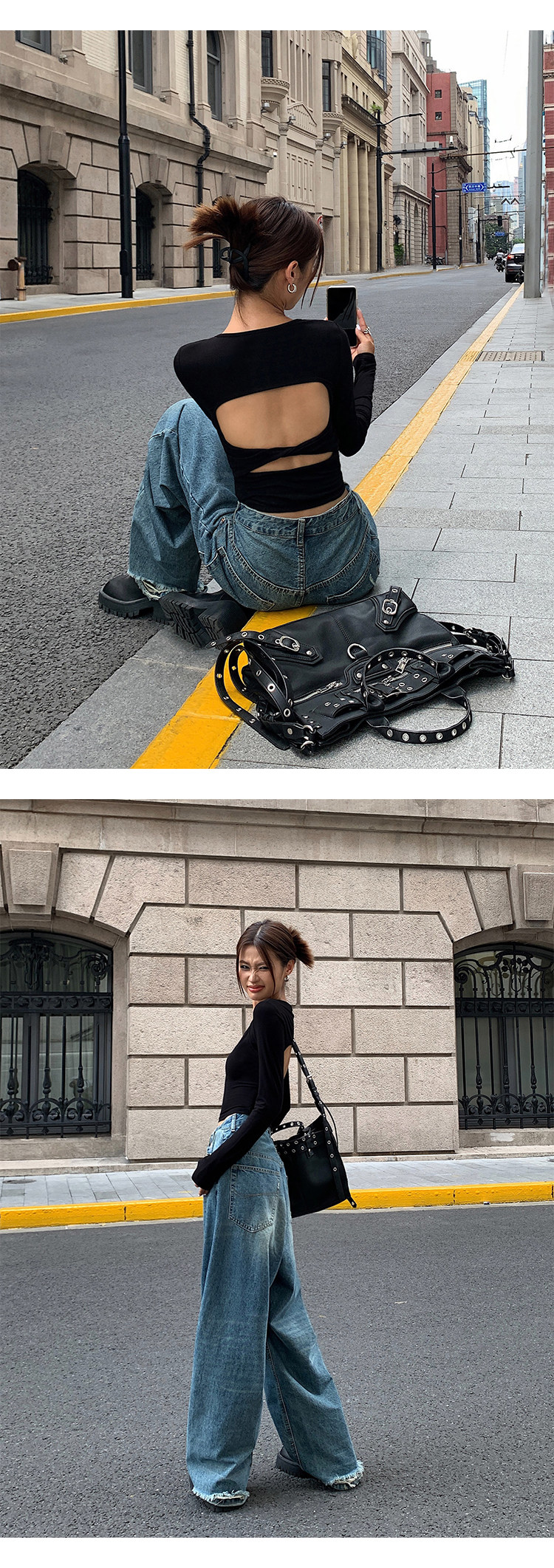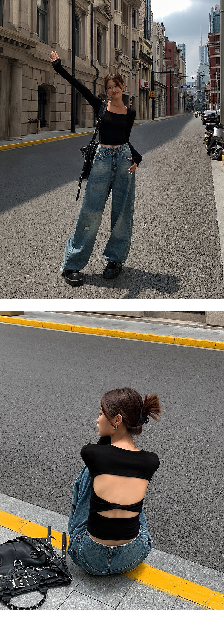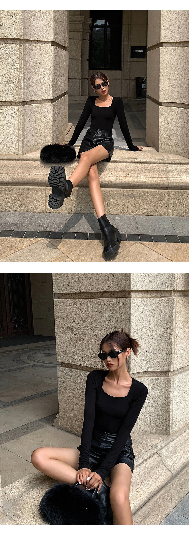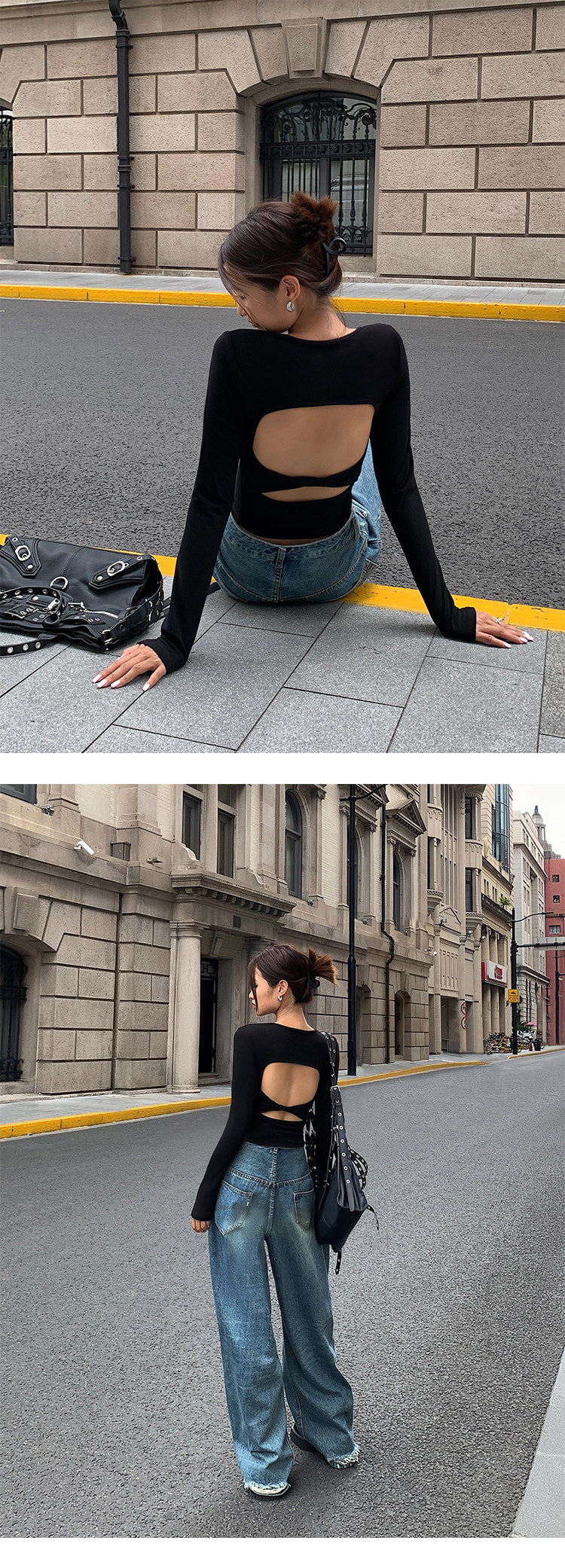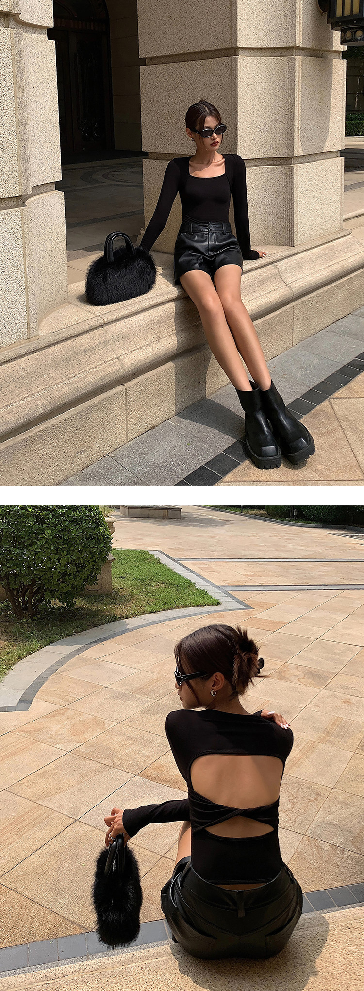 ousph黑色方領針織打底衫女秋秋款露背設計感修身顯瘦長袖T恤上衣