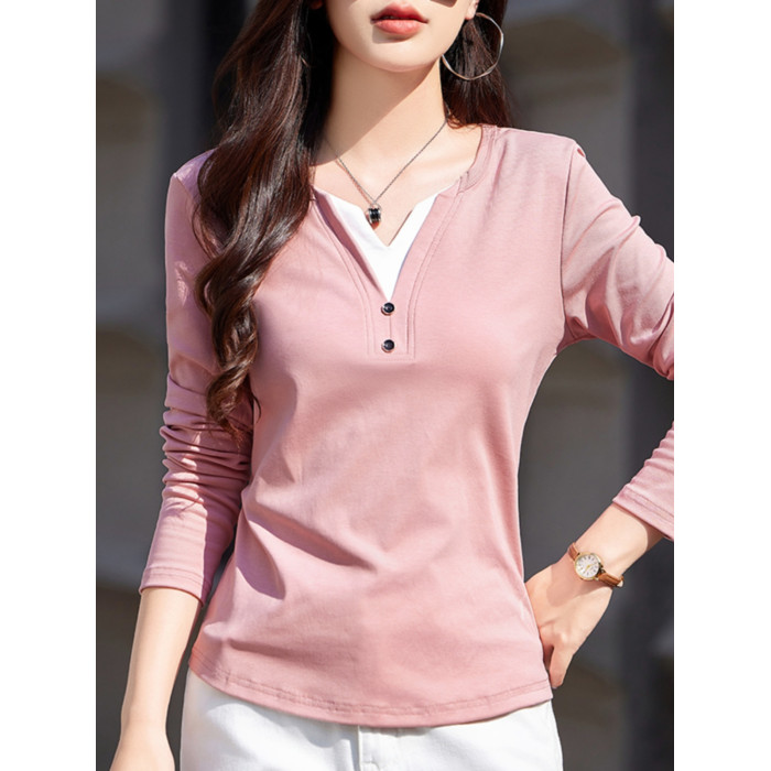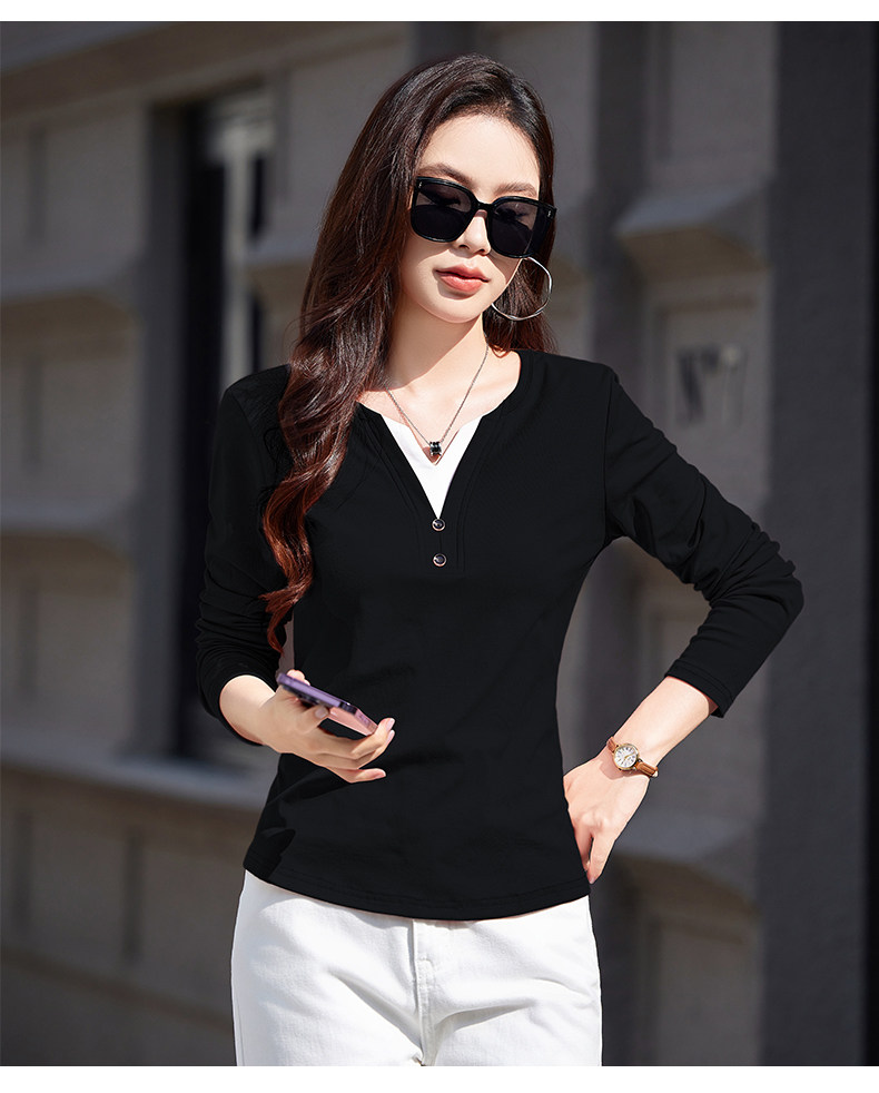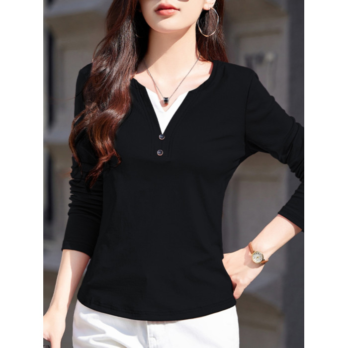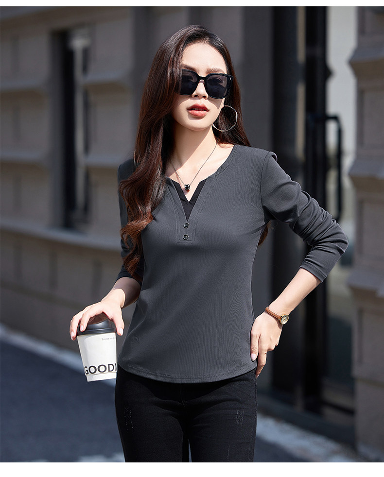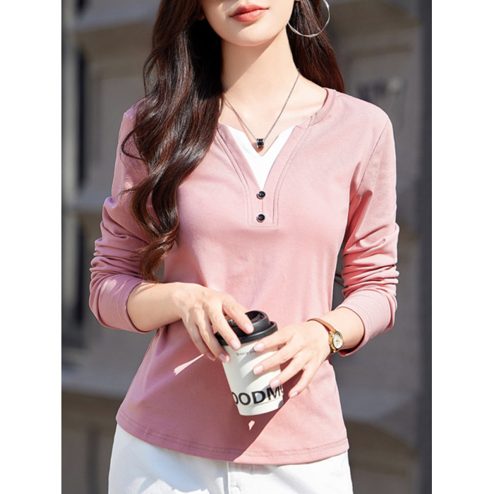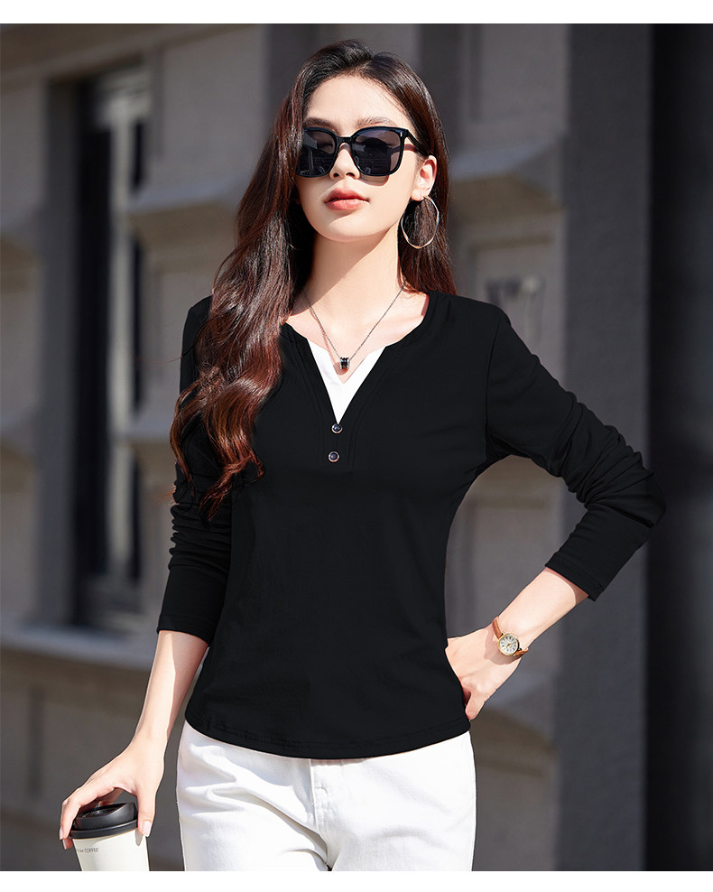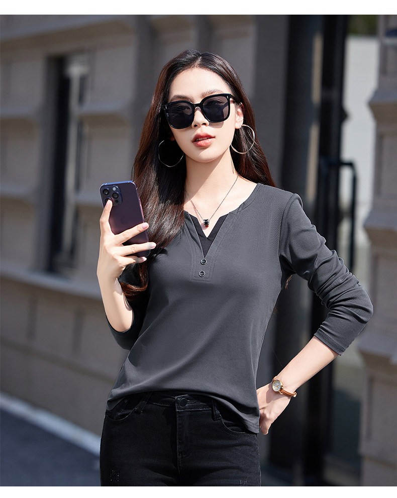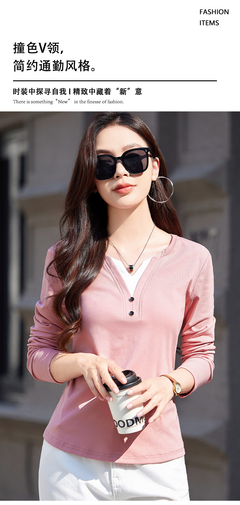 V領拼色正肩長袖t恤女裝秋裝2025新款紐釦拼接百搭上衣內搭打底衫