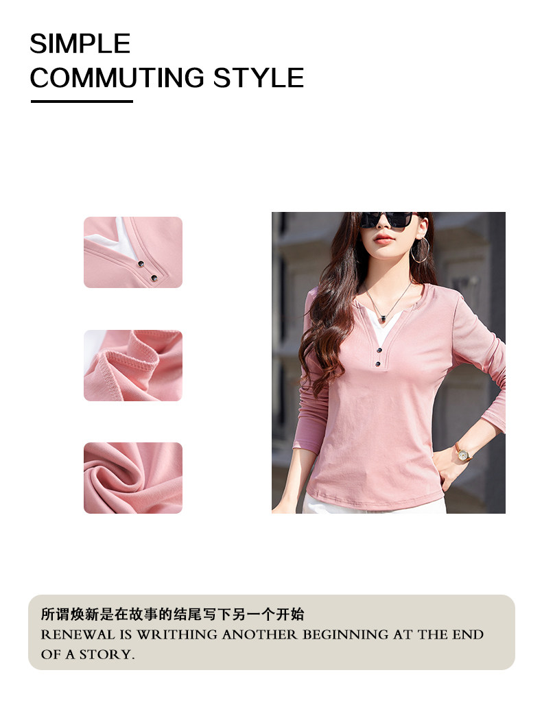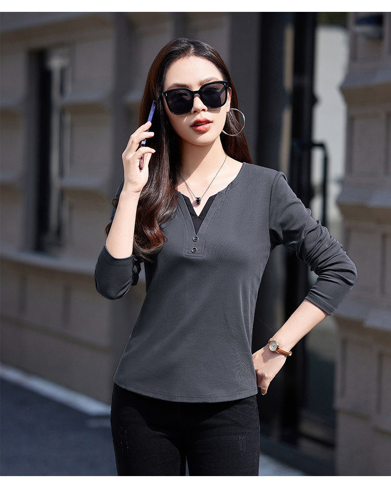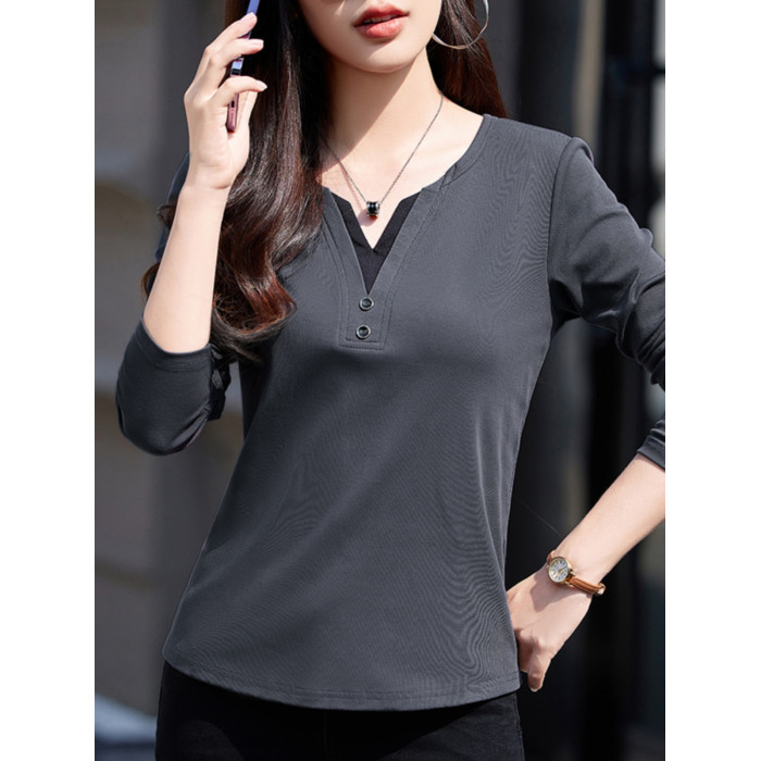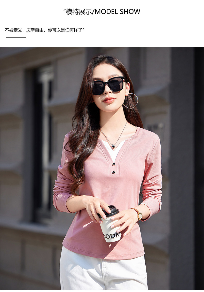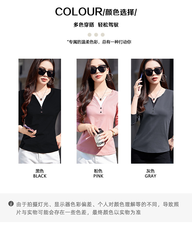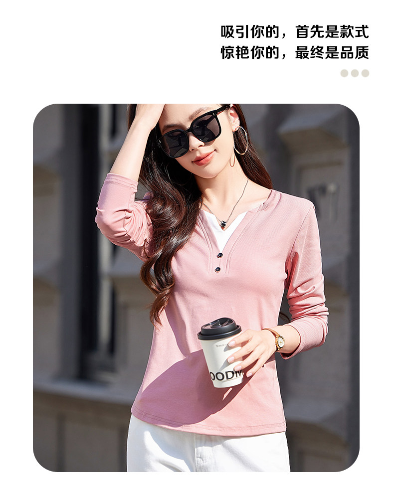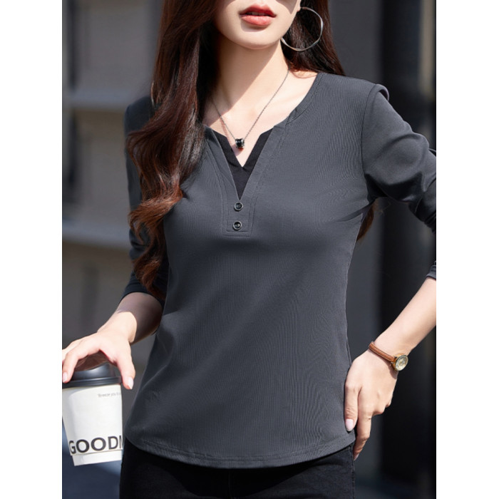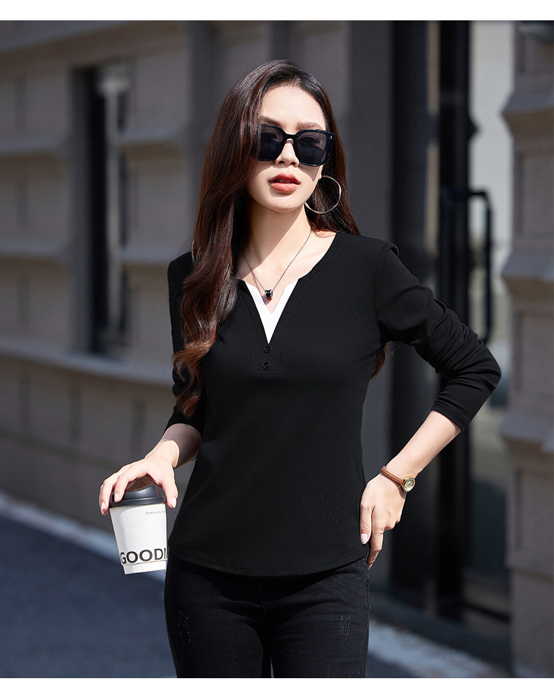 V領拼色正肩長袖t恤女裝秋裝2025新款紐釦拼接百搭上衣內搭打底衫