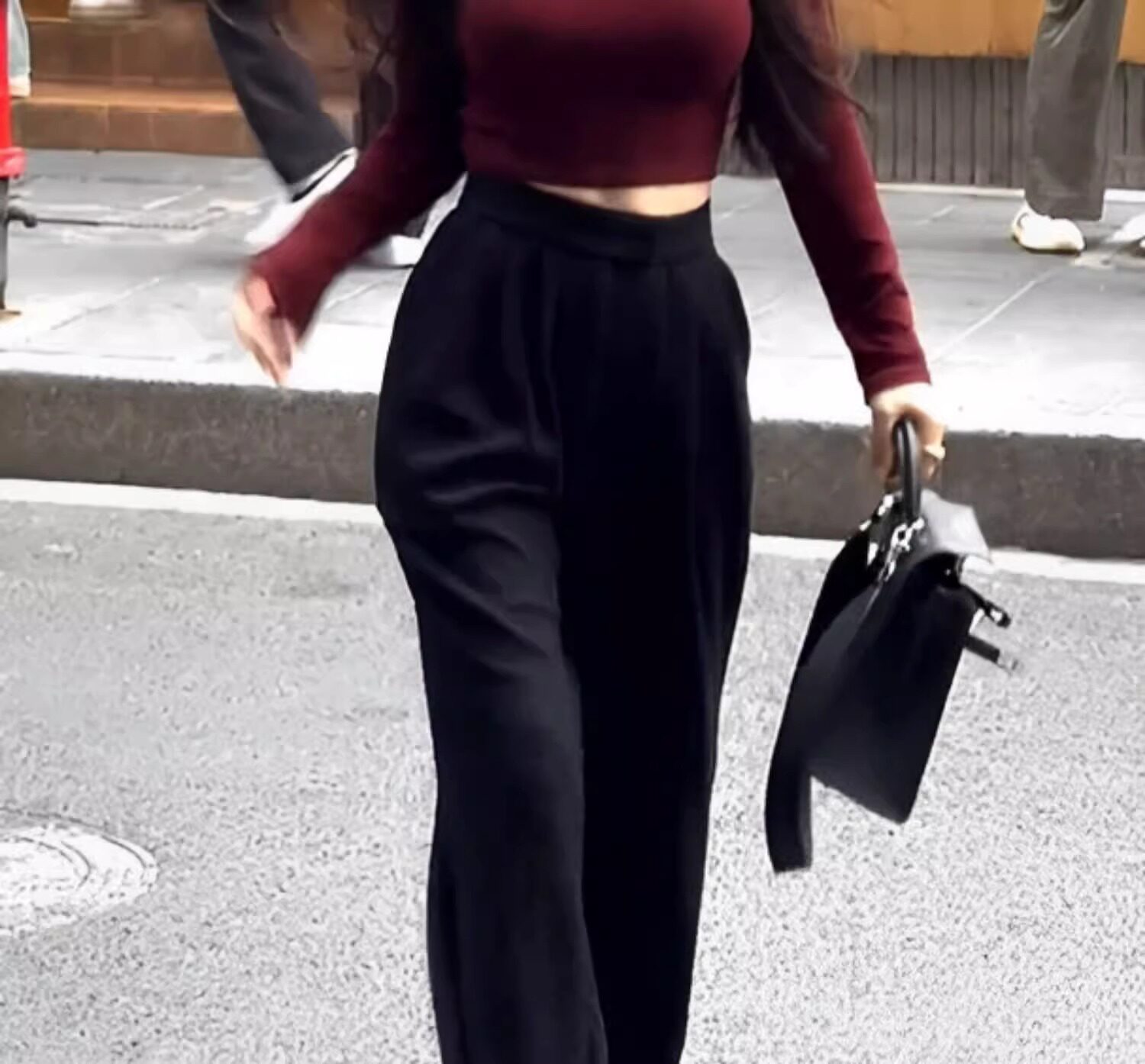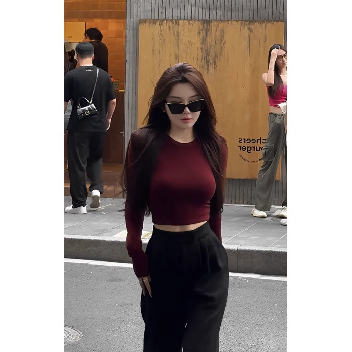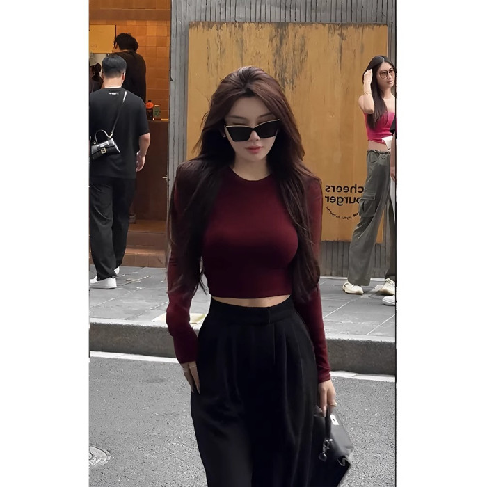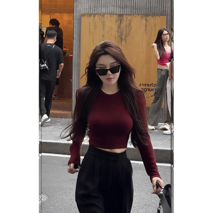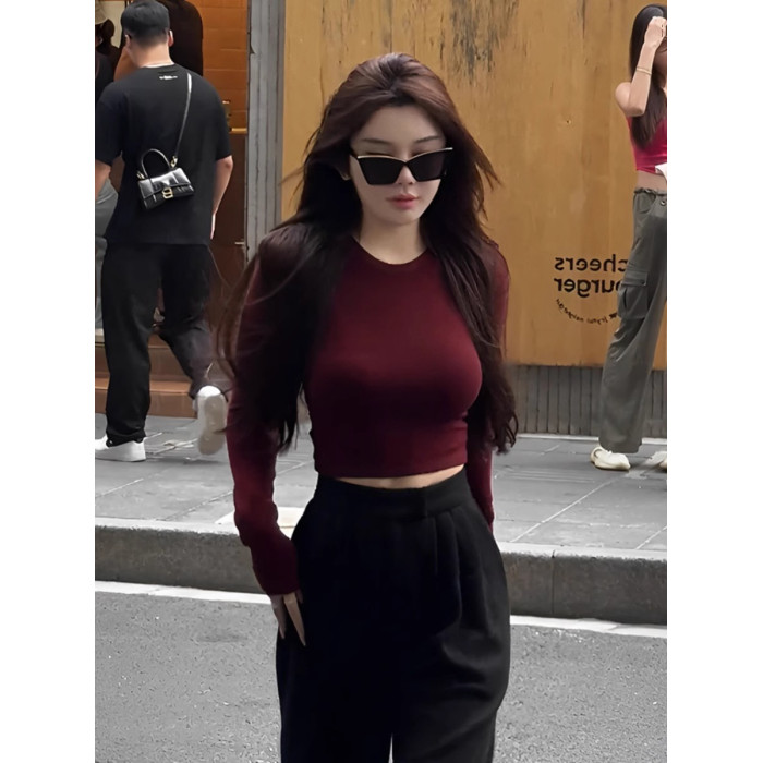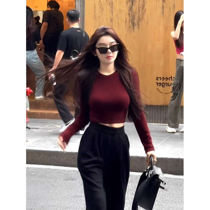 港風復古酒紅色內搭打底衫女洋氣圓領螺紋緊身T恤高腰露臍上衣春