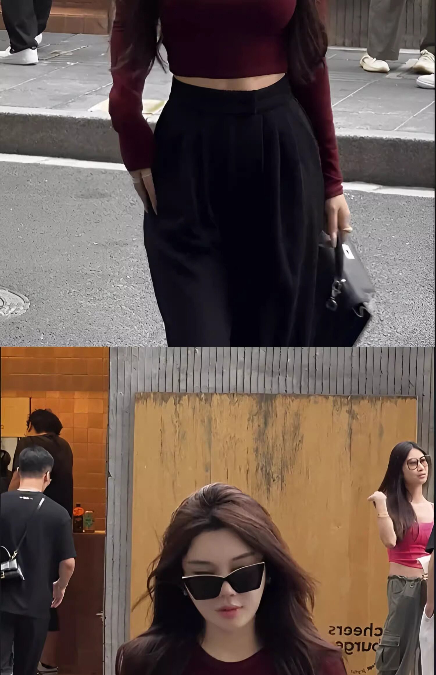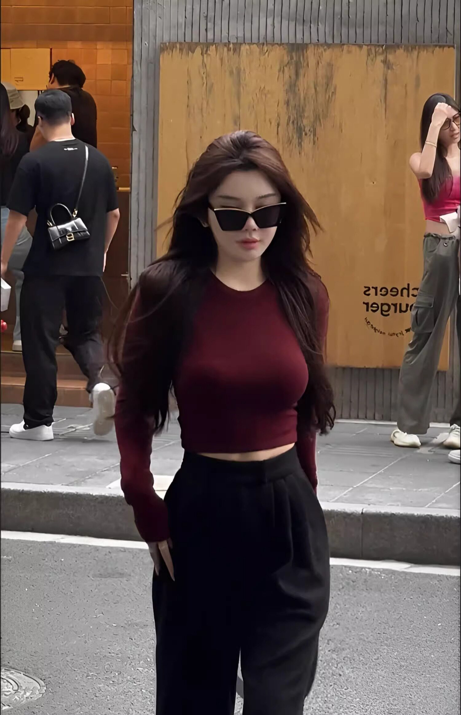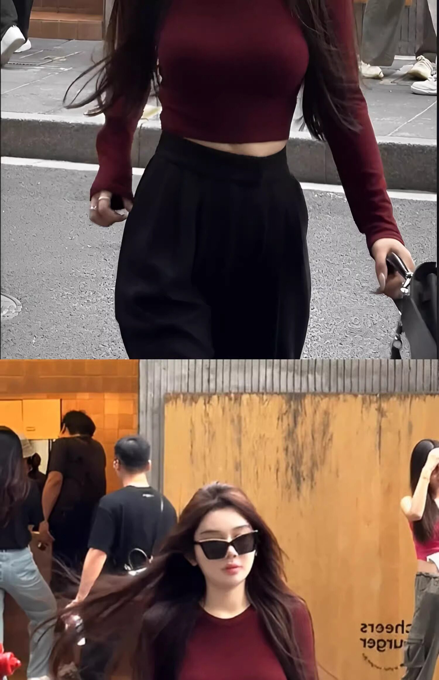 港風復古酒紅色內搭打底衫女洋氣圓領螺紋緊身T恤高腰露臍上衣春