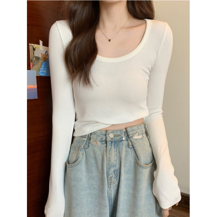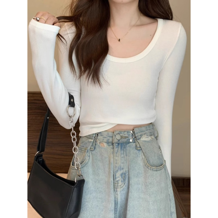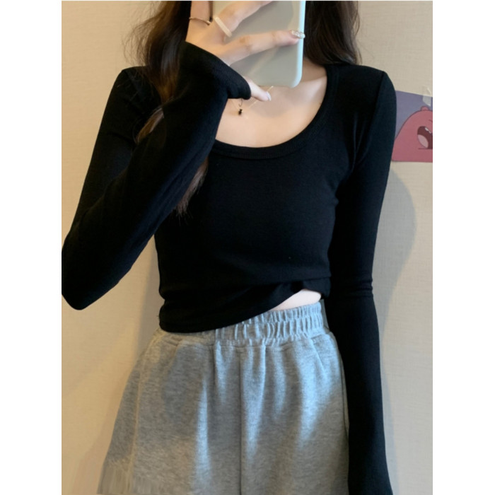 長袖t恤女2025低領百搭秋冬季螺紋棉正肩緊身U領打底衫磨毛上衣女