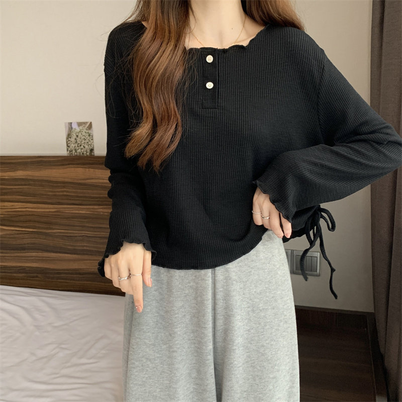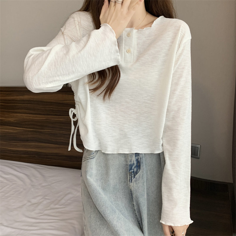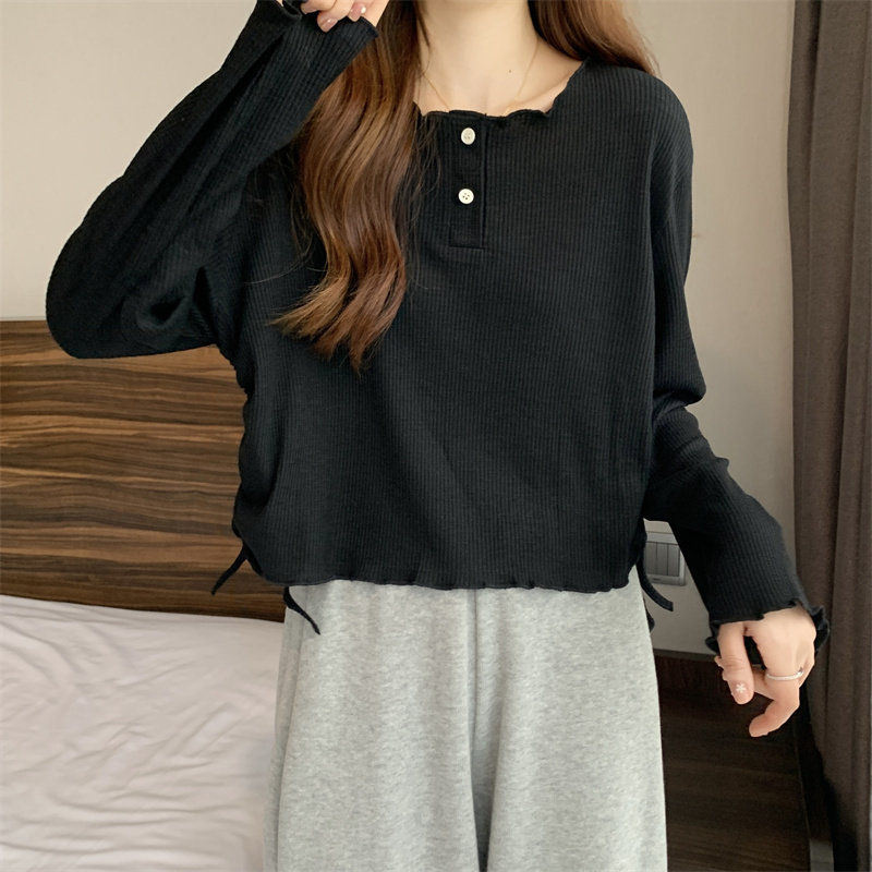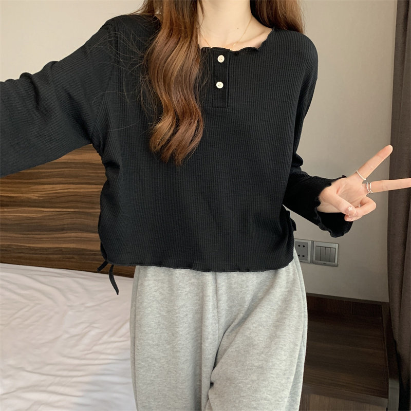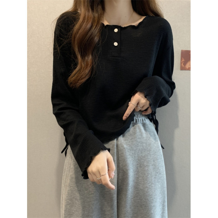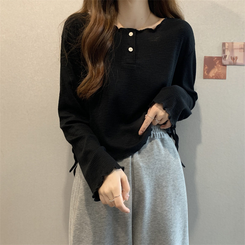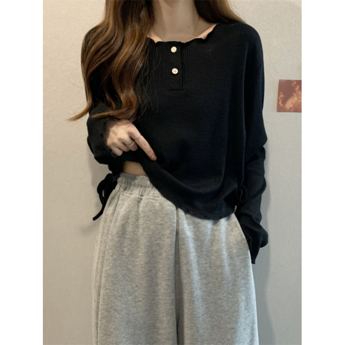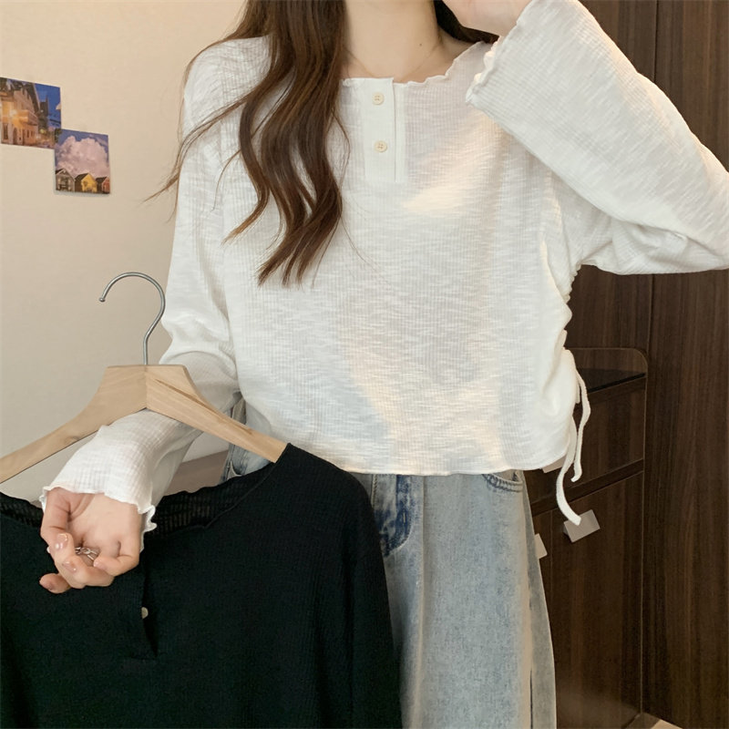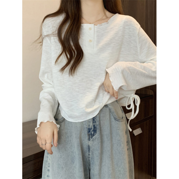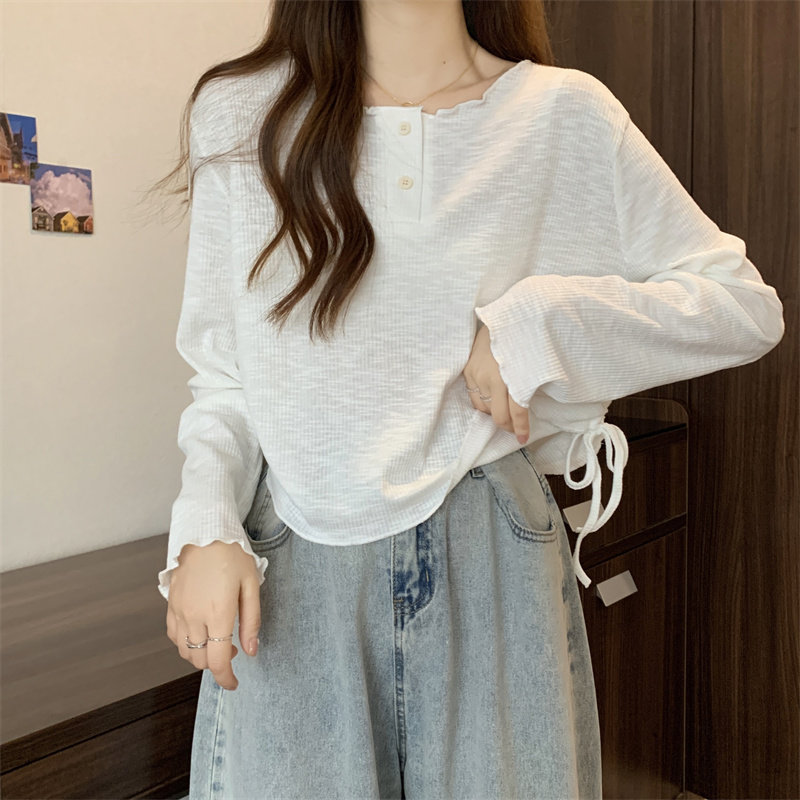 韓版圓領不規則系帶長袖T恤女2024新款早秋大碼胖mm小衆別致上衣