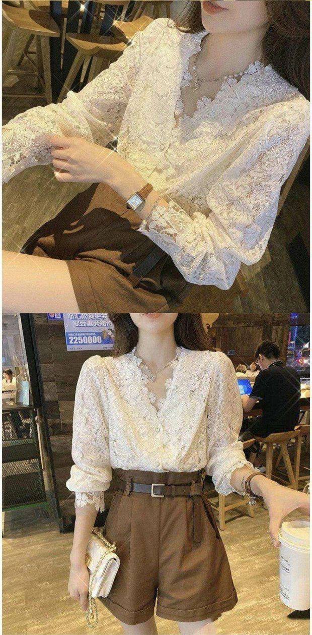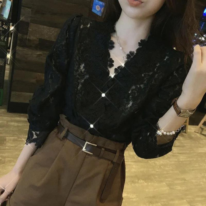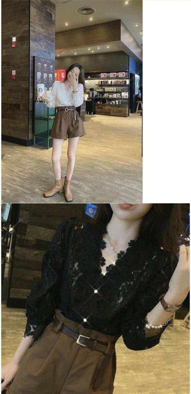 加肥加大碼女裝胖妹妹洋氣寬松蕾絲t恤打底衫百搭顯瘦長袖v領上衣