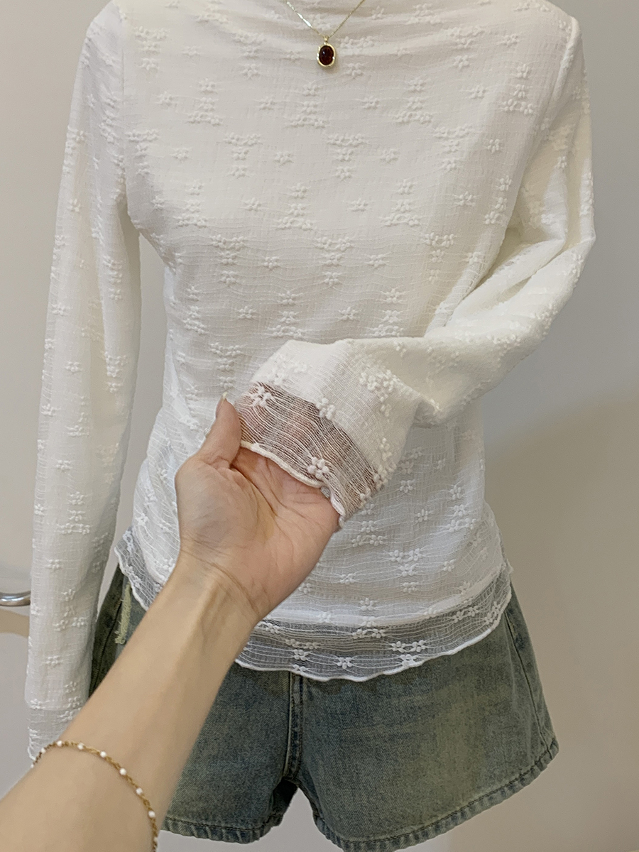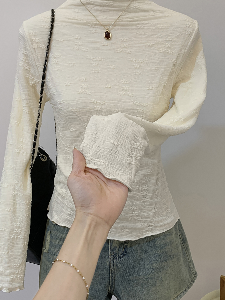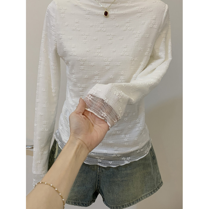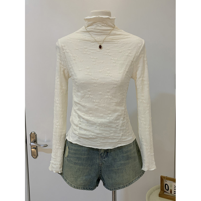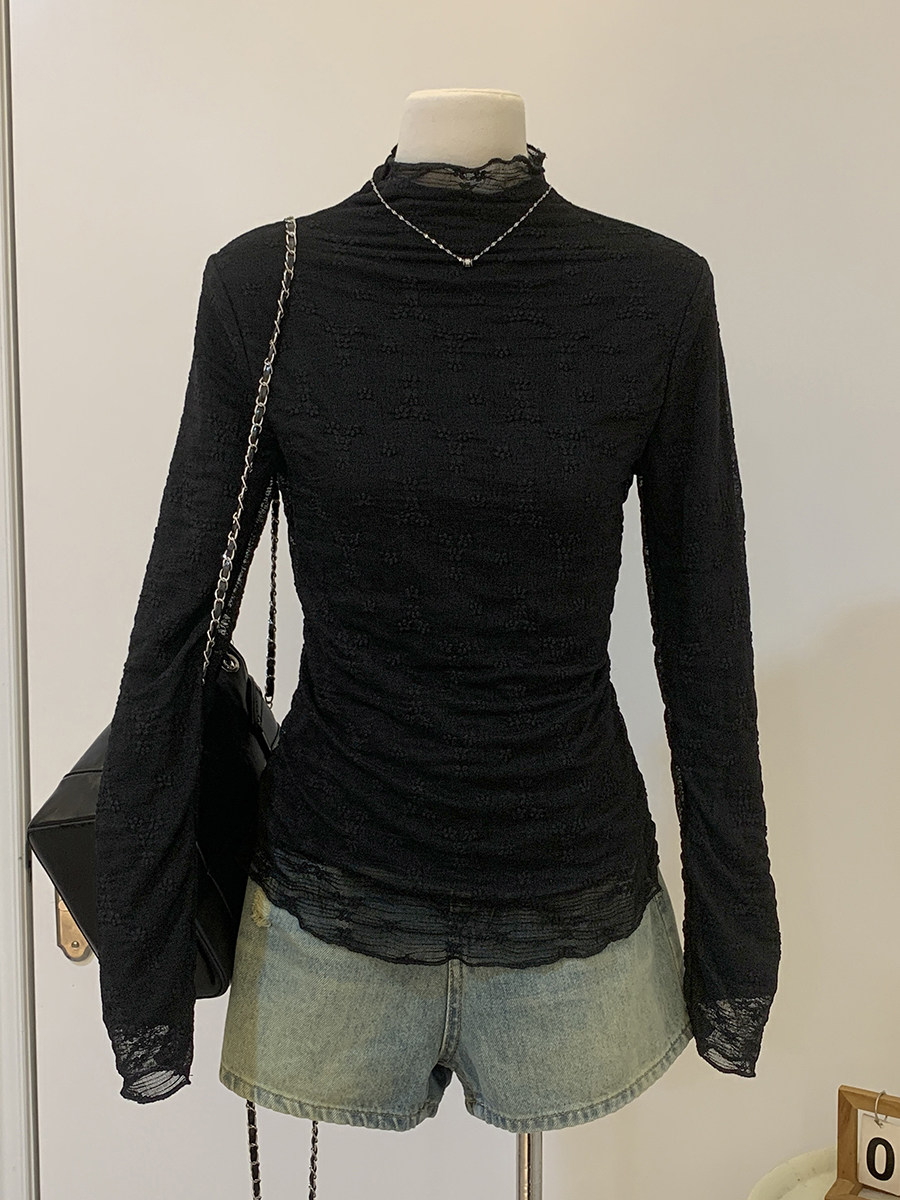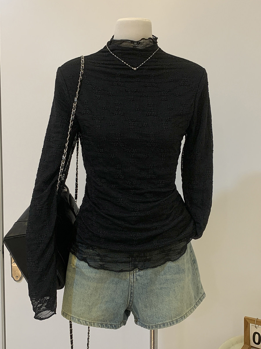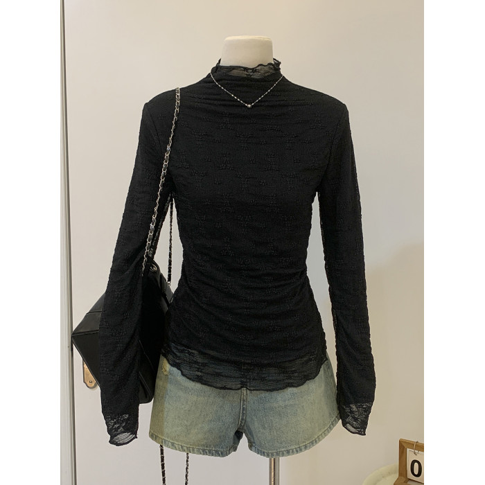 法式蕾絲加絨加厚半高領打底衫女內搭2025秋冬木耳邊長袖t恤上衣