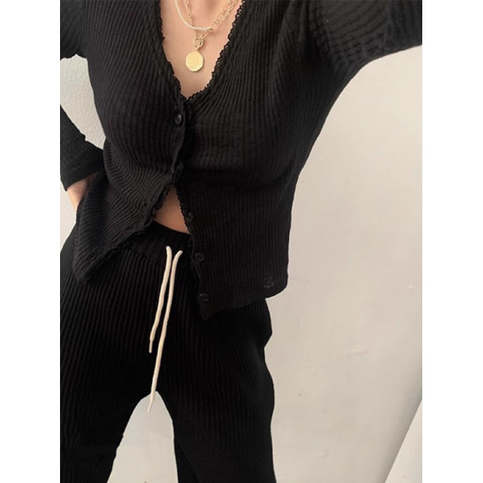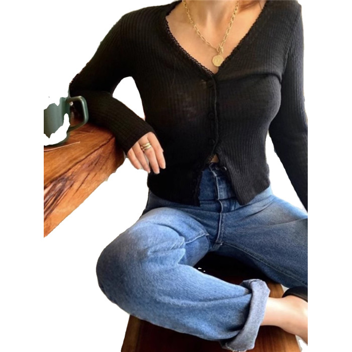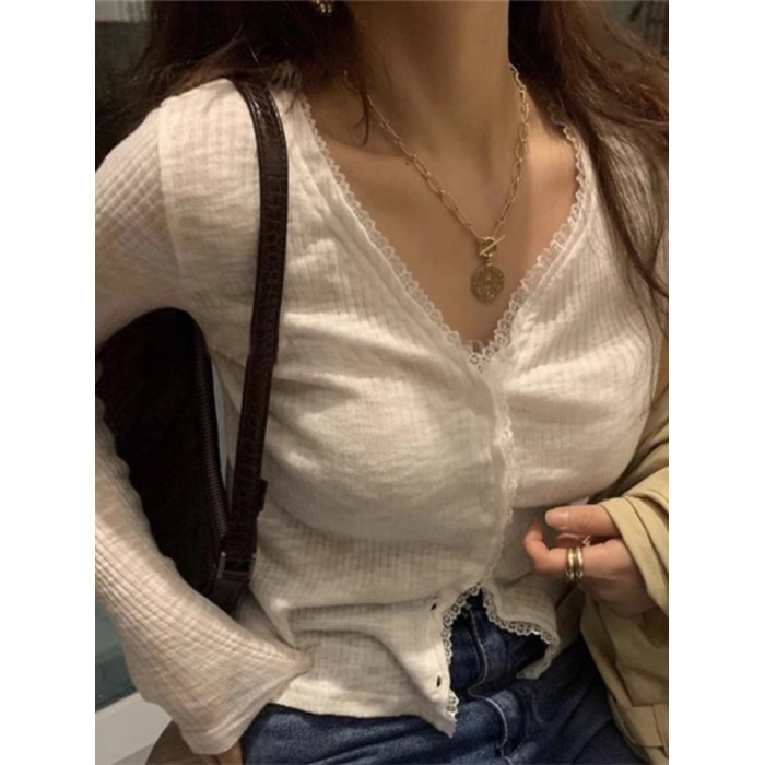 豬歐尼 韓國東大門秋季氣質溫柔蕾絲拼接V領長袖打底衫上衣女